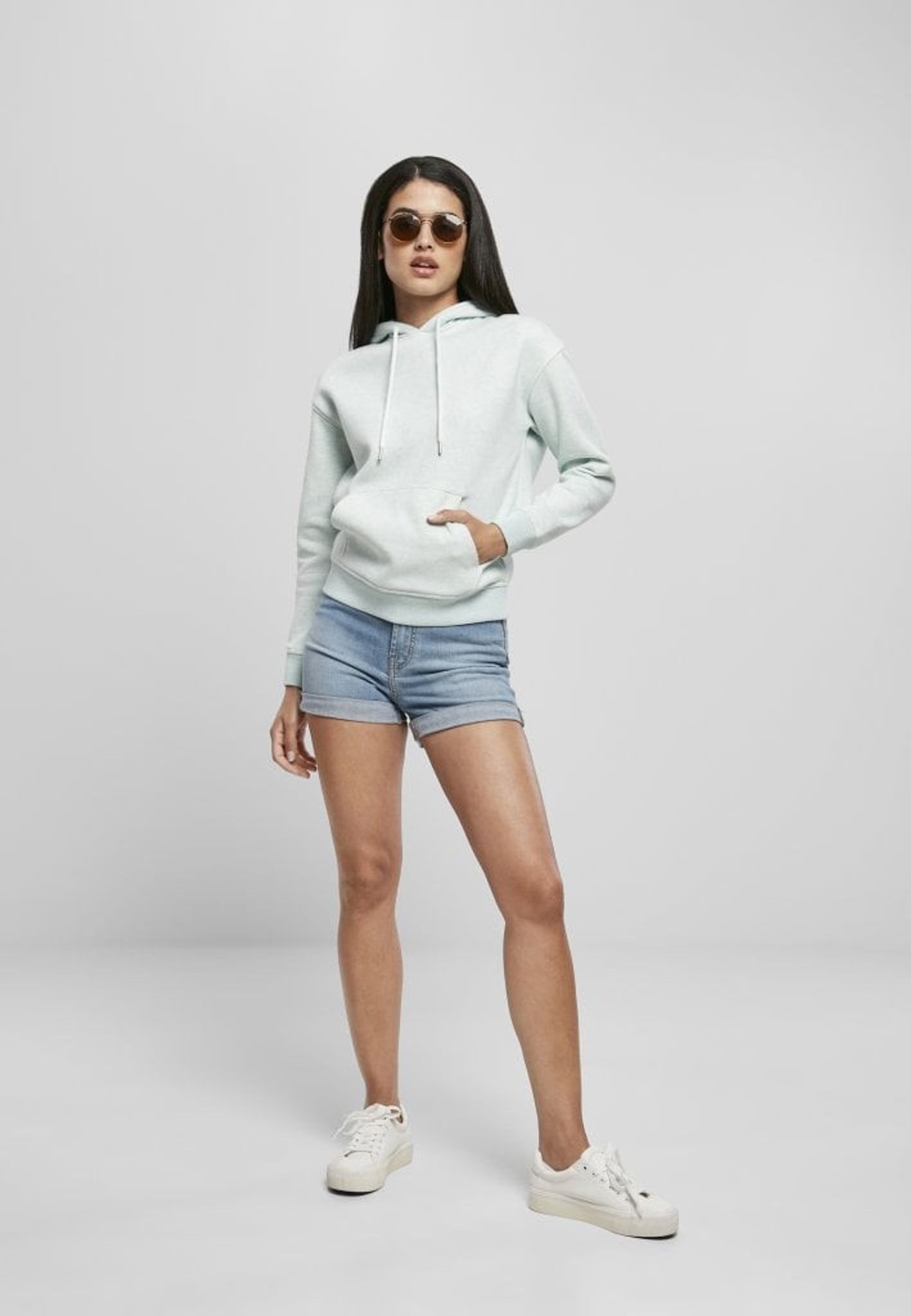 Hoodien är bred upptill med nedhasade armar.