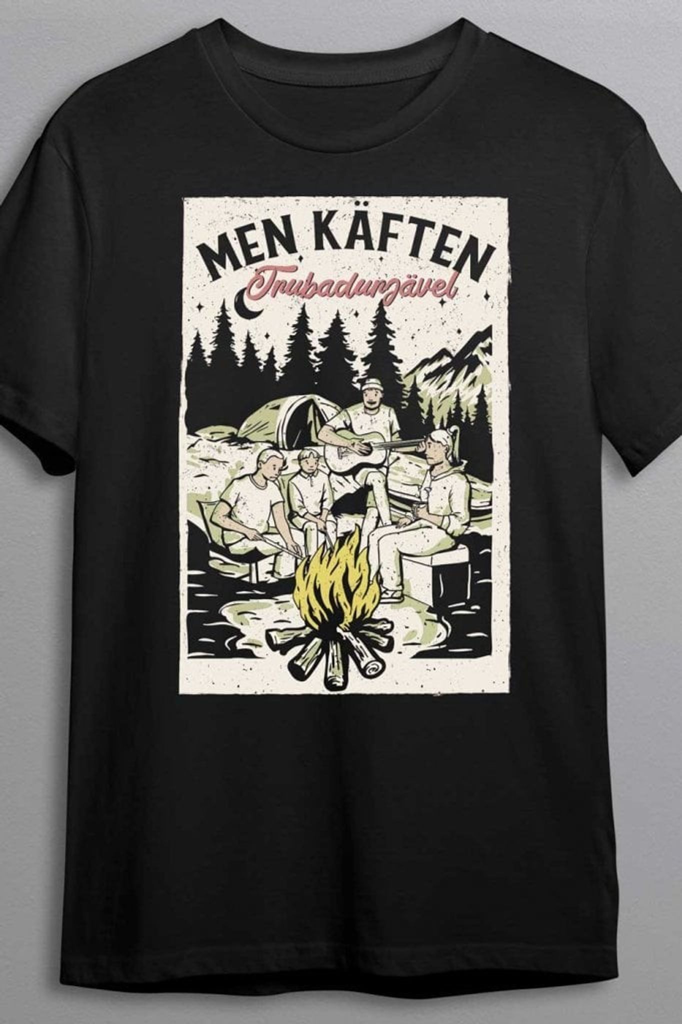 Denna T-shirt är för dig som uppskattar den där klassiska campingkvällen – förutom när någon drar fram gitarren och börjar spela ännu en cover på Wonderwall. Med det humoristiska trycket "Men Käften, Trubadurjävel" fångas känslan av vänner som försöker njuta av lugnet runt lägerelden, innan trubaduren oväntat dyker upp.