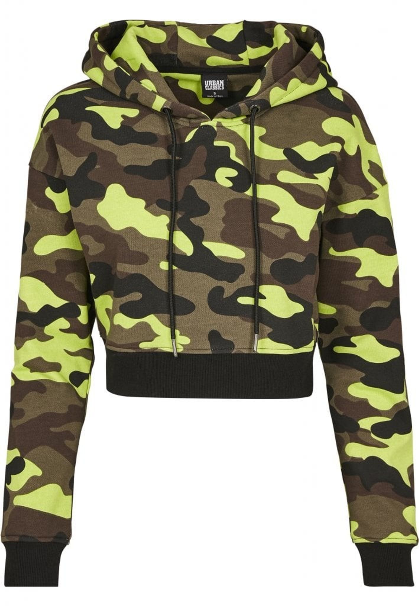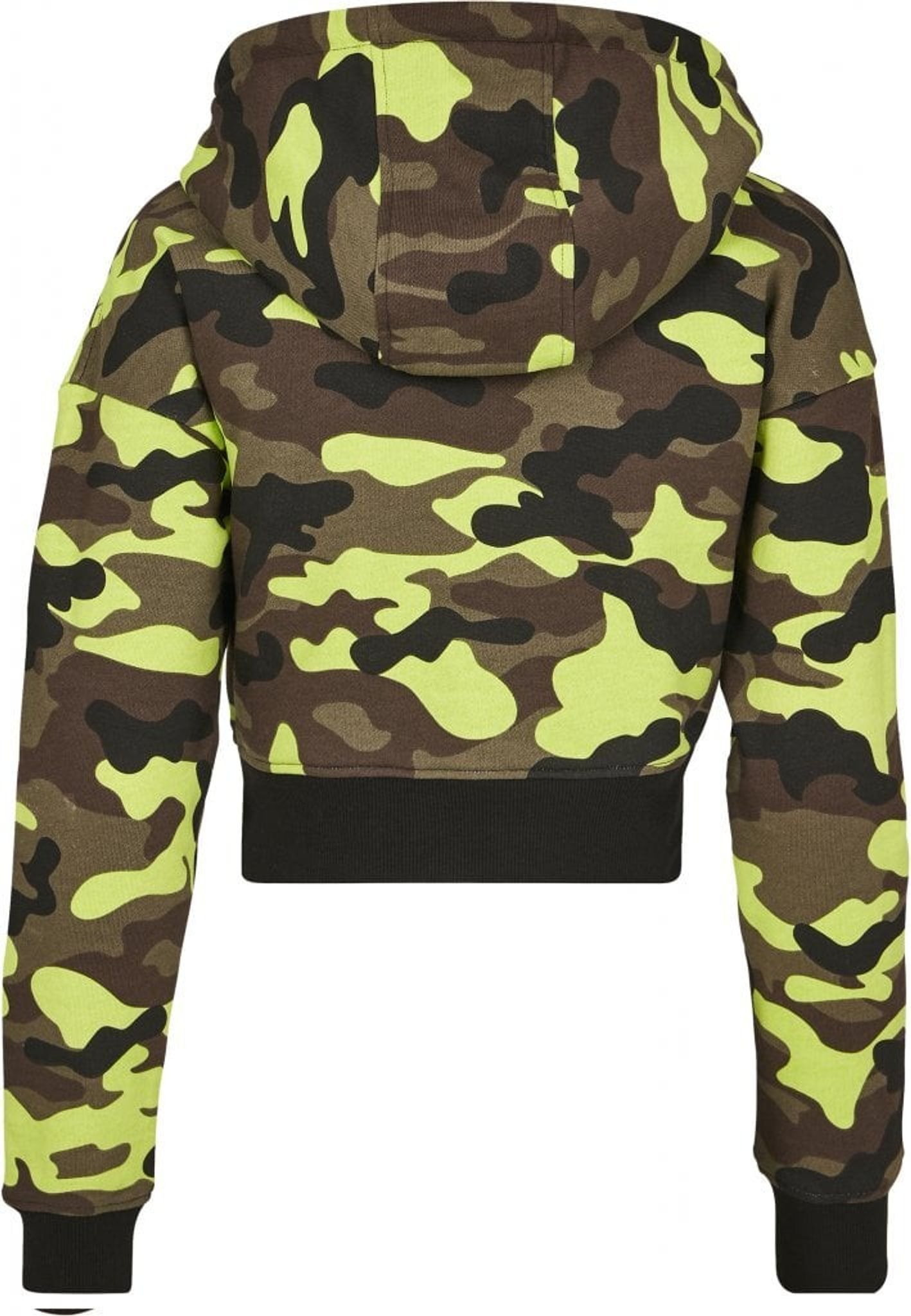 En huvtröja med gult och brunt camotryck som är midjekort. Nertill på hoodien och i armsluten är det en svart bred reså och huvan har en svart dragsko.