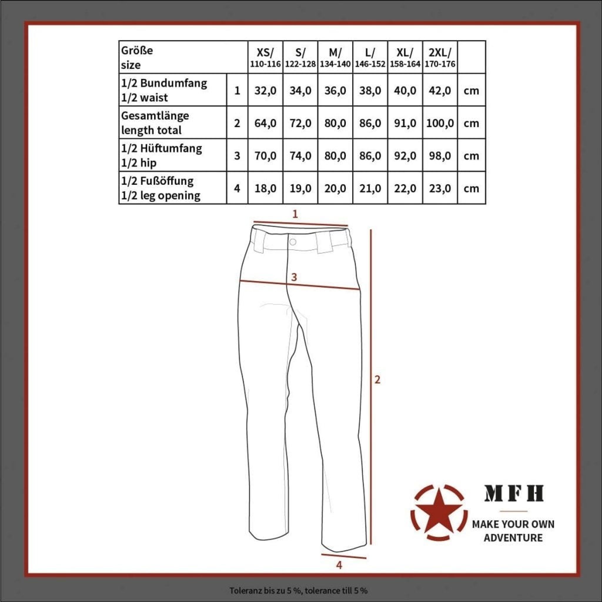 Byxorna har två byxfickor, två benfickor samt två höftfickor.