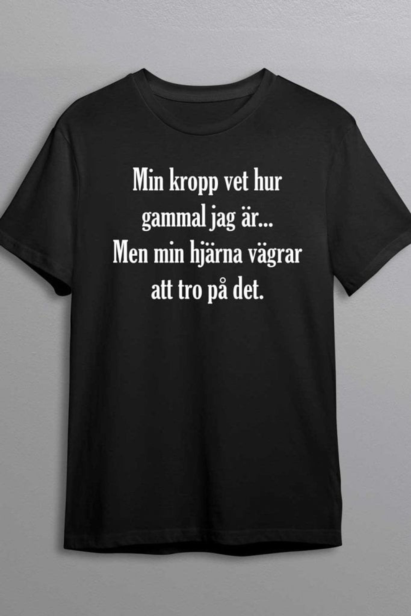 Min kropp vet hur gammal jag är... Men min hjärna vägrar att tro på det.": Denna är för de unga i sinnet som aldrig låter ålder definiera dem. En T-shirt som passar perfekt för den eviga ungdomen som skrattar åt åldersrelaterade vitsar och lever livet fullt ut, oavsett vad födelseattesten säger.
