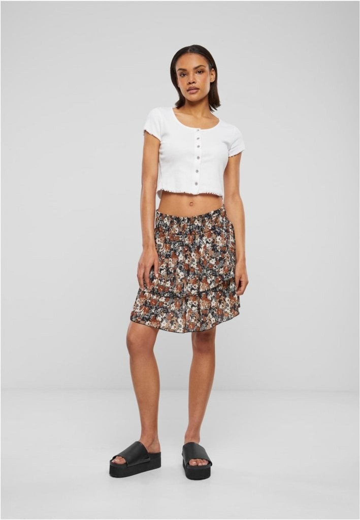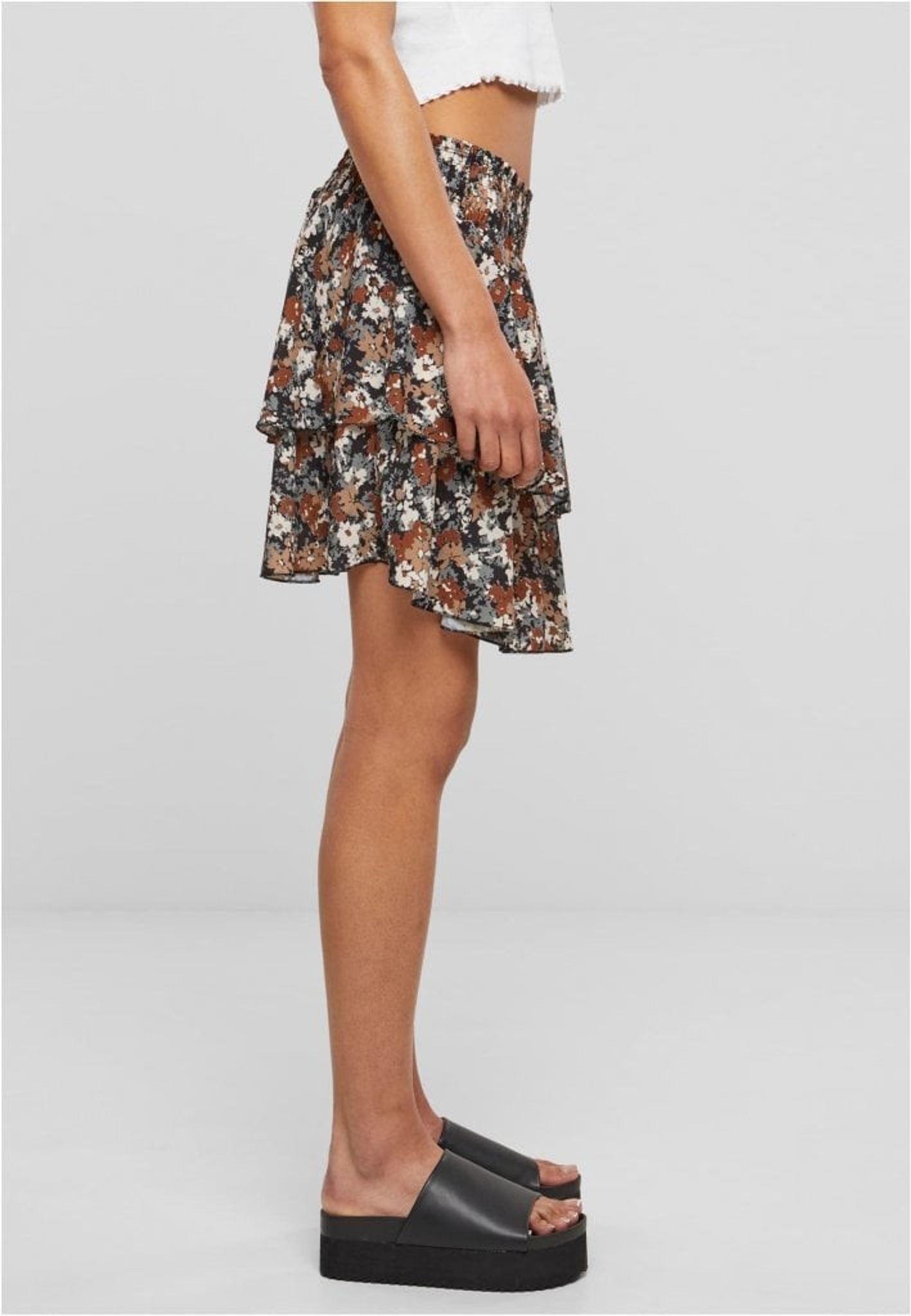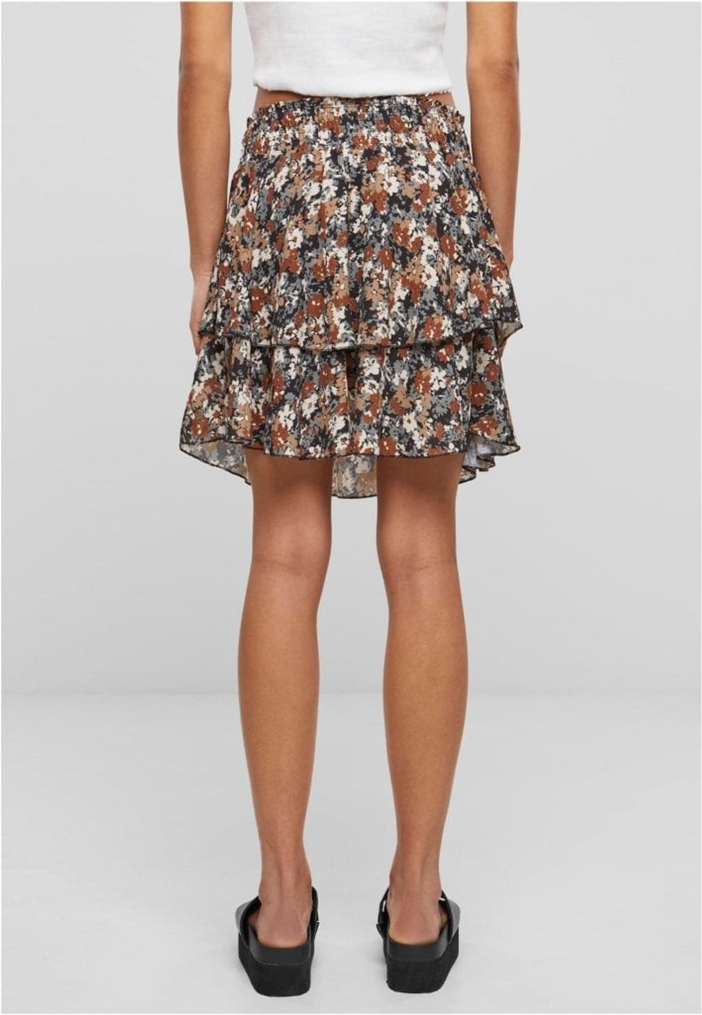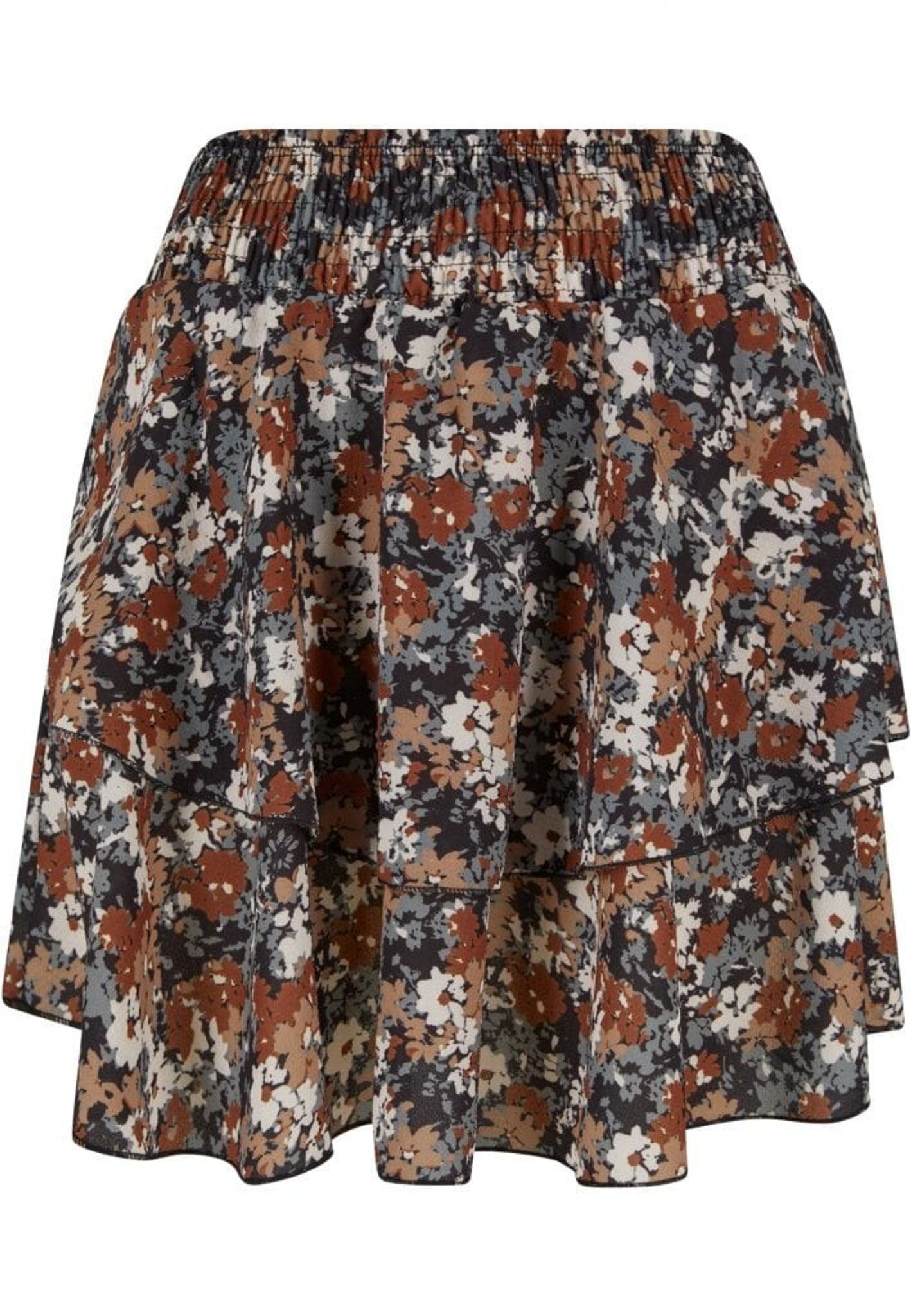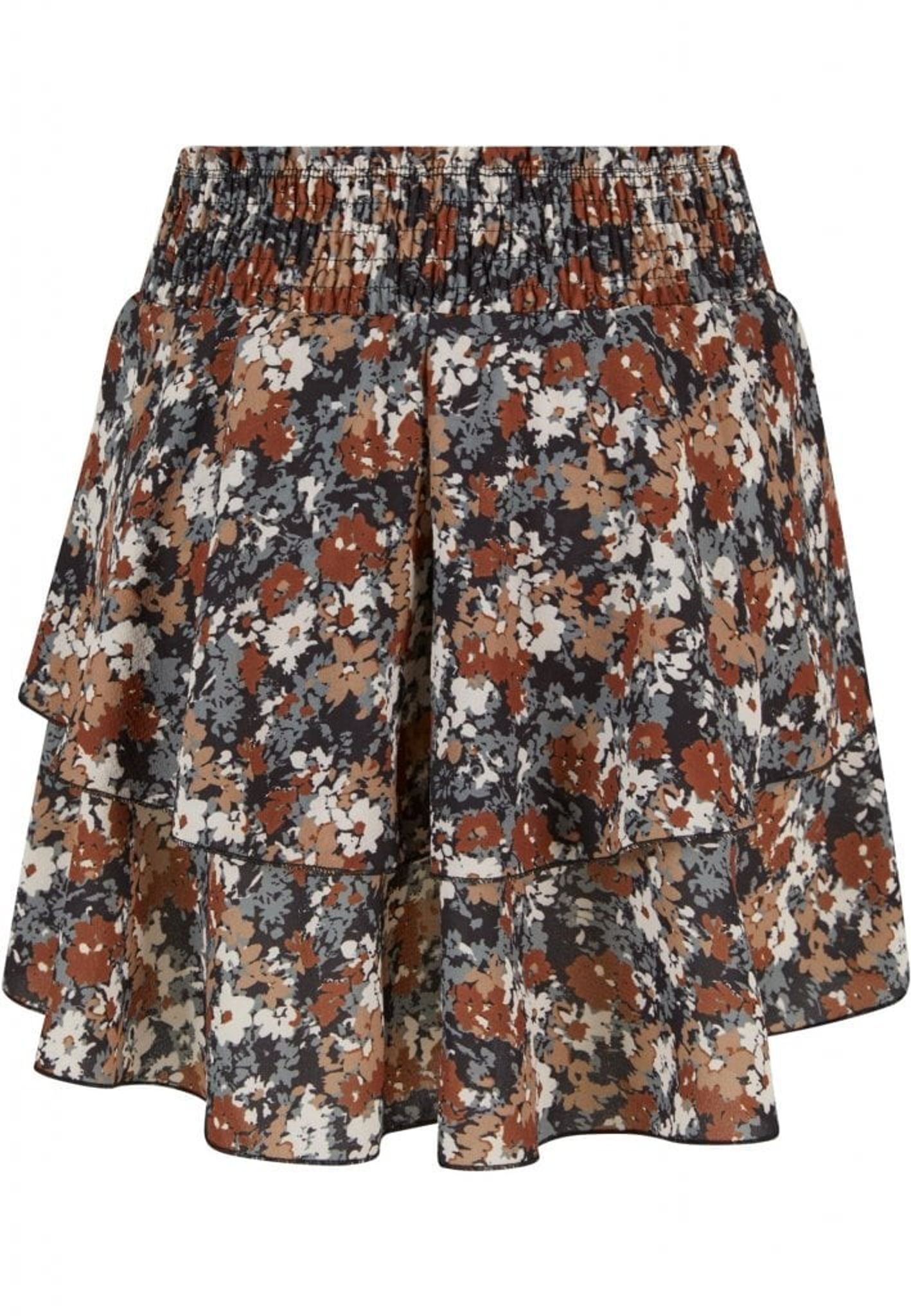 Denna charmiga mini kjol är en fräsch och flörtig tillägg till din vår- och sommargarderob. Kjolen är designad i ett dubbellagrat utförande som skapar en lekfull och rörlig silhuett, vilket lägger till en ungdomlig och lättsam känsla till din look. Det övre lagret är smyckat med ett utsökt blomtryck i en harmonisk färgpalett av jordnära toner, vilket ger en naturlig och feminin touch.