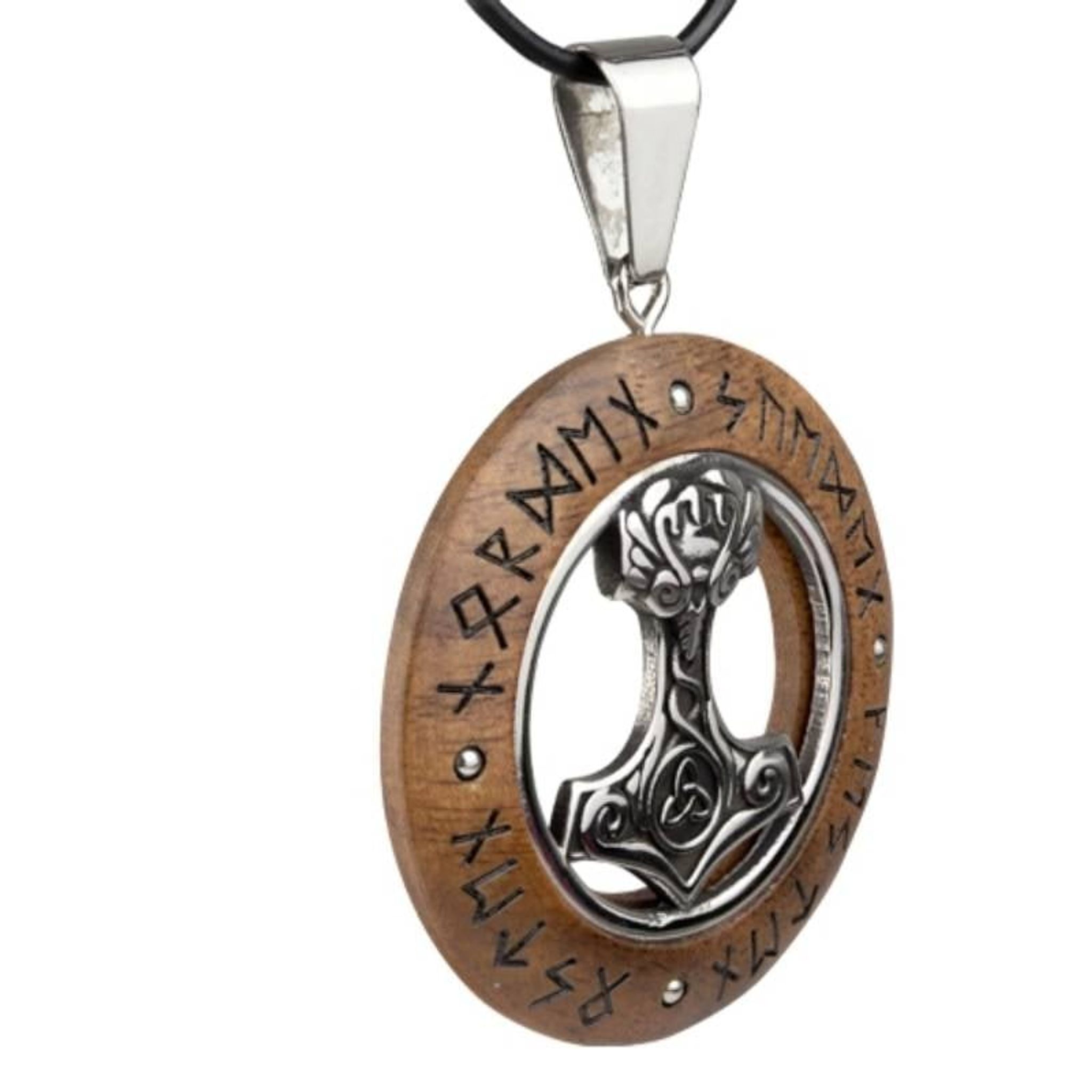 Tors magiska hammare mjölner omringad av en cirkel i valnötsträ.