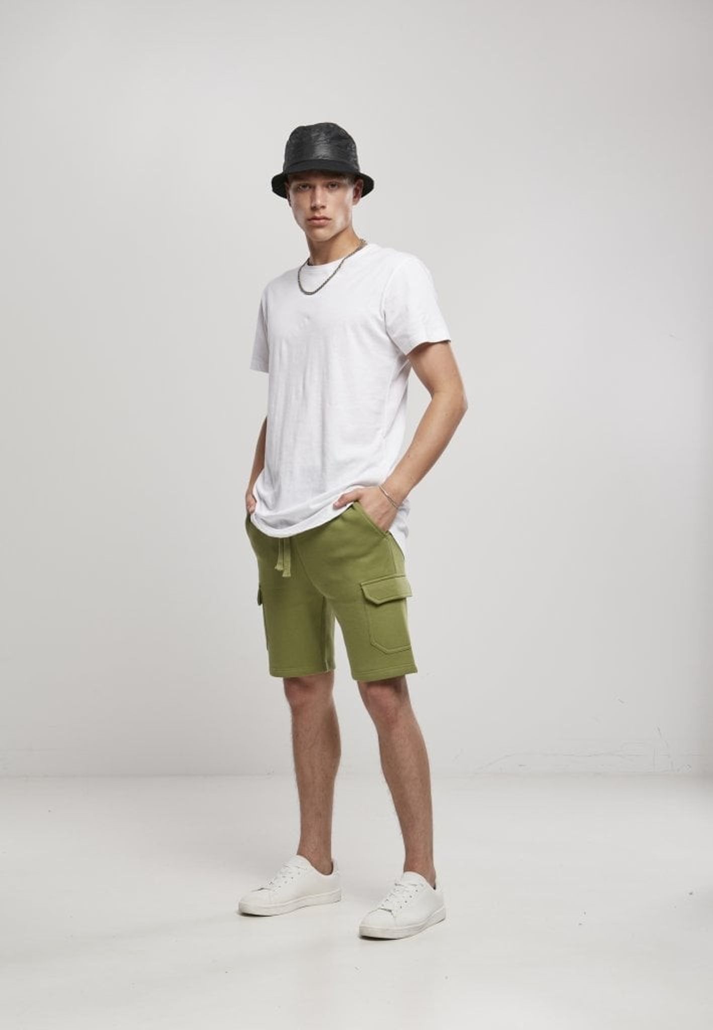 Ett par mjukishorts tillverkade i ekologisk bomull med benfickor och sidfickor.