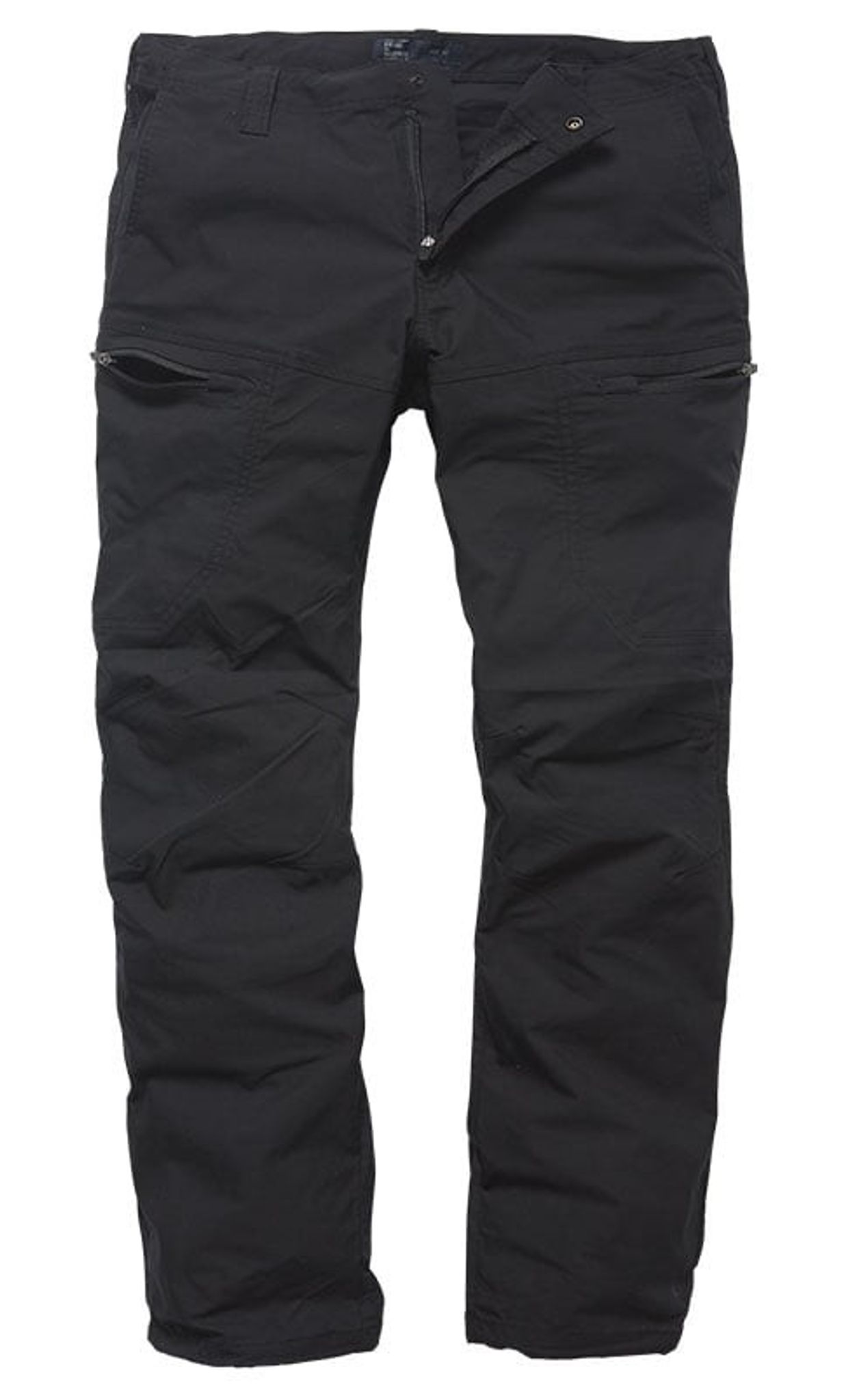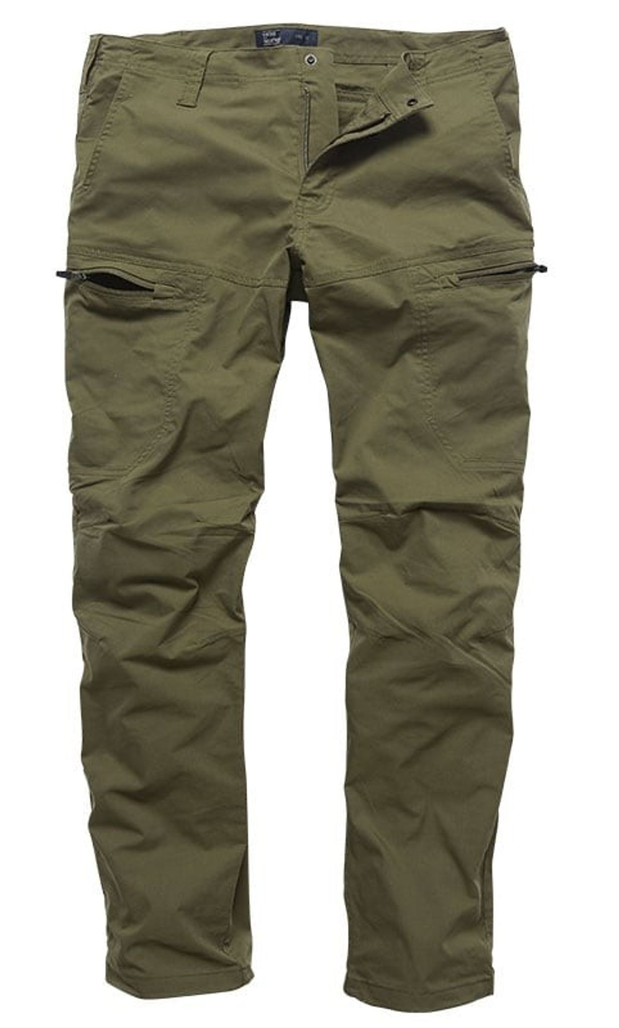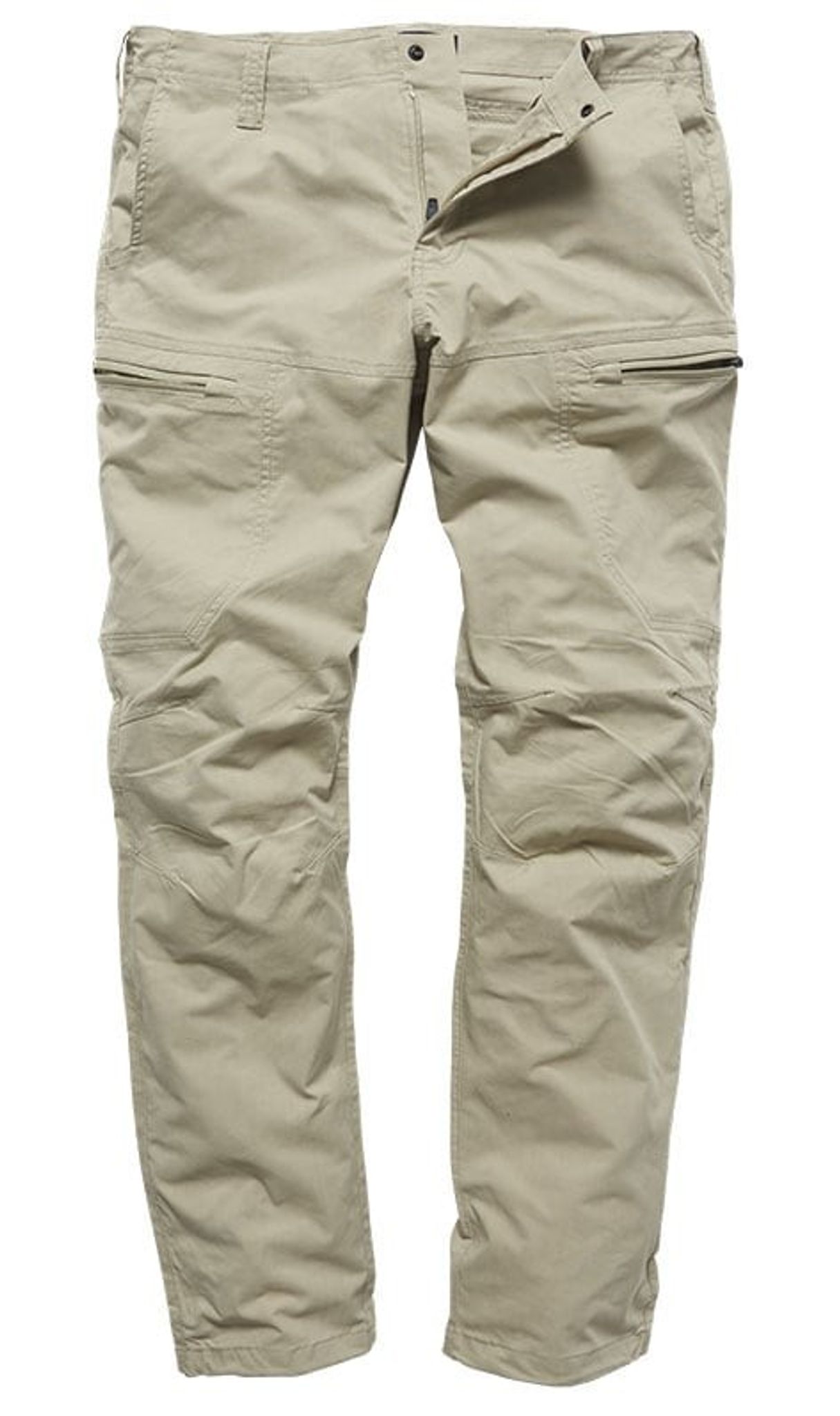 Ett par cargobyxor med en modern version av byxfickor där fickorna blivit infällda och försetts med dragkedja.