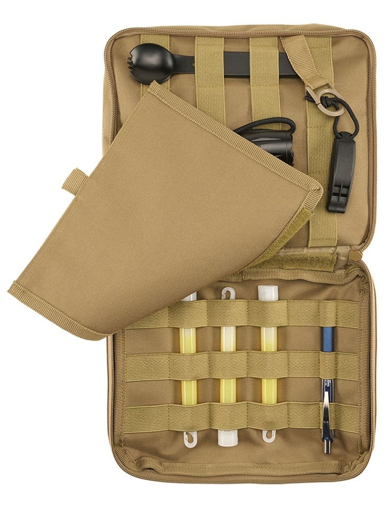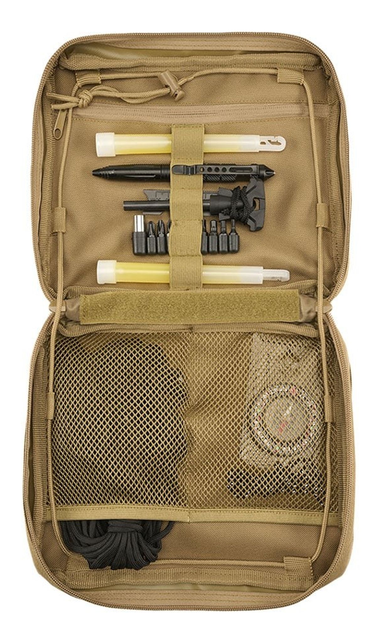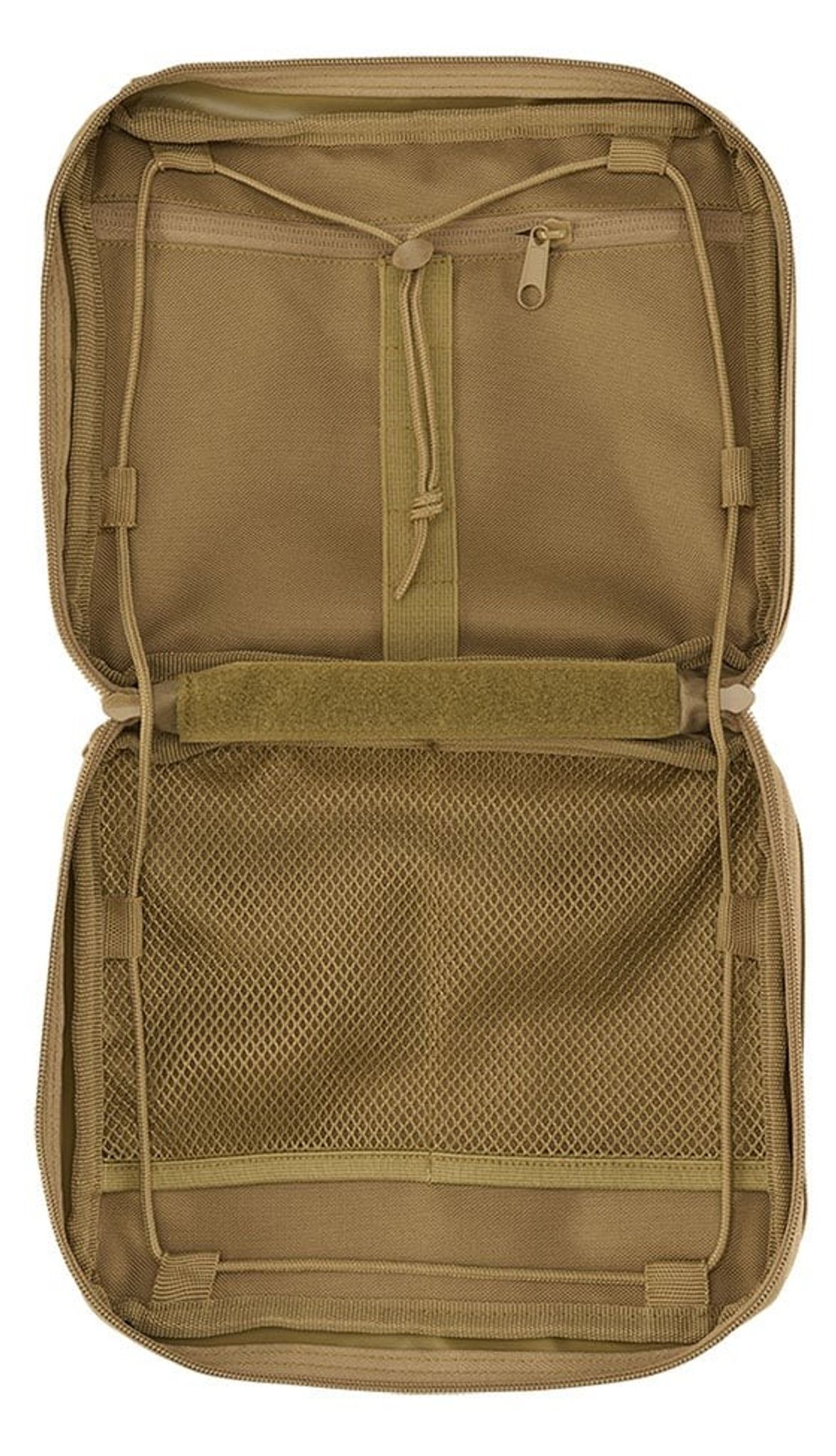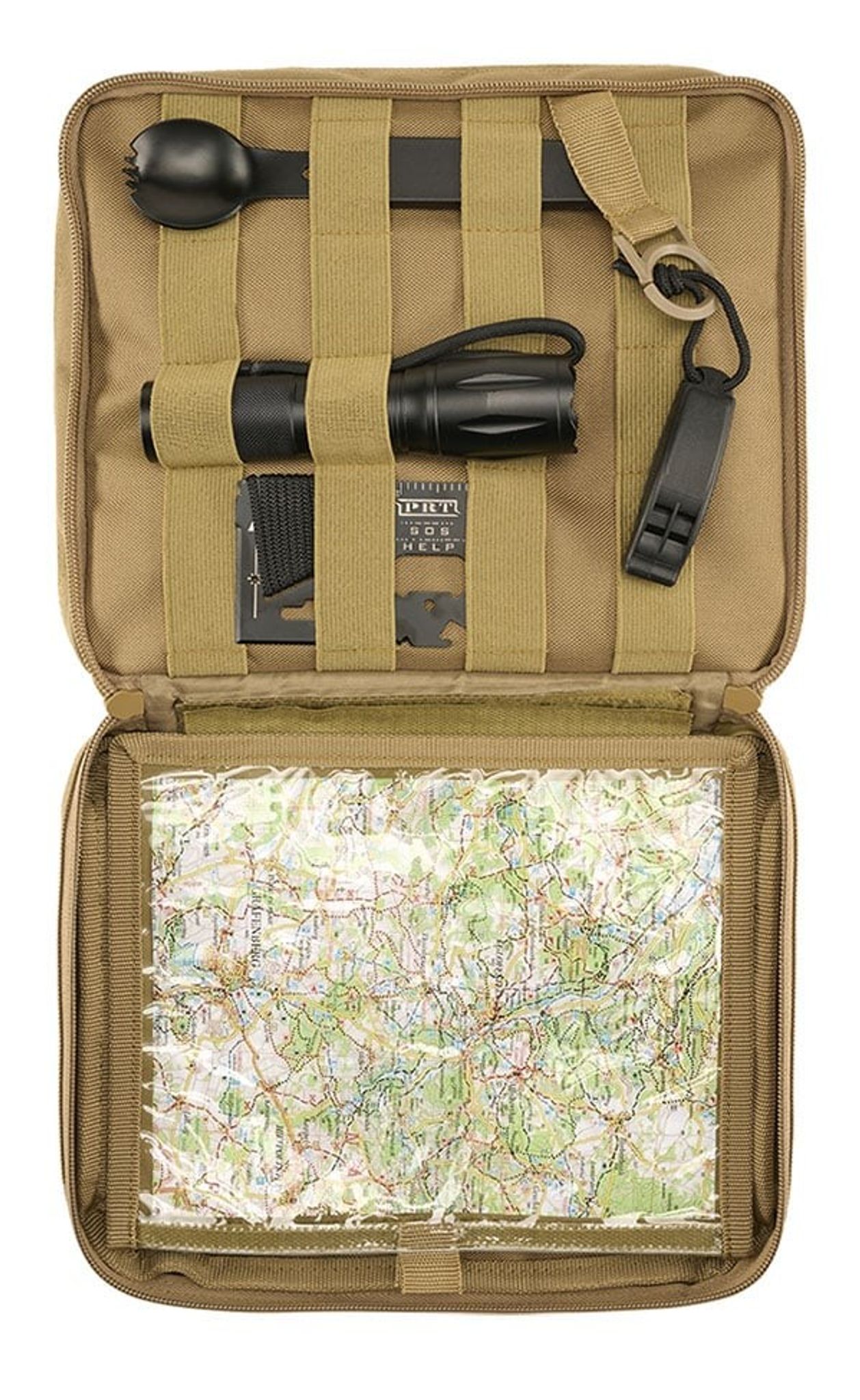 Operation Pouch har 2 stora huvudfack som rymmer en mängd föremål. Den hars även ett stort kartfack, som är avtagbart med kardborreband för snabb och enkel montering. För att hålla din packning fast och organiserad finns det 8 gummiband med 42 öglor för individuell surrning av olika föremål.