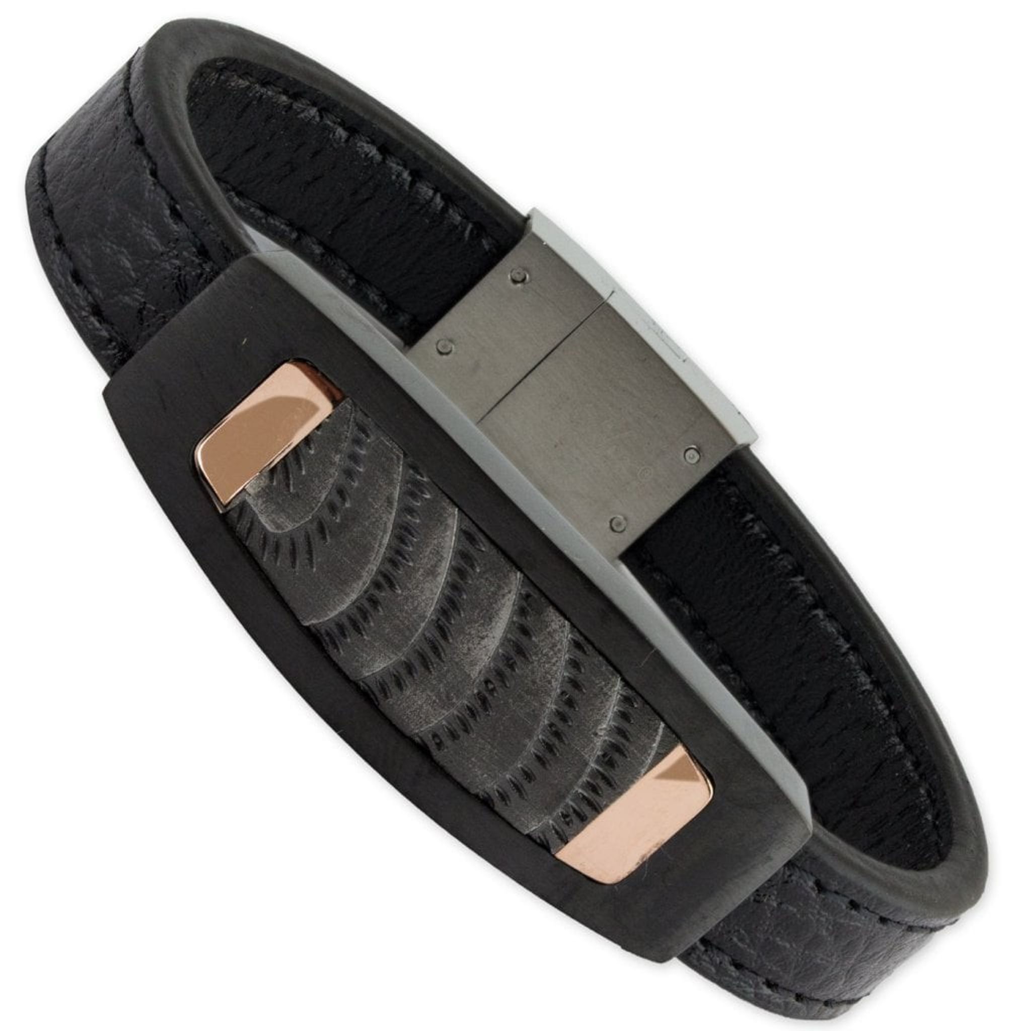 Ett ritkigt läckert läderarmband med en mönstrad bricka i rostfritt stål.