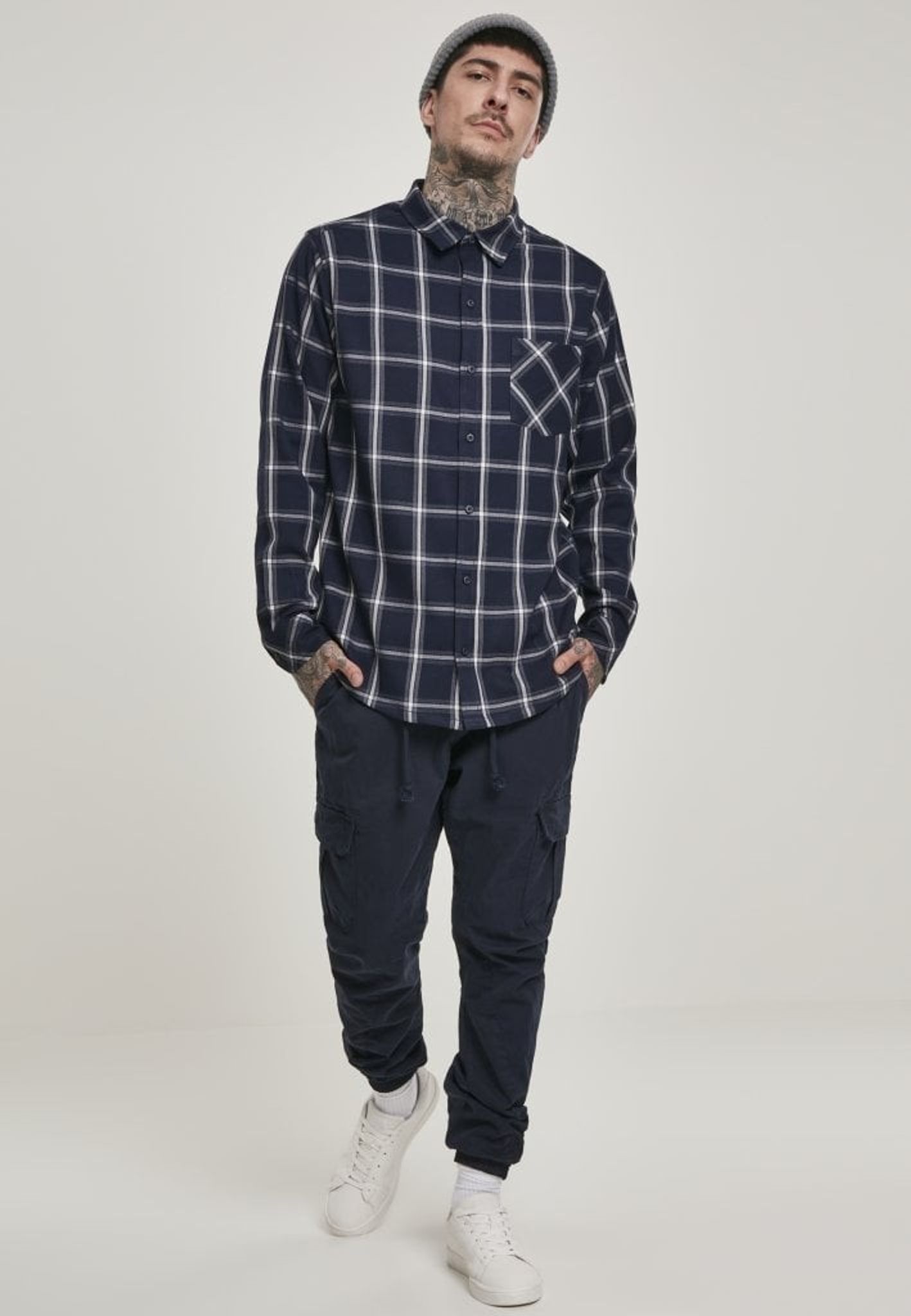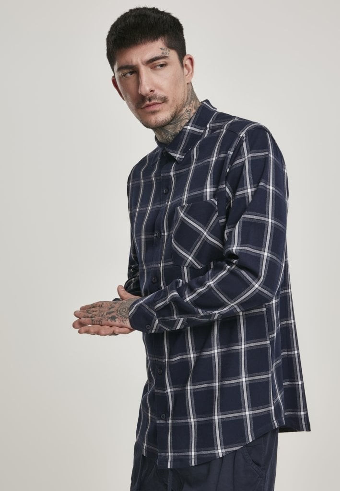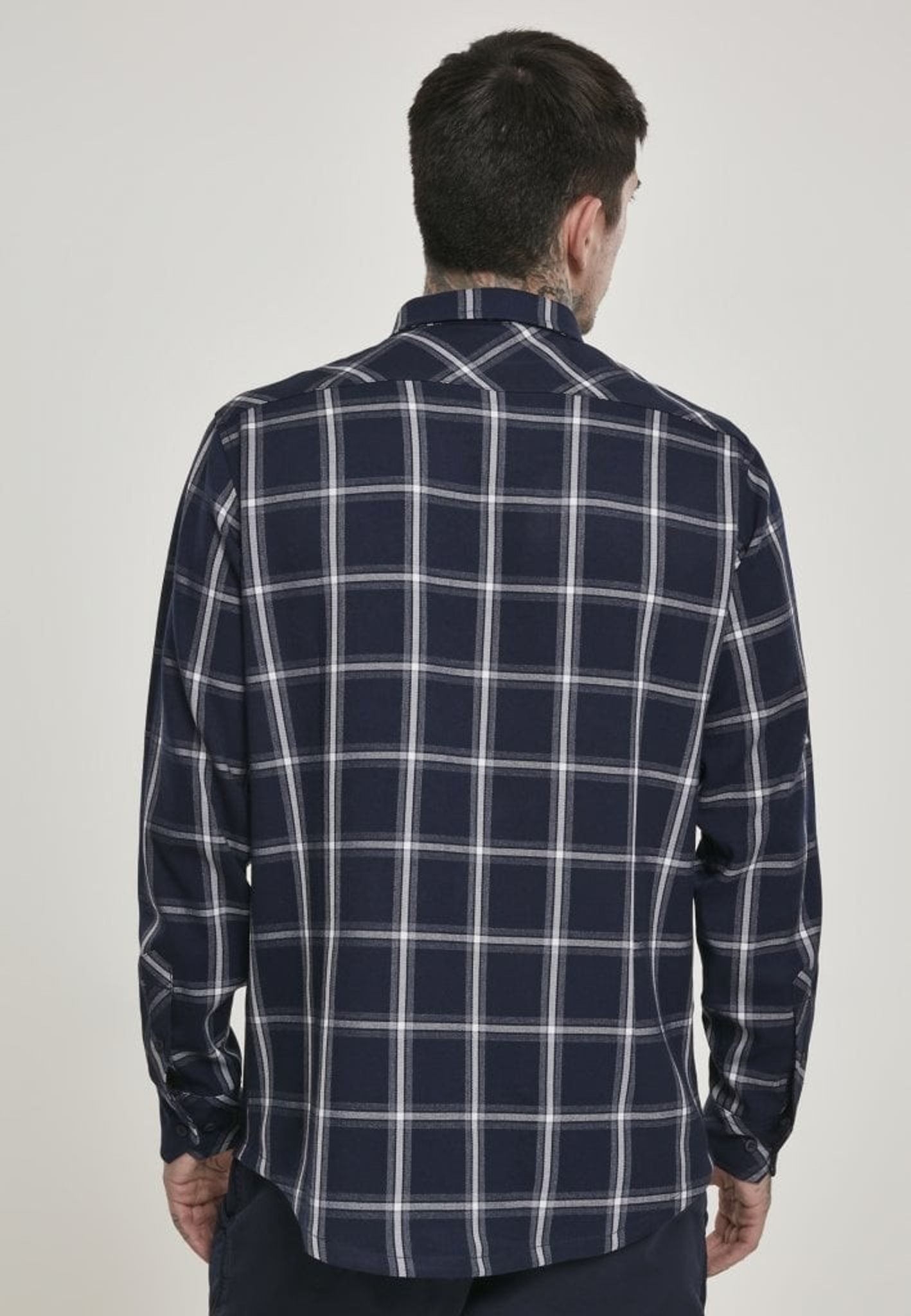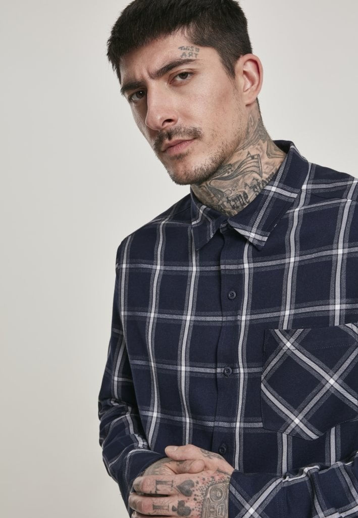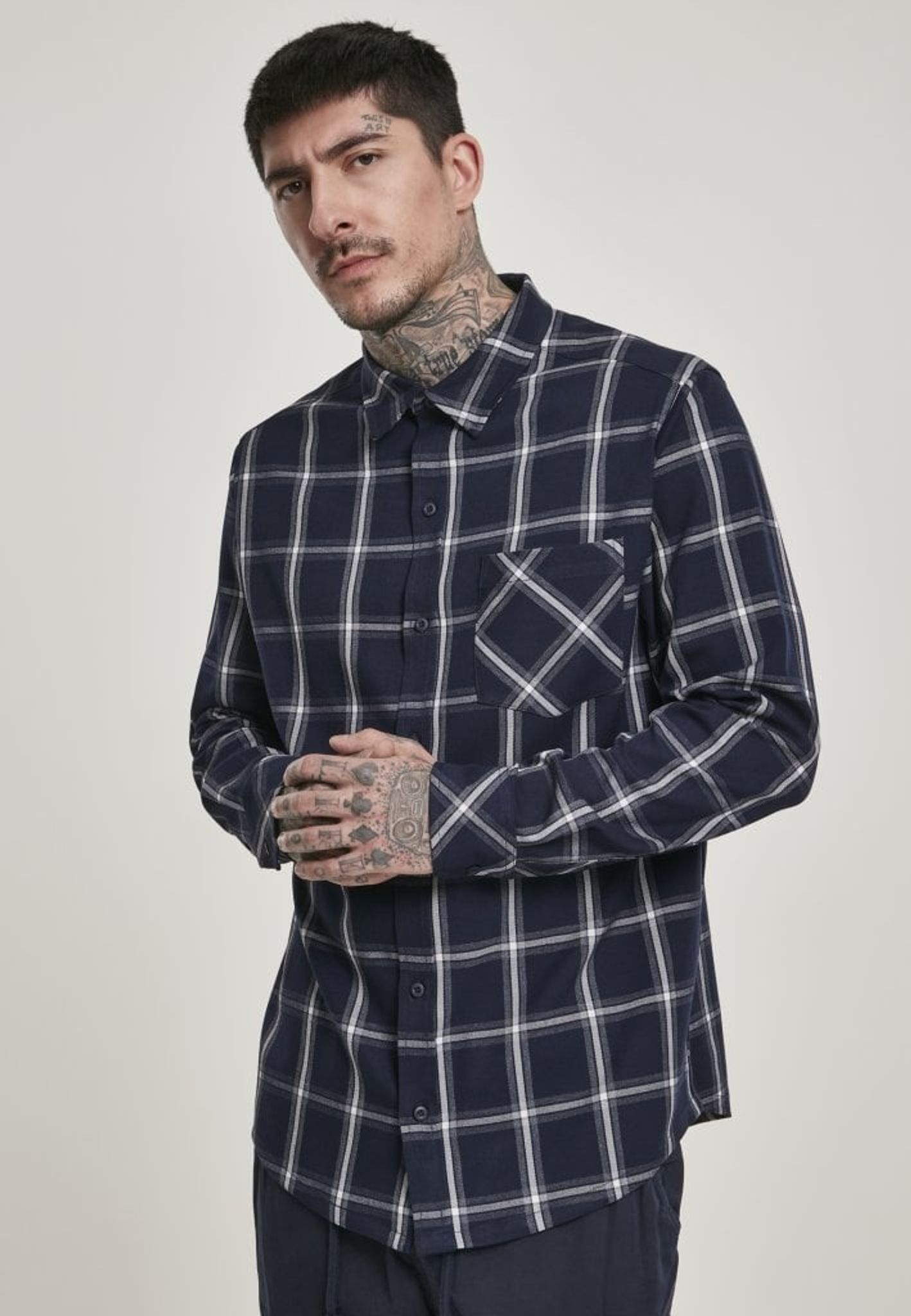 Mörkblå skjorta med vita linjer som skapar ett rutmönster.