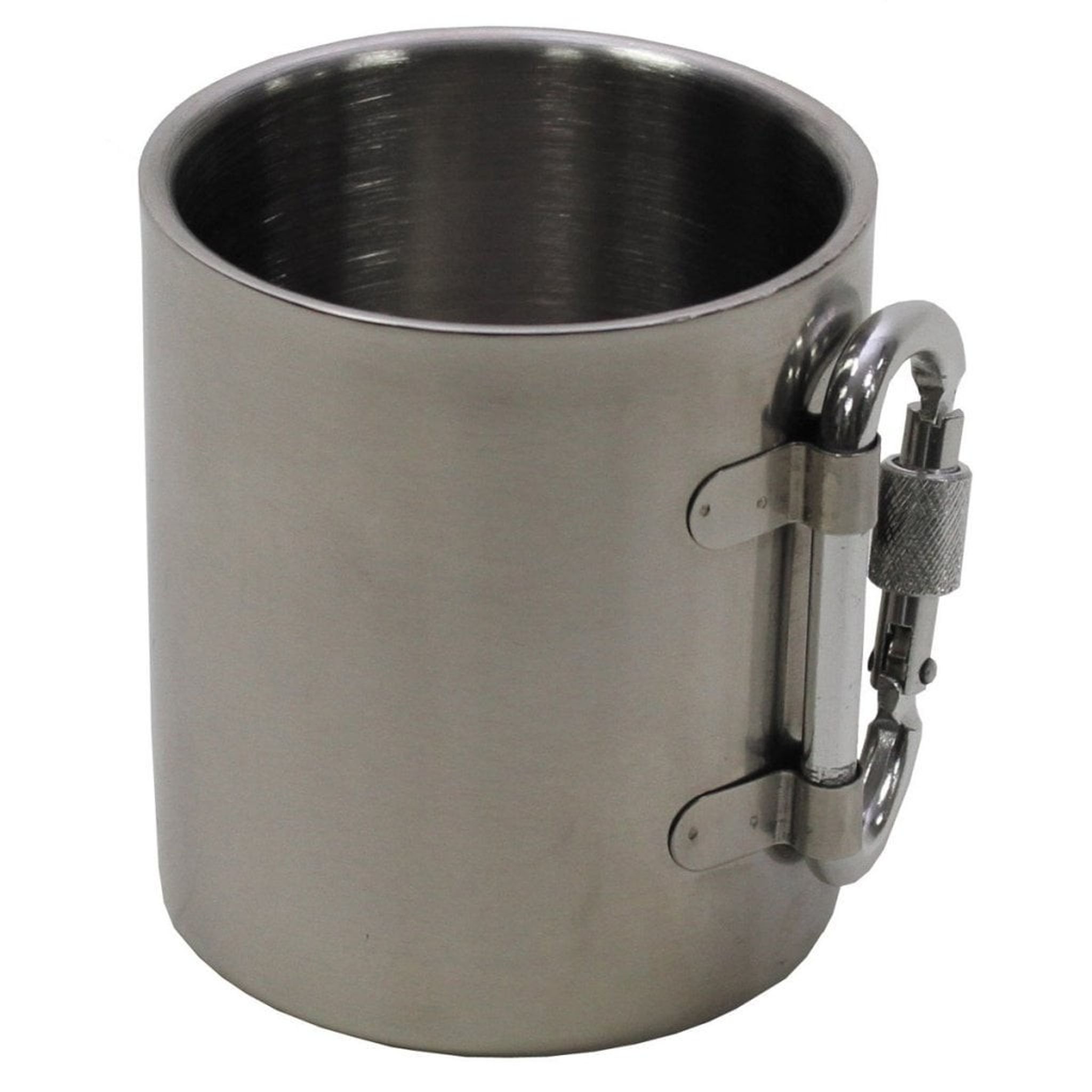 En rostfri mugg med en skruvkarbin som handtag eller som fästanordning.