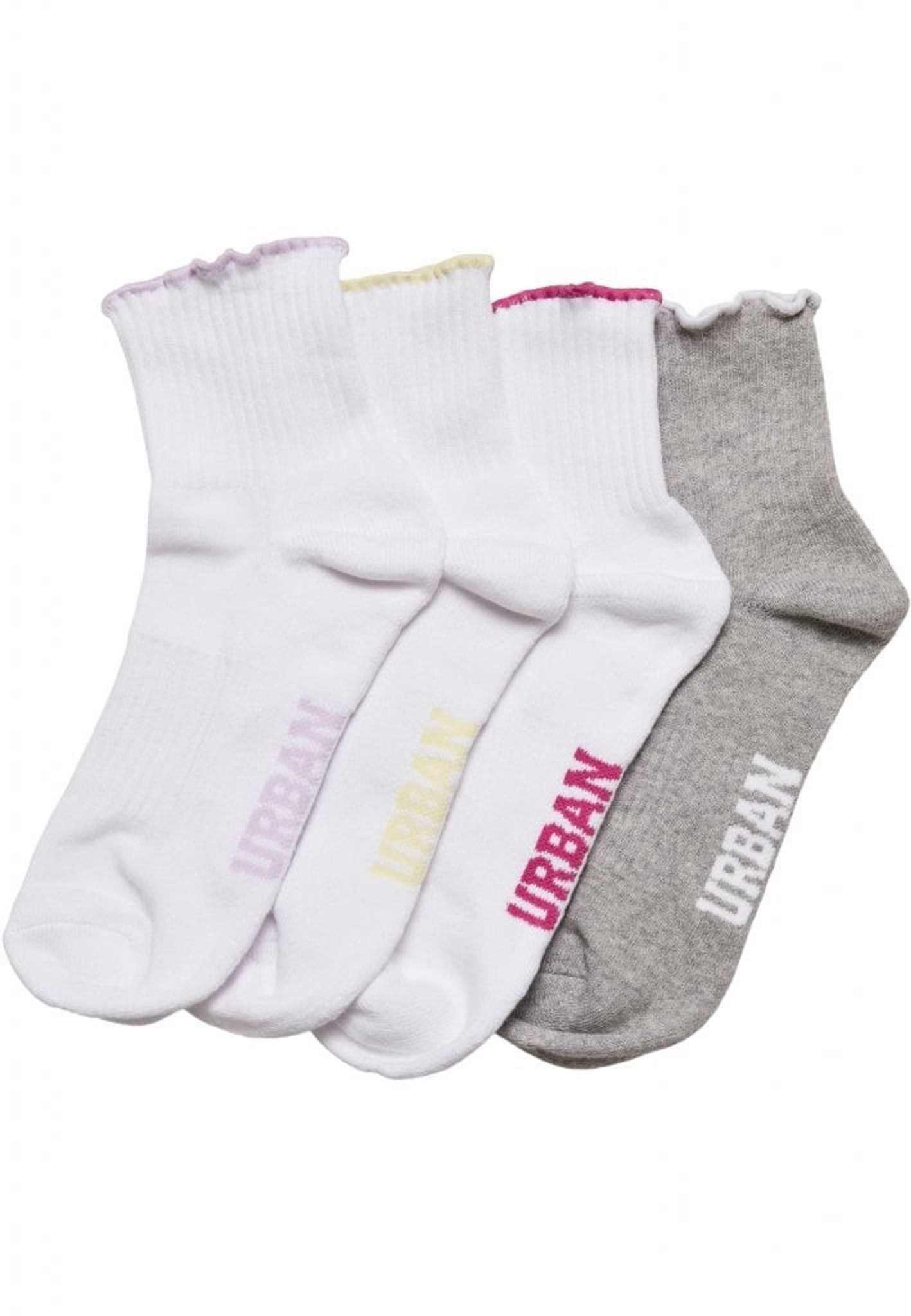 Oavsett om du springer ärenden eller tränar på gymmet håller dessa strumpor dina fötter svala och bekväma. Multicolor Girly Small Edge Socks 4-pack är ett måste för alla som älskar att vara aktiva och snygga på samma gång. Missa inte denna fantastiska produkt från Urban Classics!