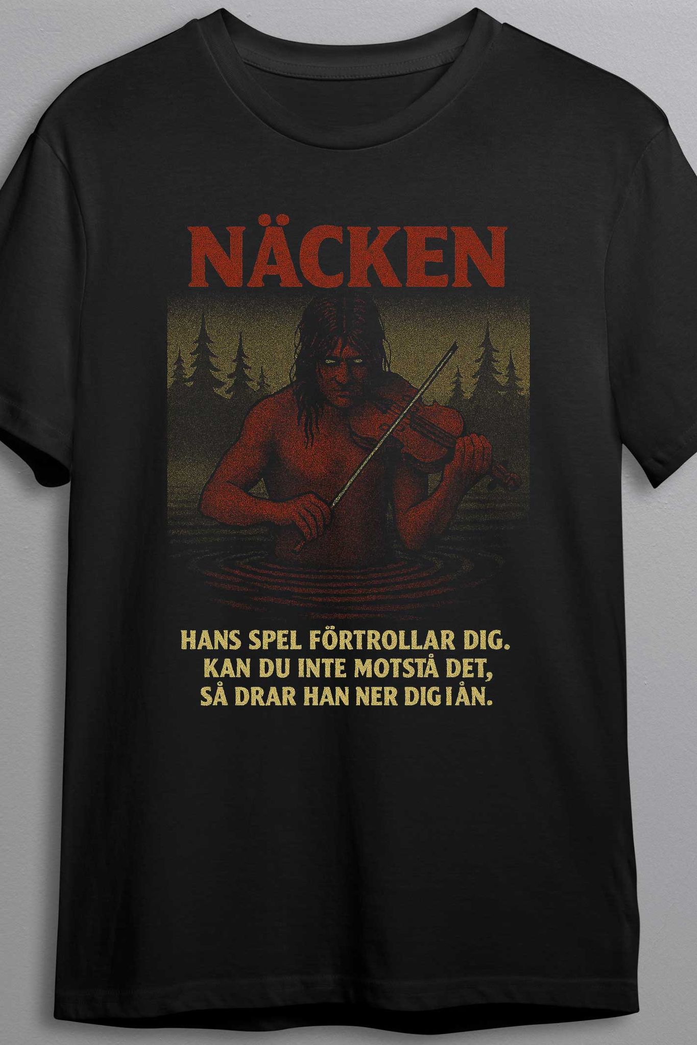 Denna T-shirt fångar den kusliga skönheten och faran i legenden om Näcken. Ett plagg för dig som fascineras av de gamla berättelserna – och vet att vissa melodier inte bör följas.