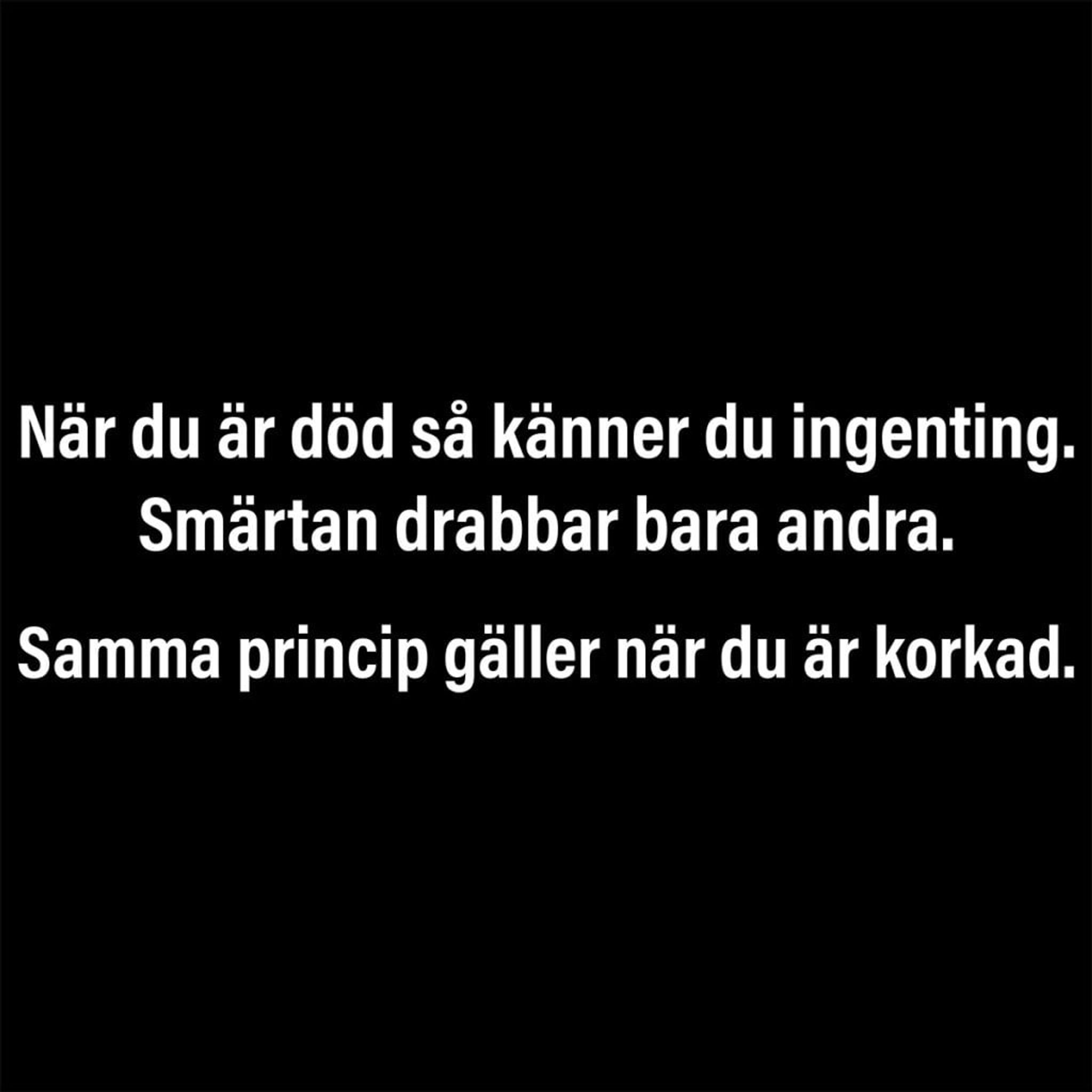 Denna svarta T-shirt med sin tankeväckande text är perfekt för den som har en svart humor och uppskattar livets ironi. Med orden "När du är död så känner du ingenting. Smärtan drabbar bara andra. Samma princip gäller när du är korkad." erbjuder den en skarp observation om livets realiteter på ett humoristiskt sätt.