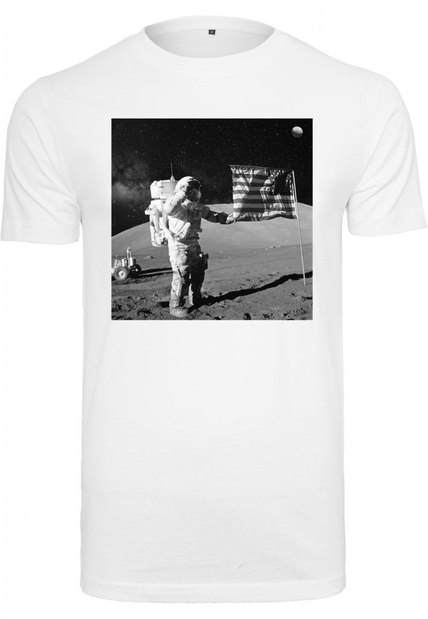 Bilden på t-shirten visar den första mannen på månen med den amerikanska flaggan.