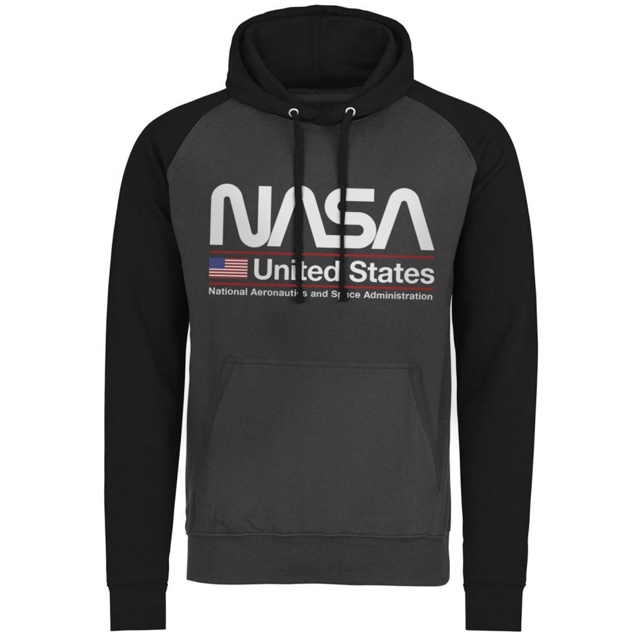En baseball hoodie med NASA's masklogotyp tryckt på bröstet tillsammans med amerikanska flaggan bredvid texten United States och över texten National Aeronautics and Space Administration.