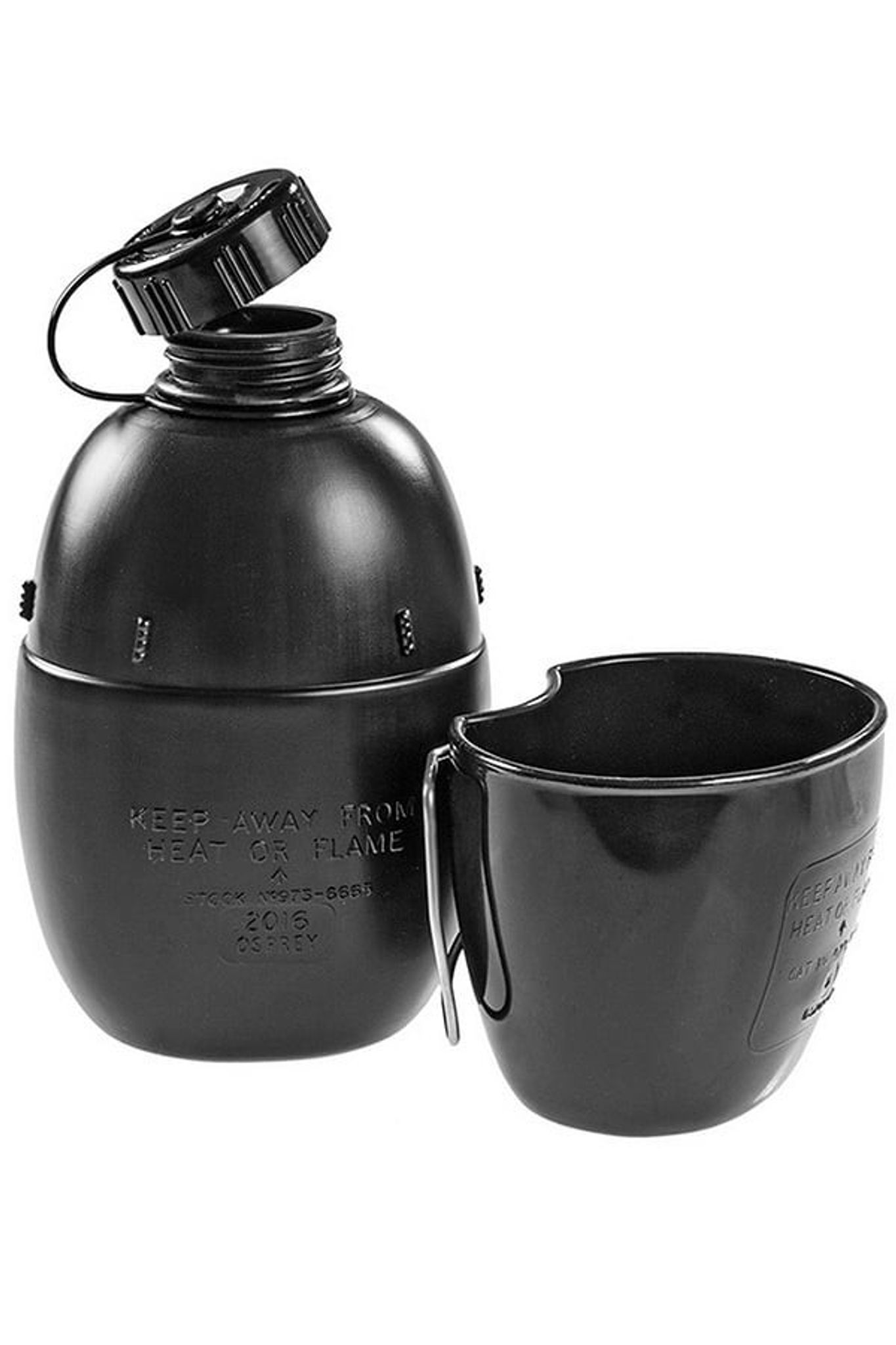 Osprey NATO Vattenflaska och mugg är en klassisk utrustning för utomhusaktiviteter som har varit standardutrustning för den brittiska armén i många år. Vattenflaskan rymmer 1 liter vatten och är tillverkad av ett styvt svart plastmaterial som är slitstarkt och inte går sönder.
