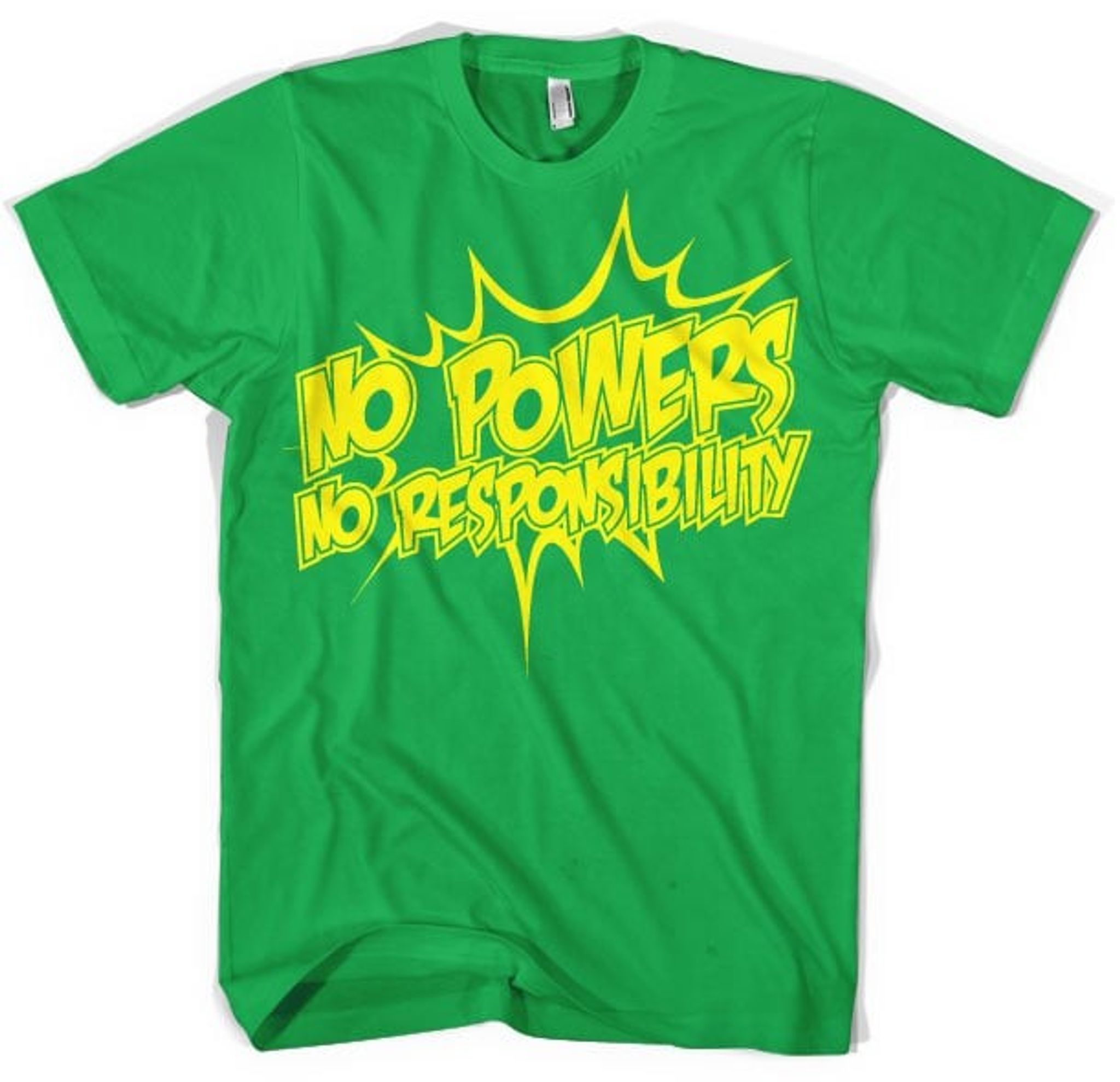 Så oavsett om du är en person som gillar att uttrycka dig genom din klädsel, eller om du bara behöver en bekväm och snygg t-shirt, så är No Powers - No Responsibility T-shirt ett perfekt val för dig. Ett val som visar att du tar ansvar, utan att ta makten. Beställ din t-shirt idag och bli en del av No Powers-familjen!