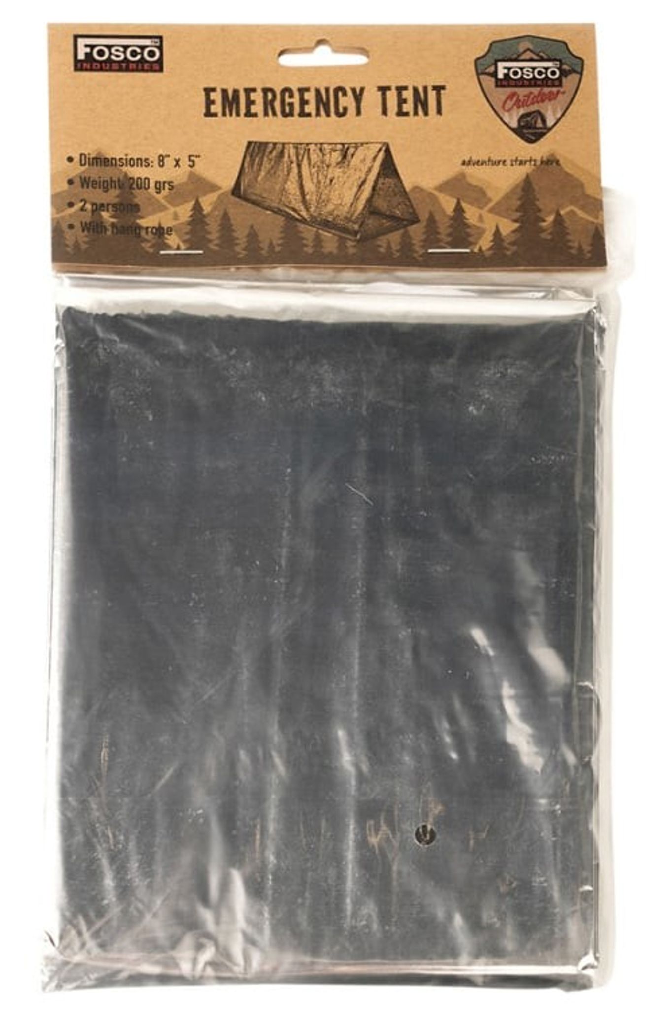 I förpackningen ingår ett rep som kan användas för att fästa tältet. Fosco Emergency Tent väger 200 gram och är en produkt från Fosco Industries, i en silver- eller kromfärgad design.