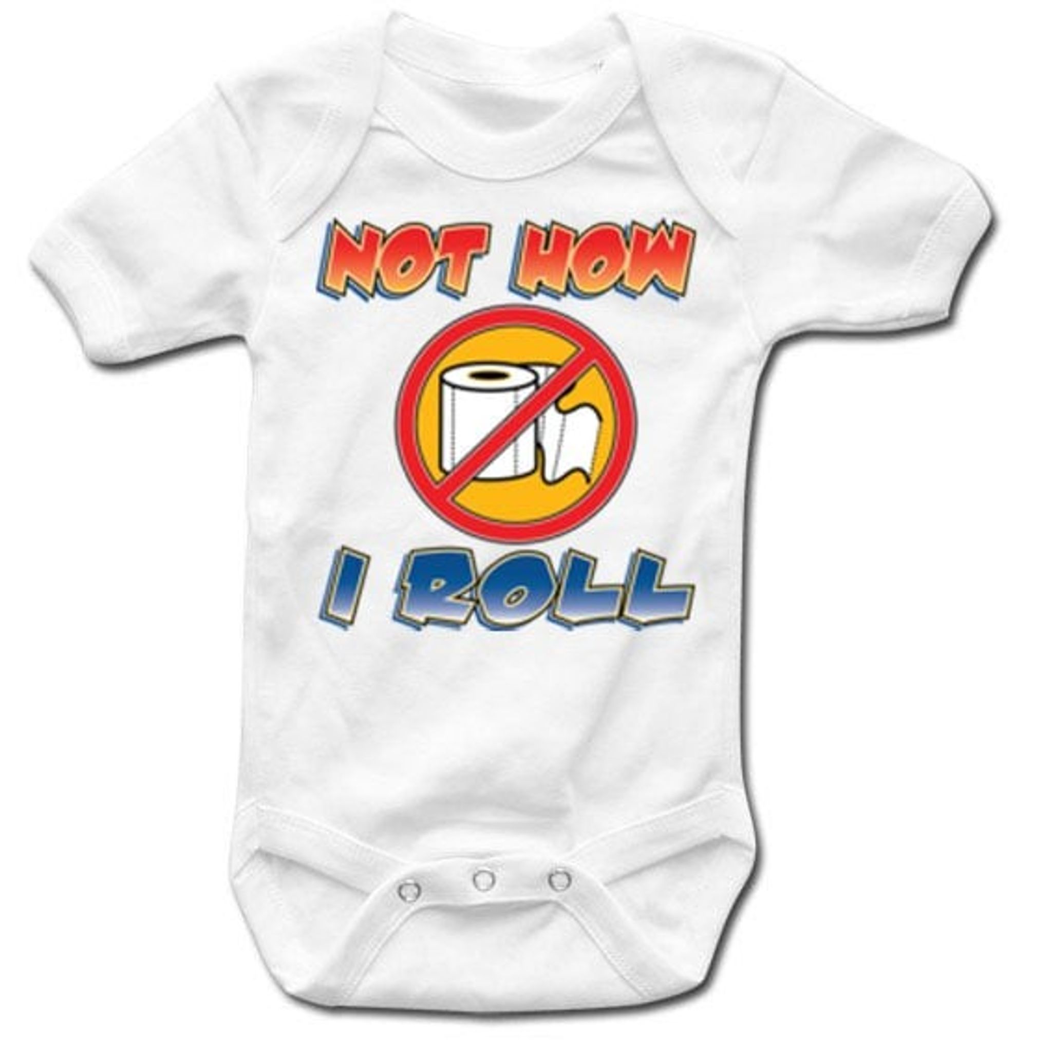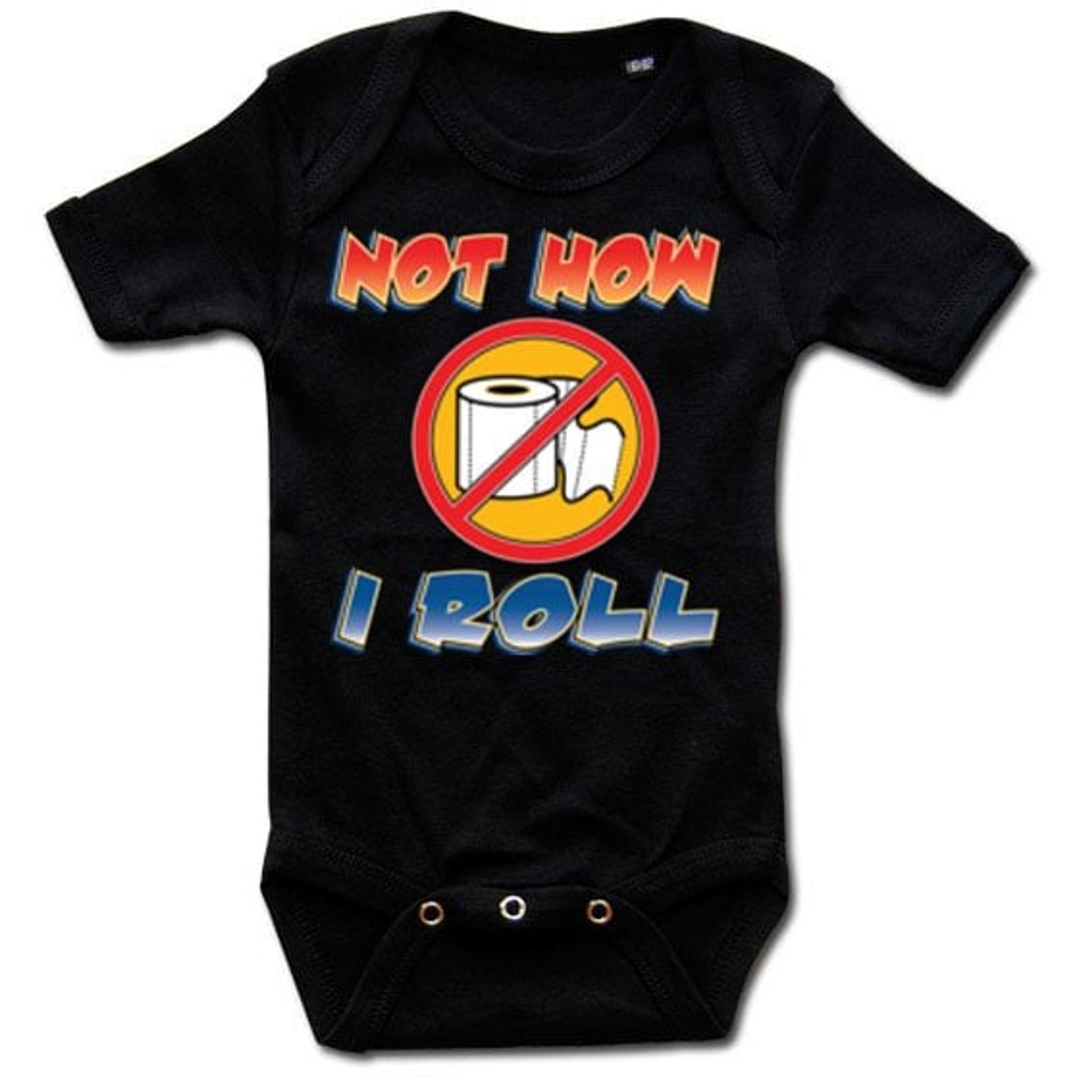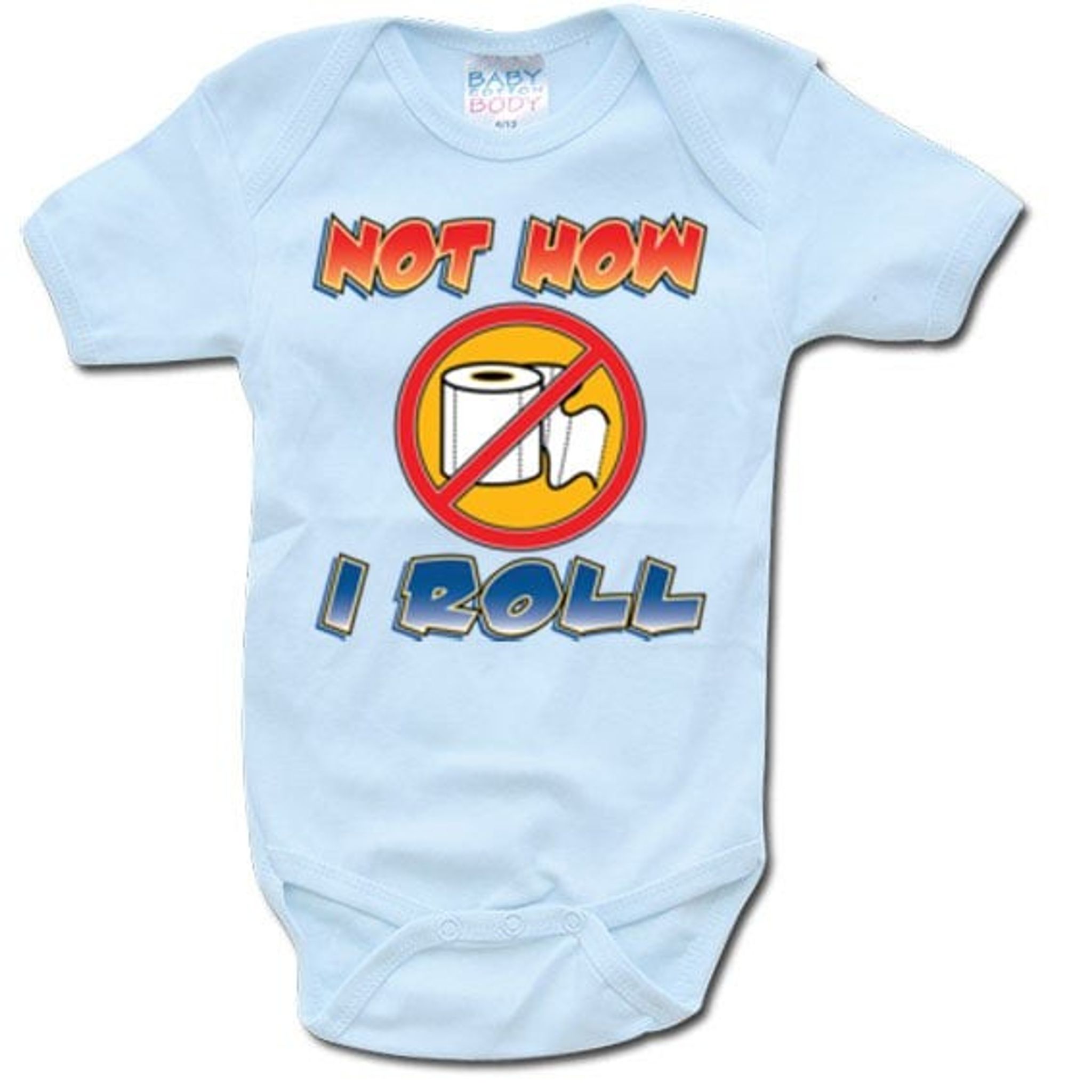 En humoristisk body med en överstruken toalettrulle och texten "Not How I Roll".