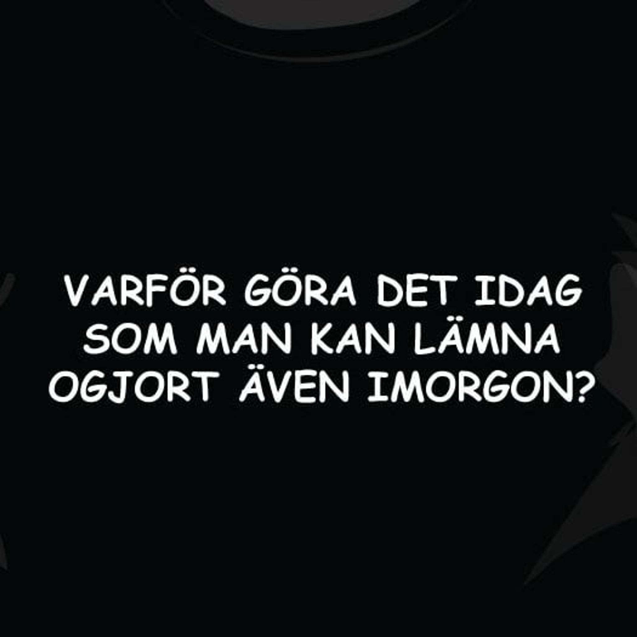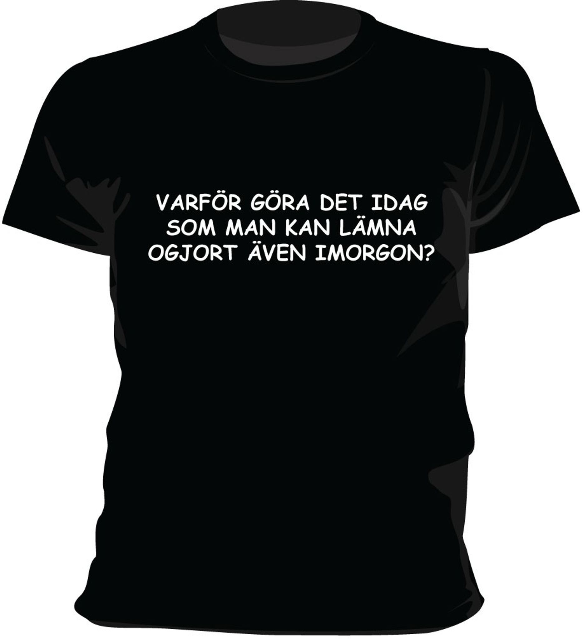 Denna svarta T-shirt är en hyllning till prokrastinerare överallt, med en slogan som varje mästare av uppskjutande kan relatera till. Texten på bröstet deklarerar, "Varför göra det idag som man kan lämna ogjort även imorgon?" – en kvick påminnelse om konsten att skjuta upp saker till en annan dag.