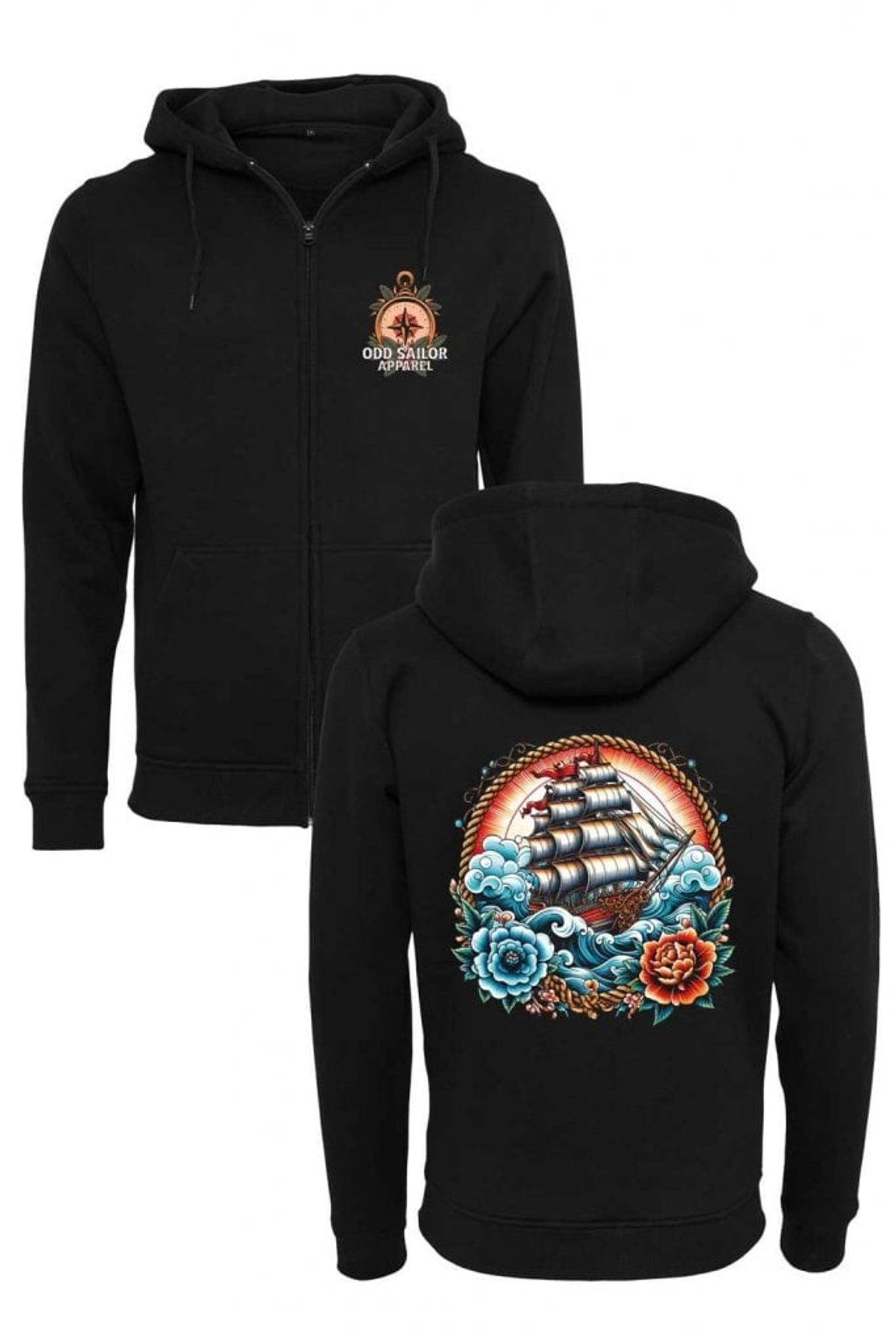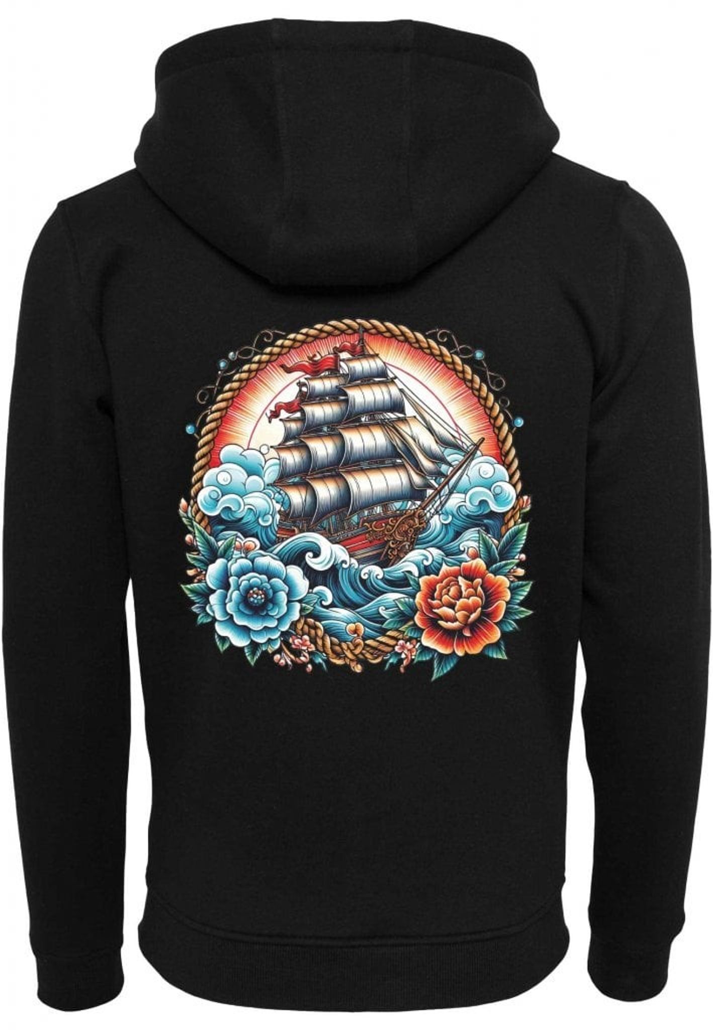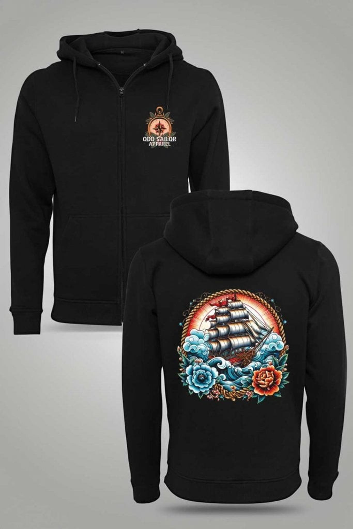 Denna hoodie är den perfekta kombinationen av stil och komfort, med en klassisk old school-tatueringsdesign som verkligen fångar blicken. På baksidan hittar du ett detaljrikt motiv av ett segelfartyg som bryter genom vågorna, omgiven av blommor och marina detaljer, vilket ger en autentisk retro-känsla.