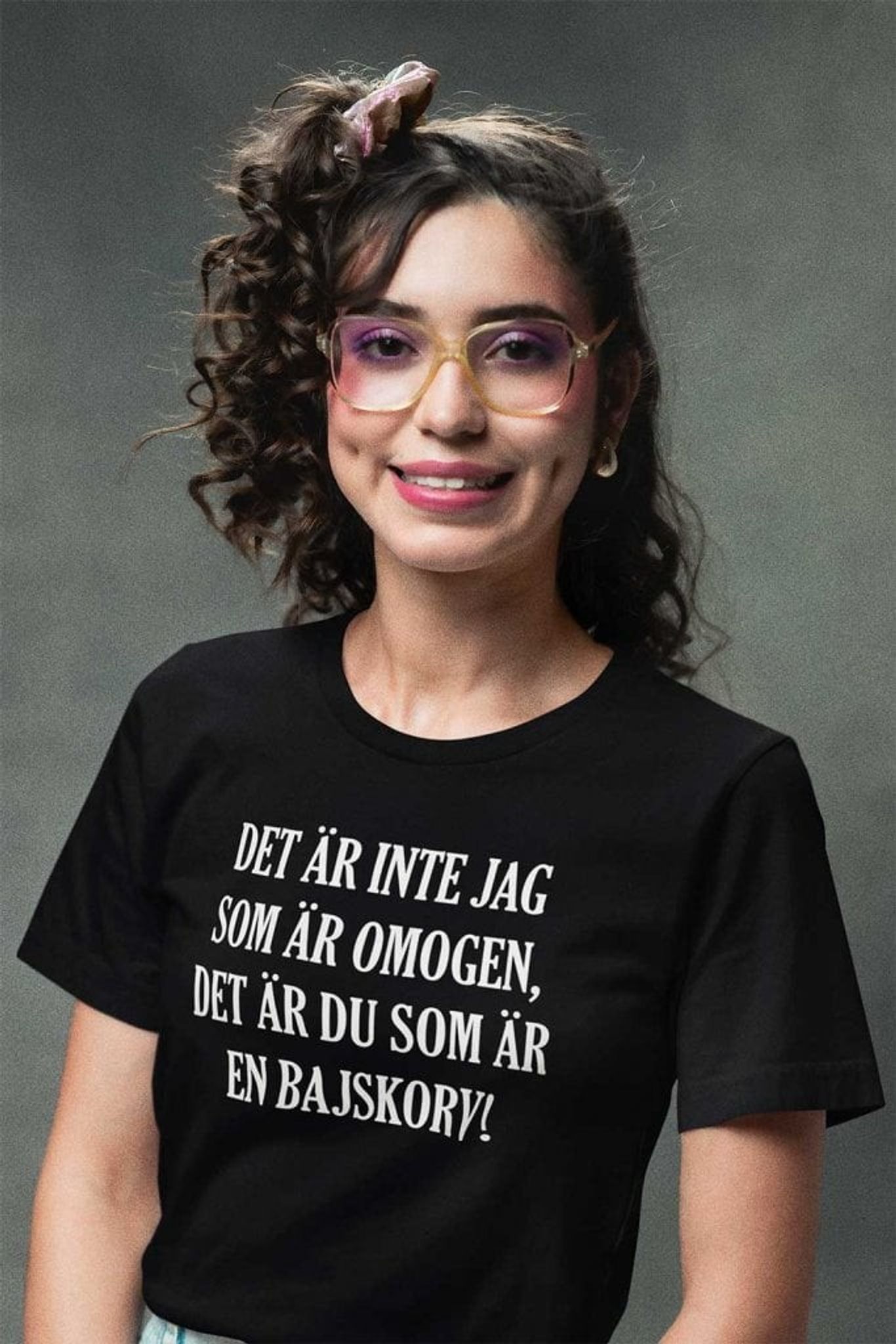 Letar du efter en t-shirt som kan uttrycka din åsikt på ett humoristiskt sätt? Då är den här svarta t-shirten med det vita texttrycket perfekt för dig. Texten "Det är inte jag som är omogen, det är du som är en bajskorv!" kommer garanterat att dra blickarna till sig.