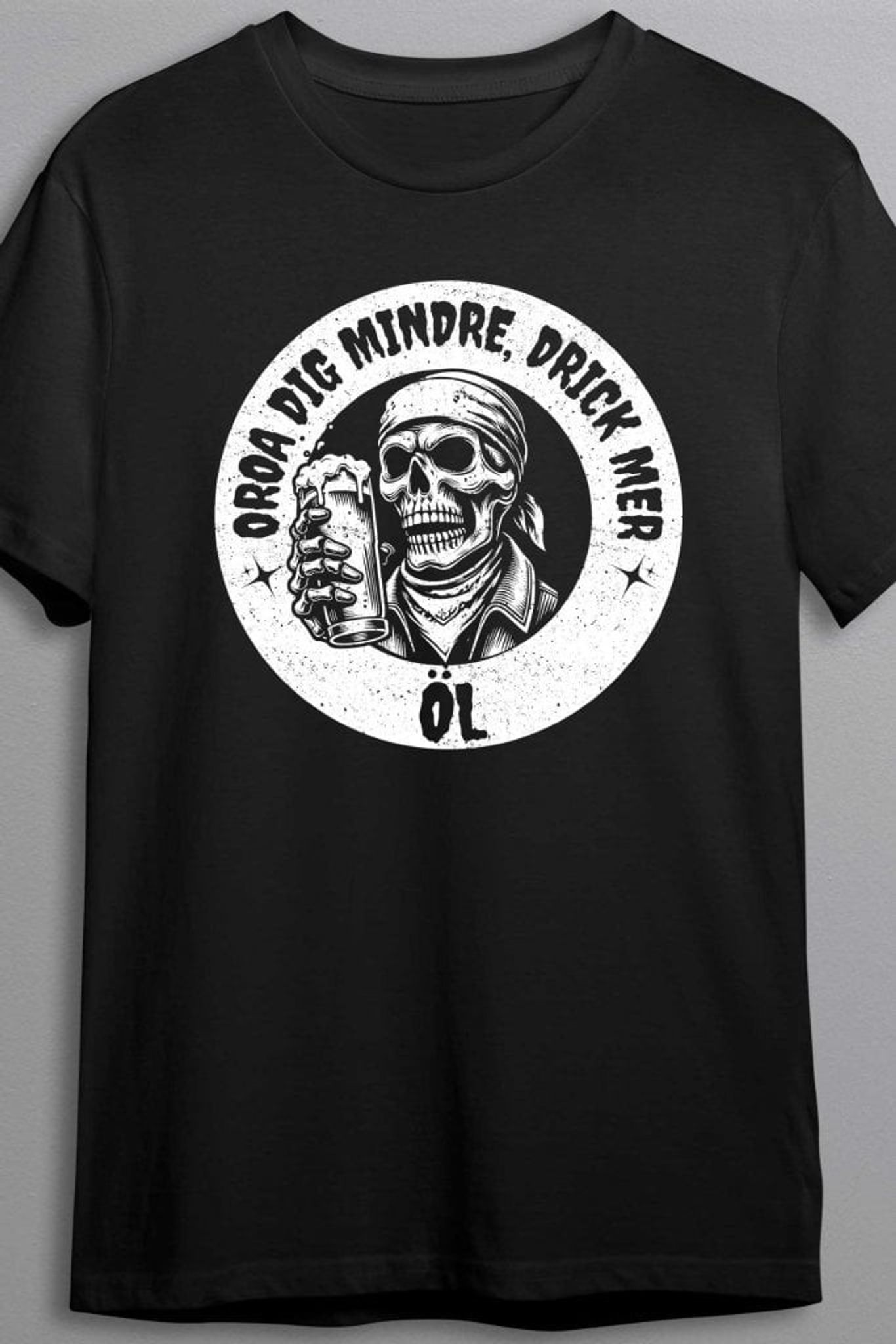 Livet är för kort för att stressa – och den här t-shirten har receptet för en bekymmersfri tillvaro: "Oroa dig mindre, drick mer öl". Med ett tryck som osar piratattityd och rebellisk livsfilosofi, bär du den som en påminnelse om att vissa problem faktiskt kan lösas med en kall öl i handen.