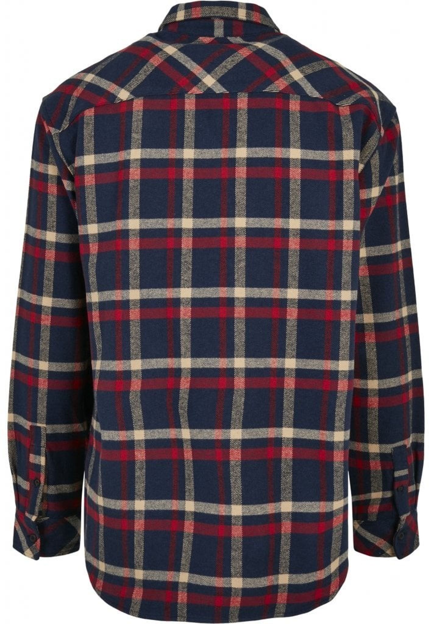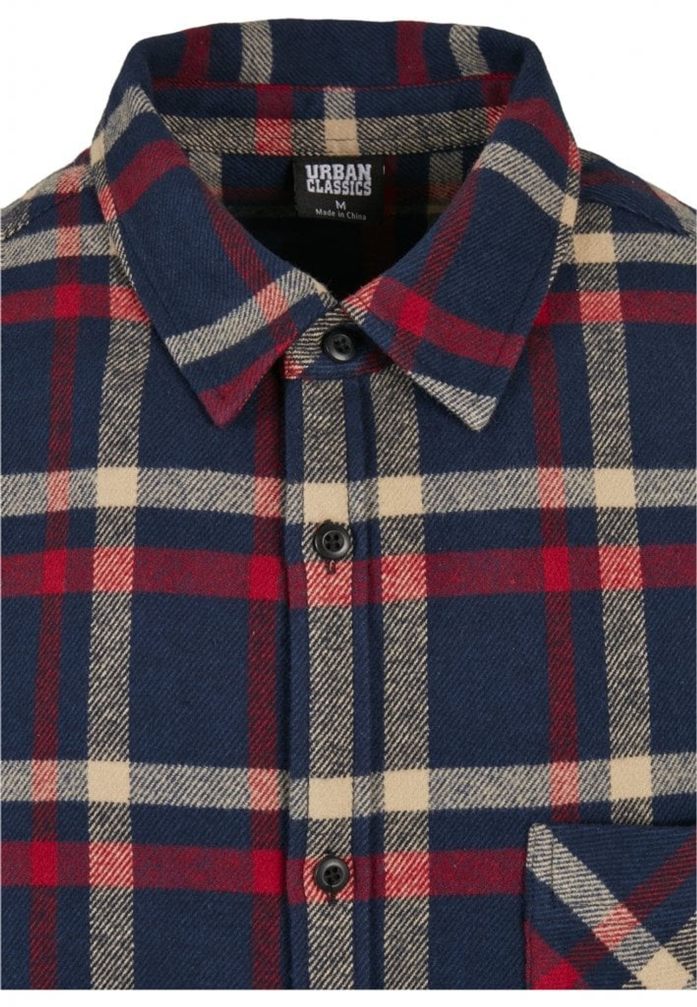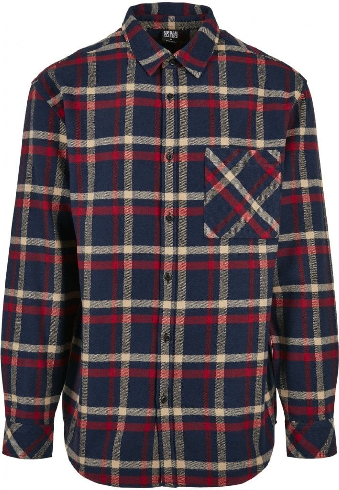 En rutig flanellskjorta i lite baggy oversize-modell. Ett stirlent rutmönster i marinblå, gräddvit och rött. Skjortan har en nedvikt krage och en bröstficka.