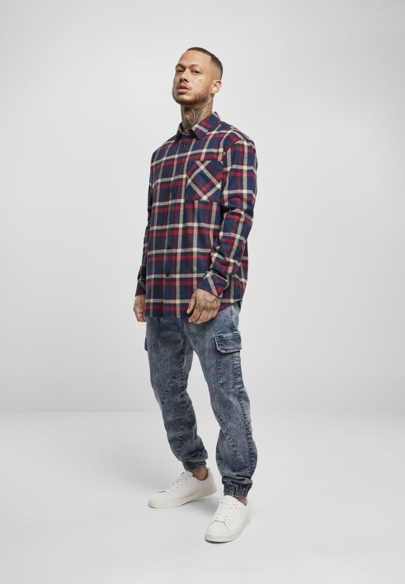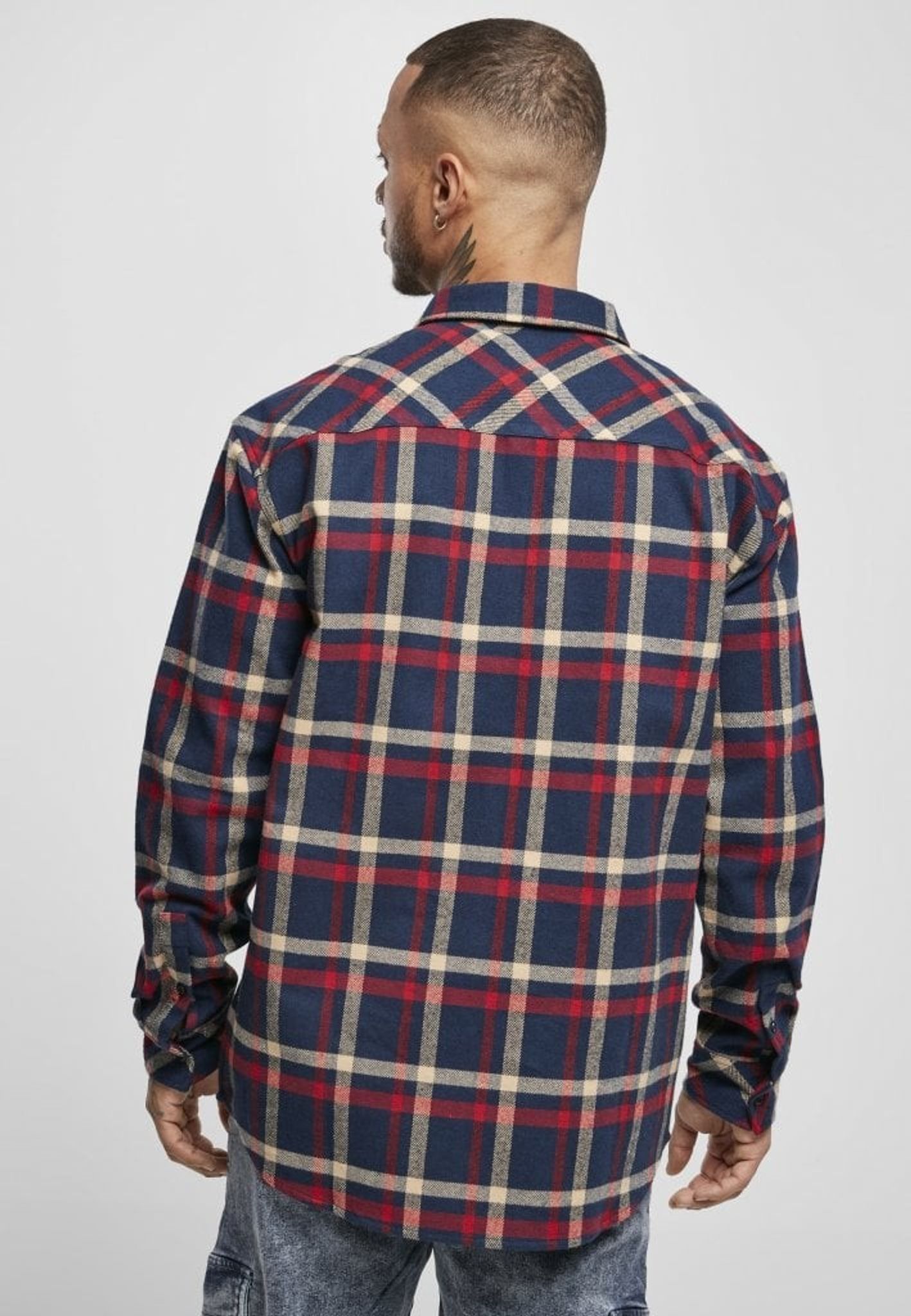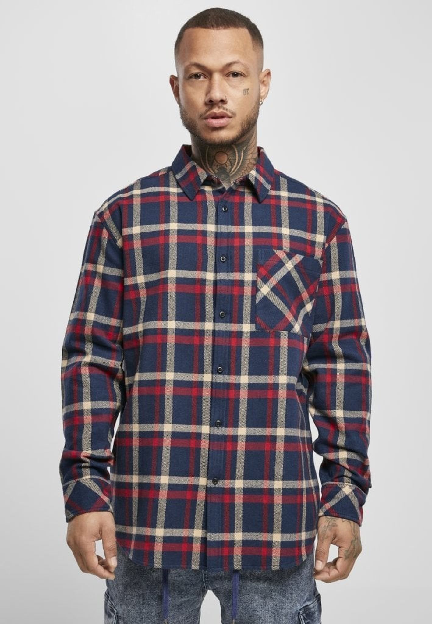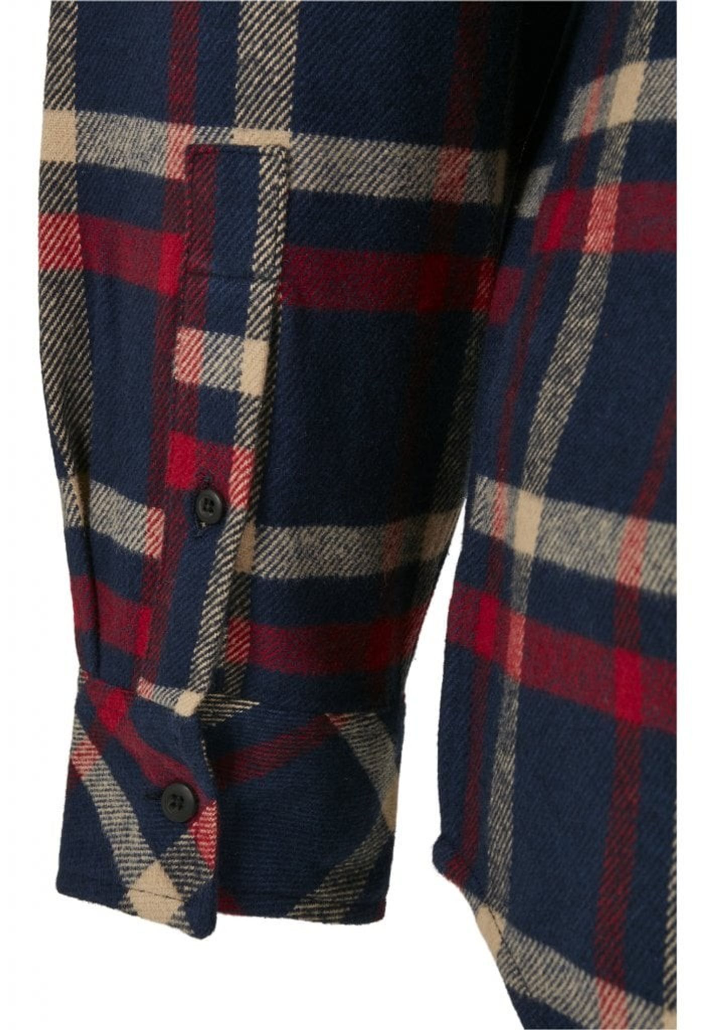 En rutig flanellskjorta i lite baggy oversize-modell. Ett stirlent rutmönster i marinblå, gräddvit och rött. Skjortan har en nedvikt krage och en bröstficka.