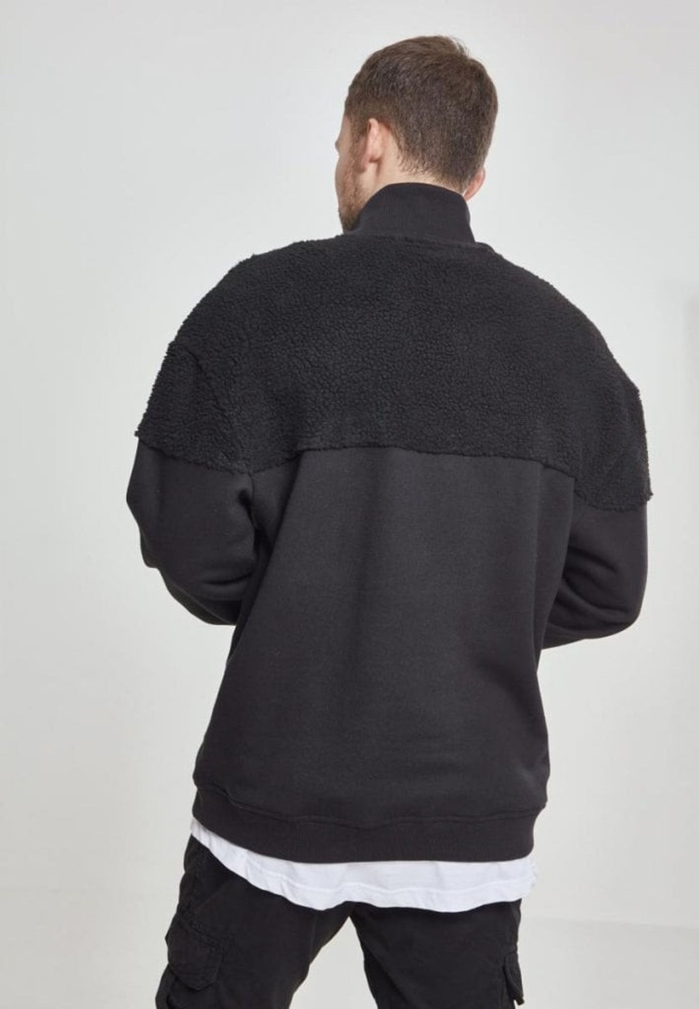 En tuff sweatshirt med tyg på nedre delen av kropp och ärmar för att sedan gå över till sherpapäls över axlarna.