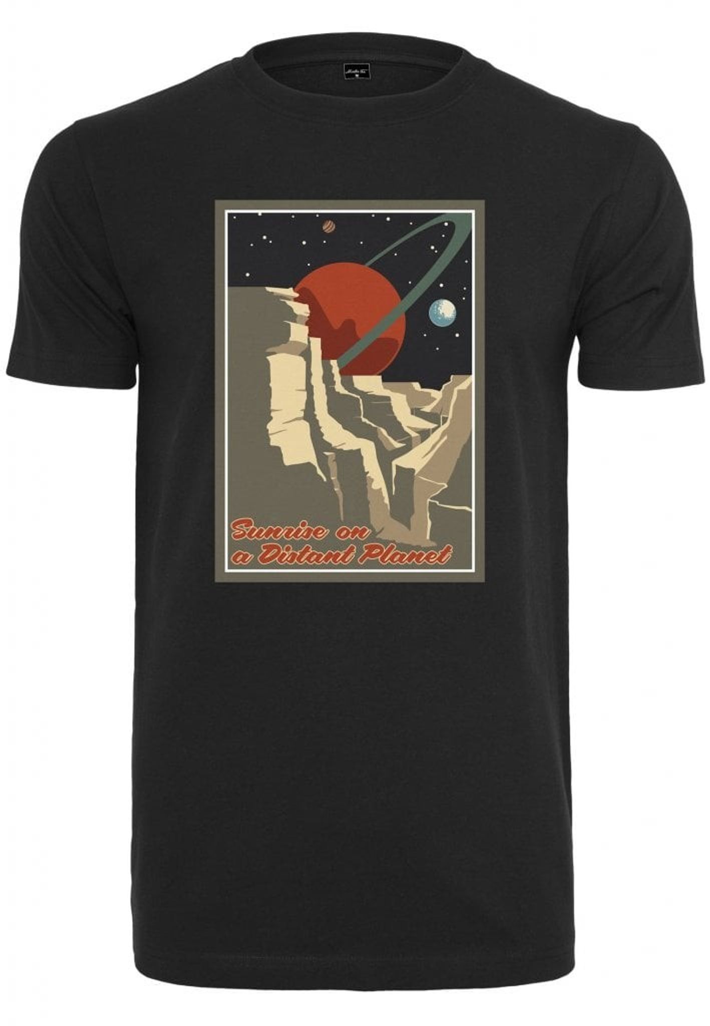 En svart t-shirt i rymlig modell med ett tryck fram som visar solar och planeter.