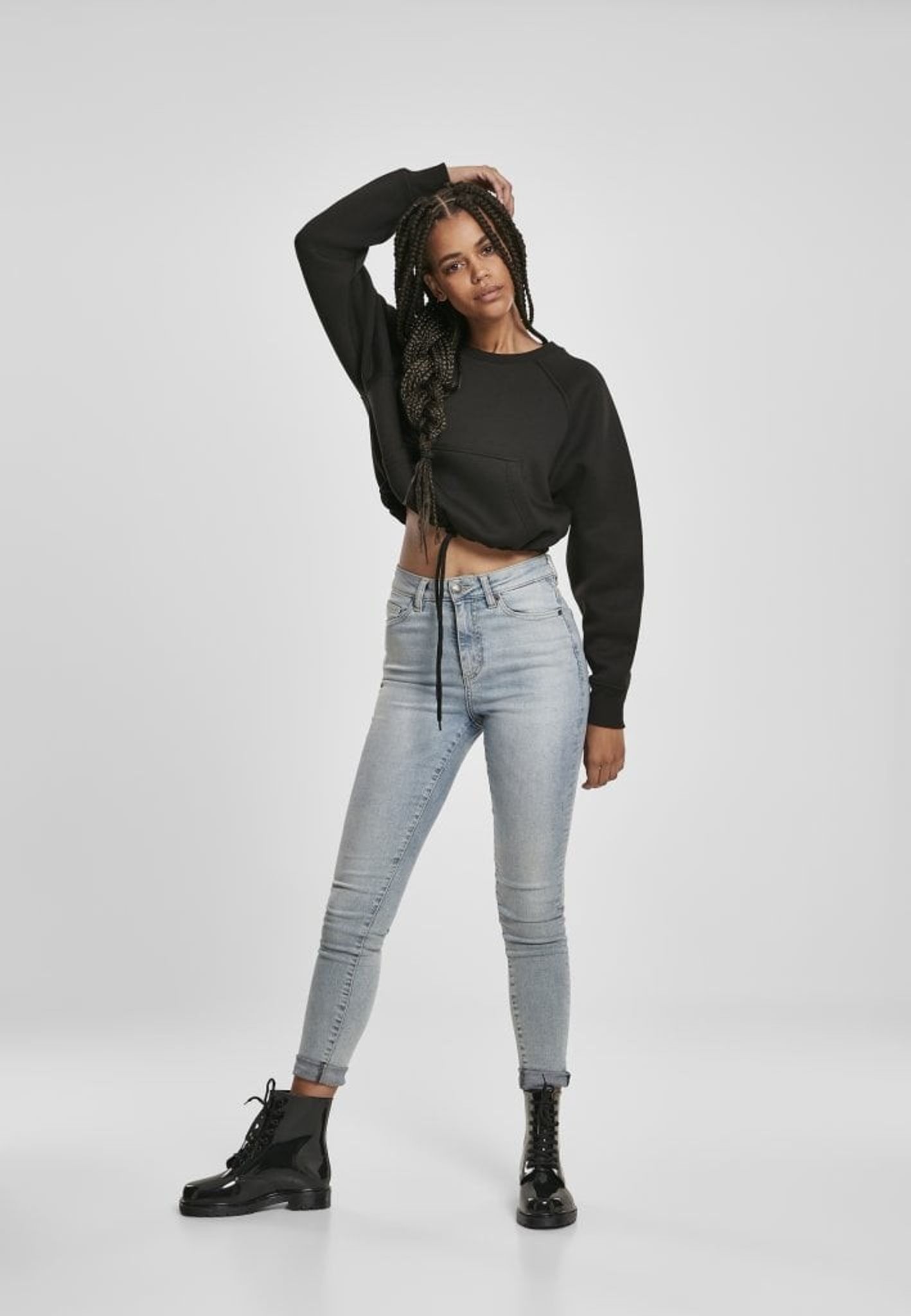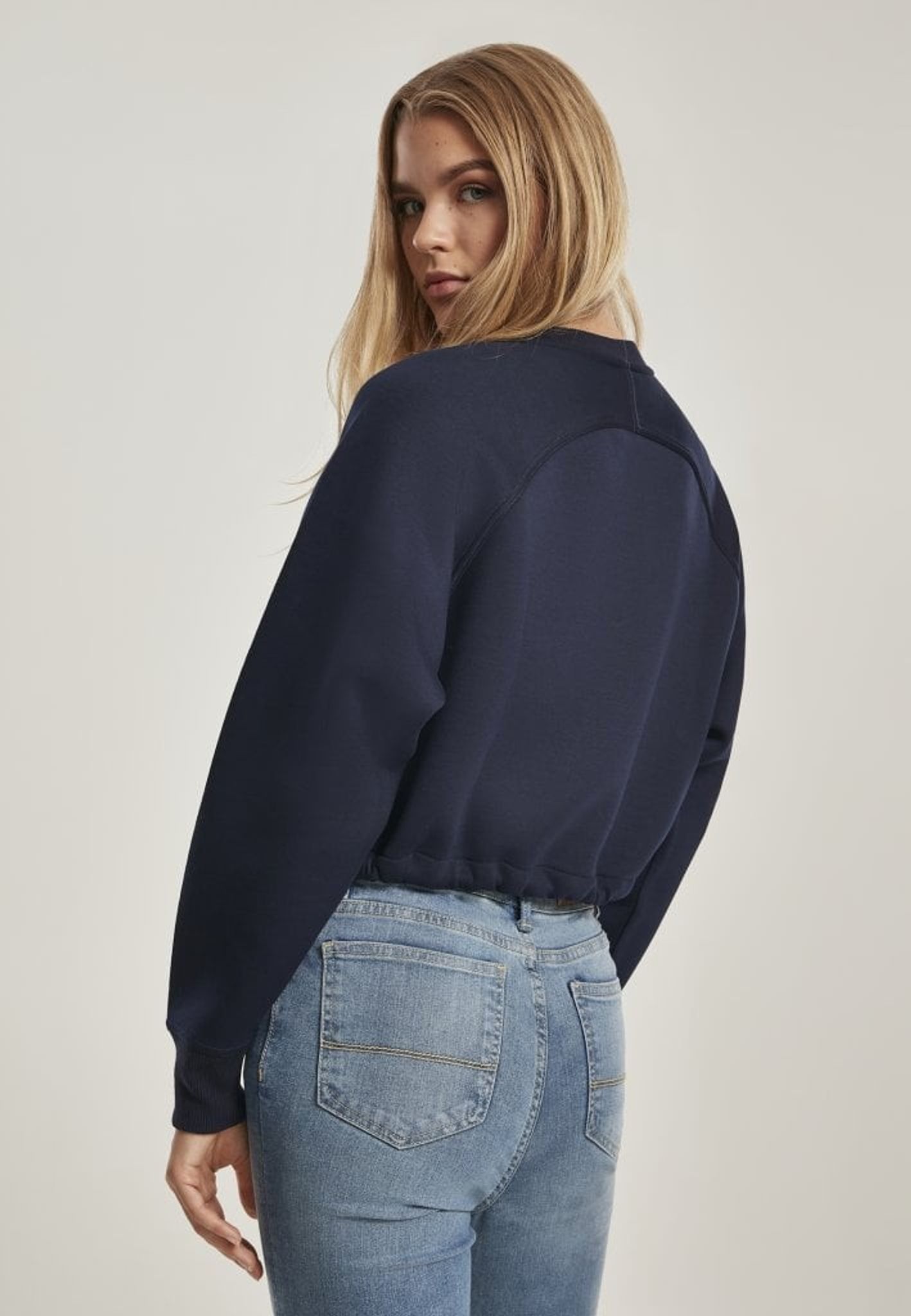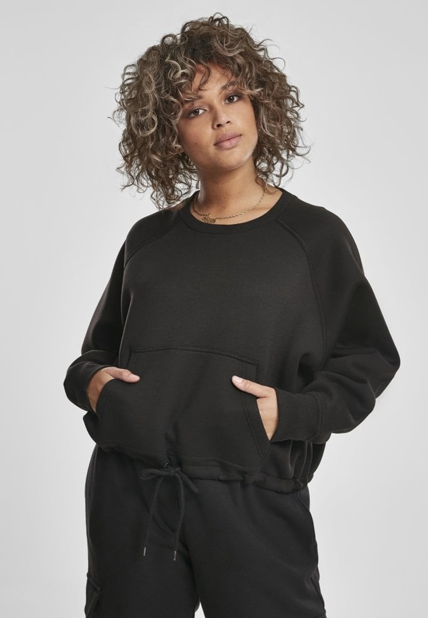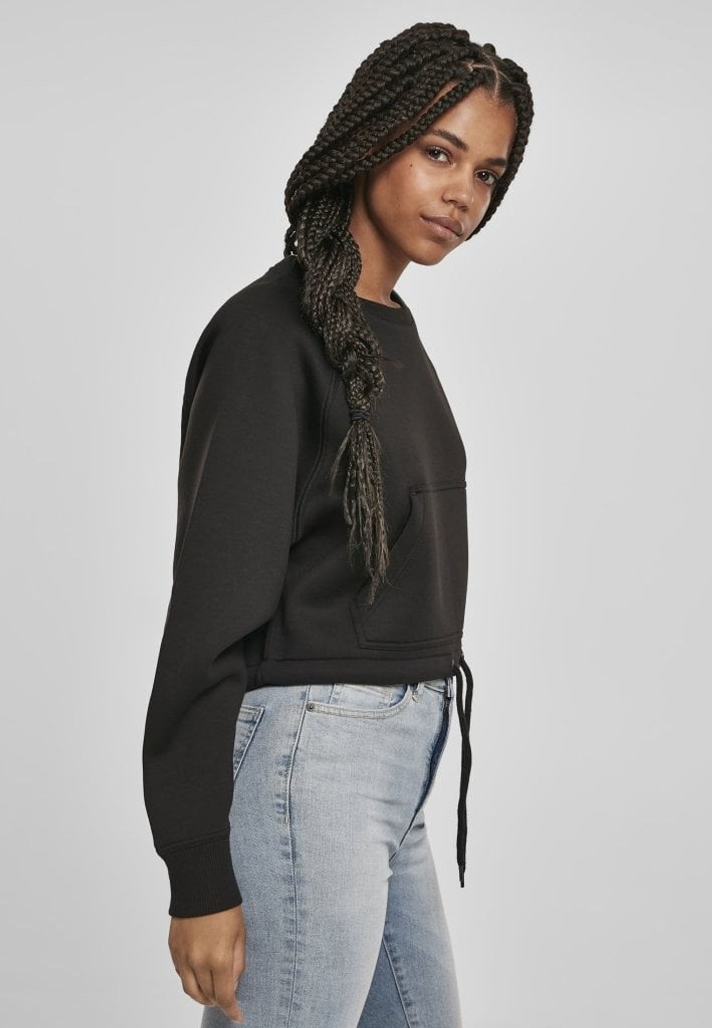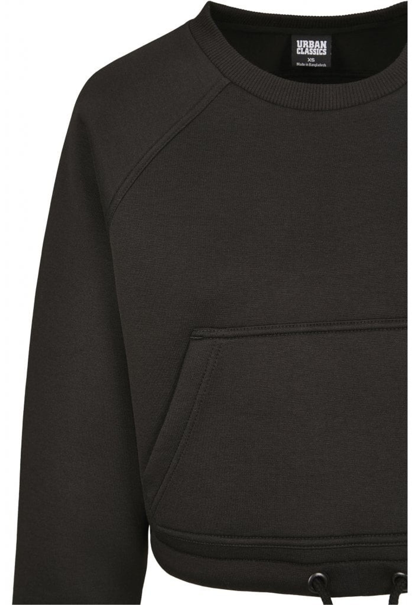 Detta är en kort sweatshirt med raglanarmar och en dragsko nertill.