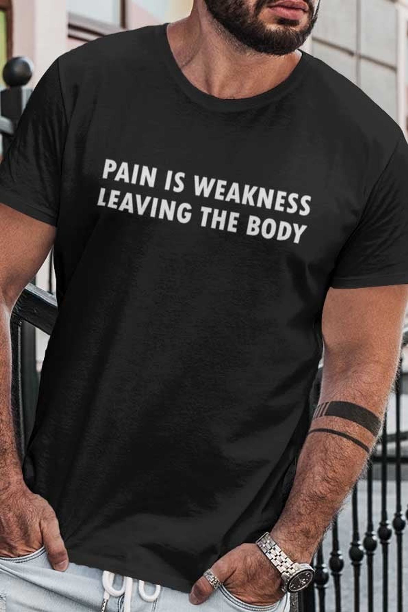Uppgradera din stil med vår kraftfulla "Pain is Weakness Leaving the Body" T-shirt, en påminnelse om att smärta är en del av processen att bli starkare och bättre. Detta inspirerande citat, ofta förknippat med Navy SEALs och andra elitstyrkor, fungerar som en ständig motivation att pressa dig själv och övervinna hinder.