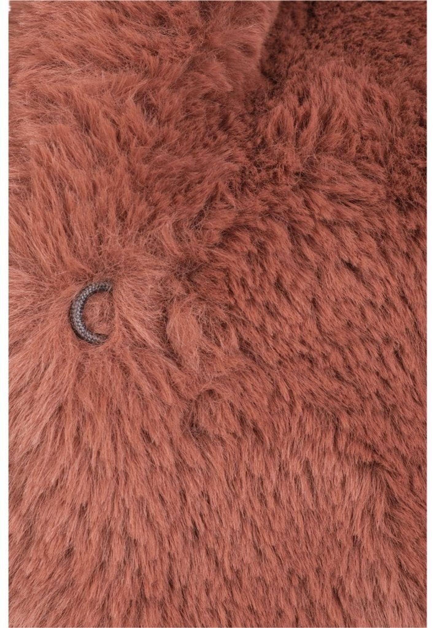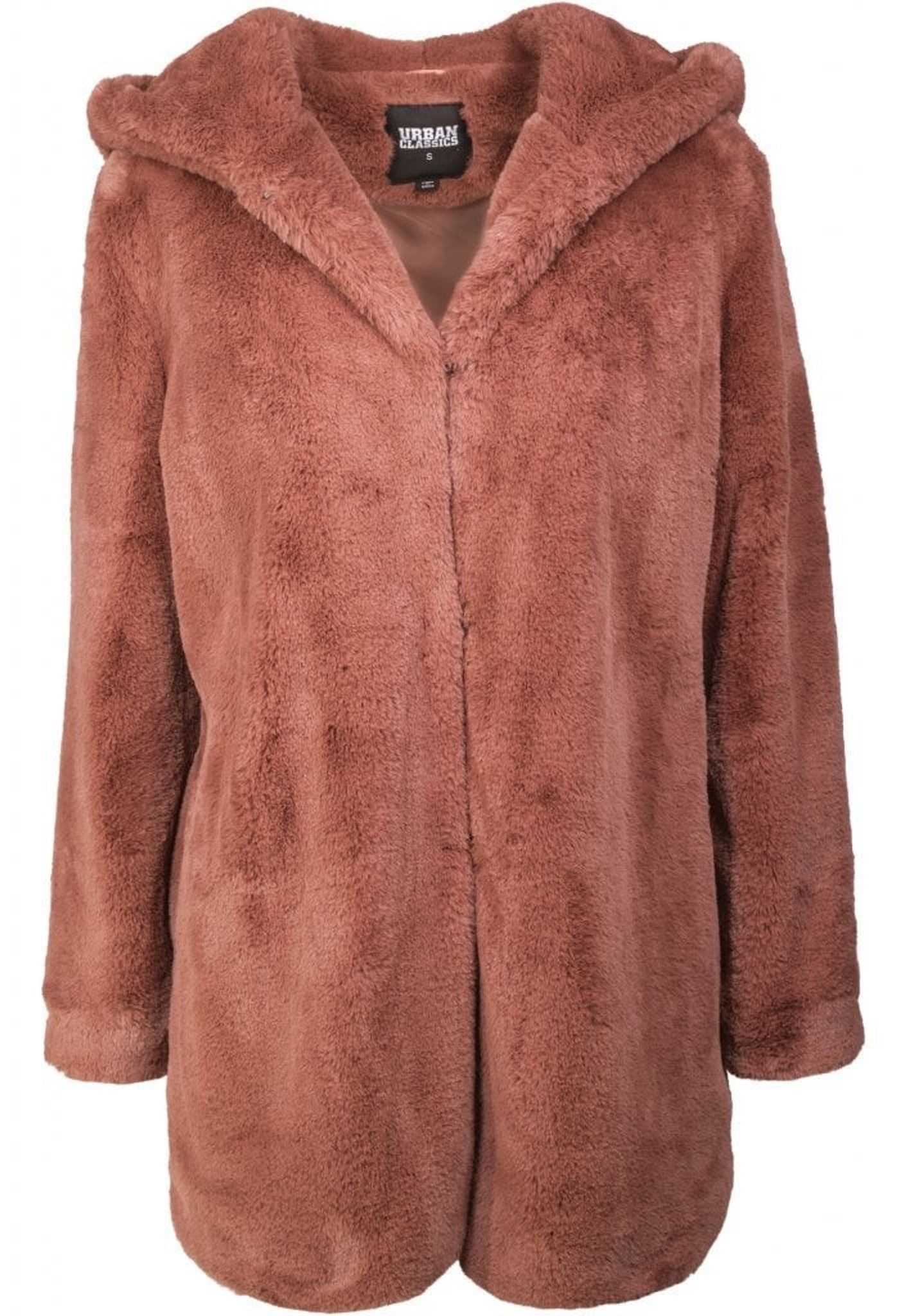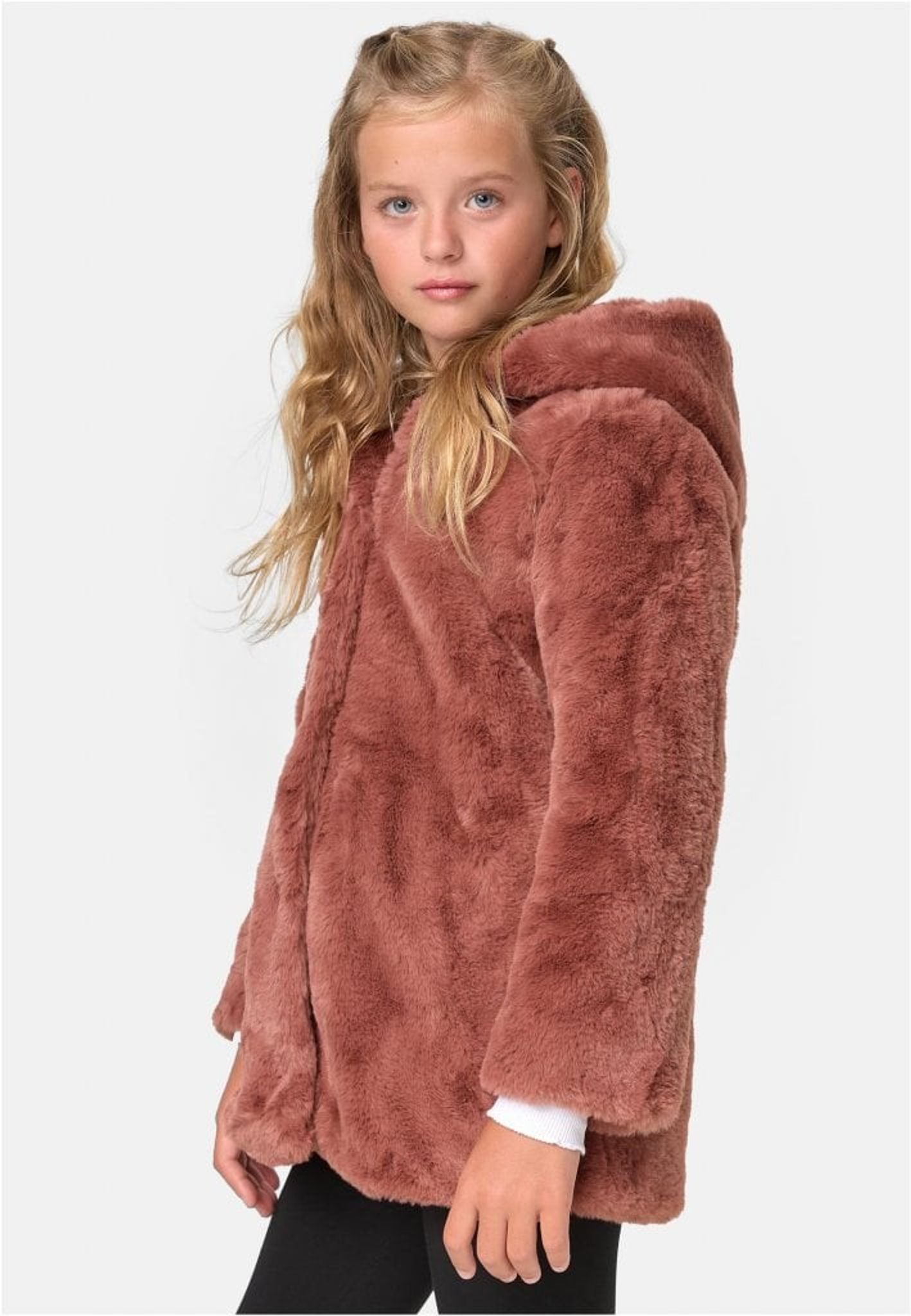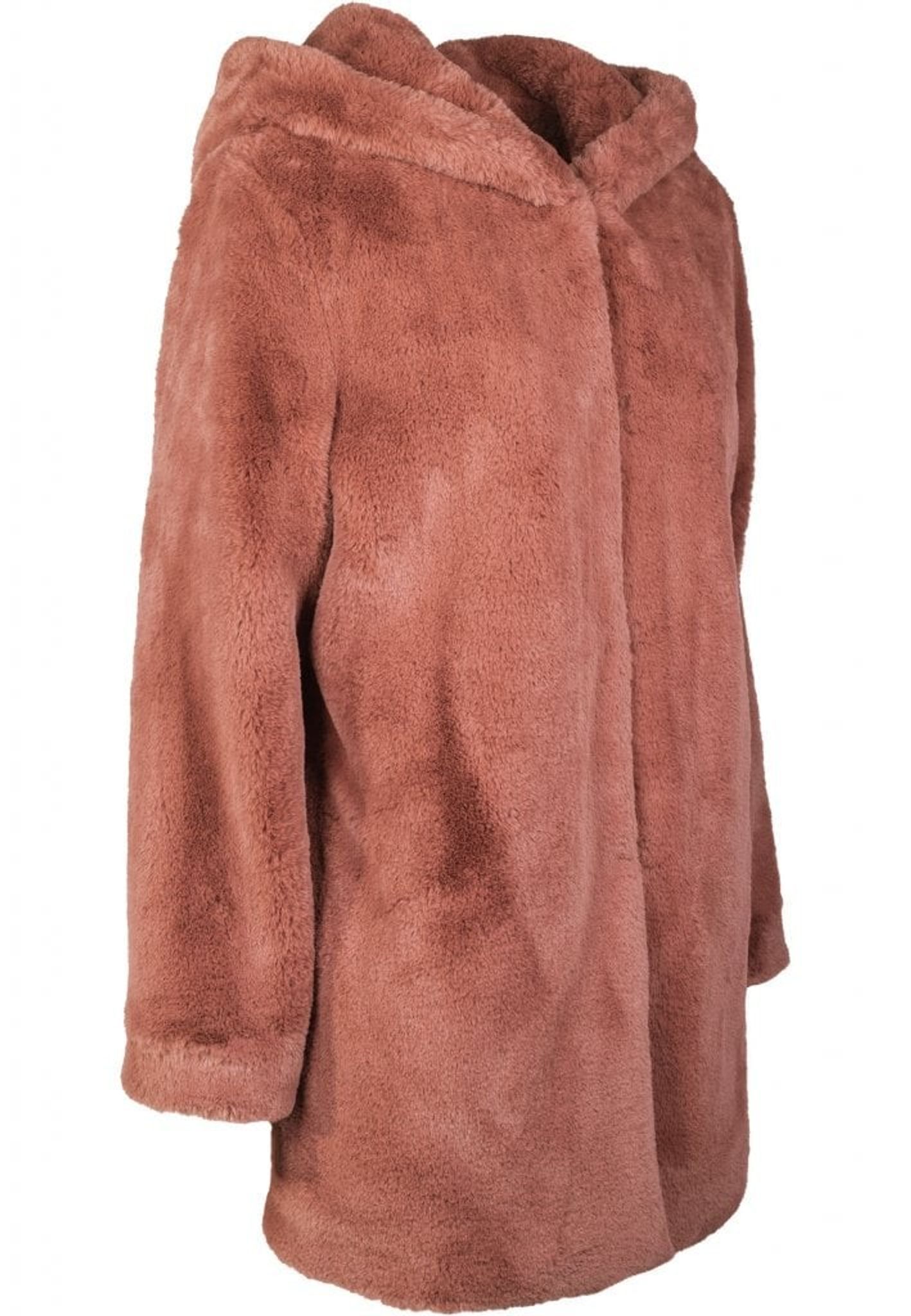 En mörkrosa kappa i konstpäls. Pälsen är fluffig och mjuk, vilket ger en elegant look. Kappan är försedd med en stor huva som går i samma härliga päls. Insidan av jackan är klädd i blankt polyesterfoder.