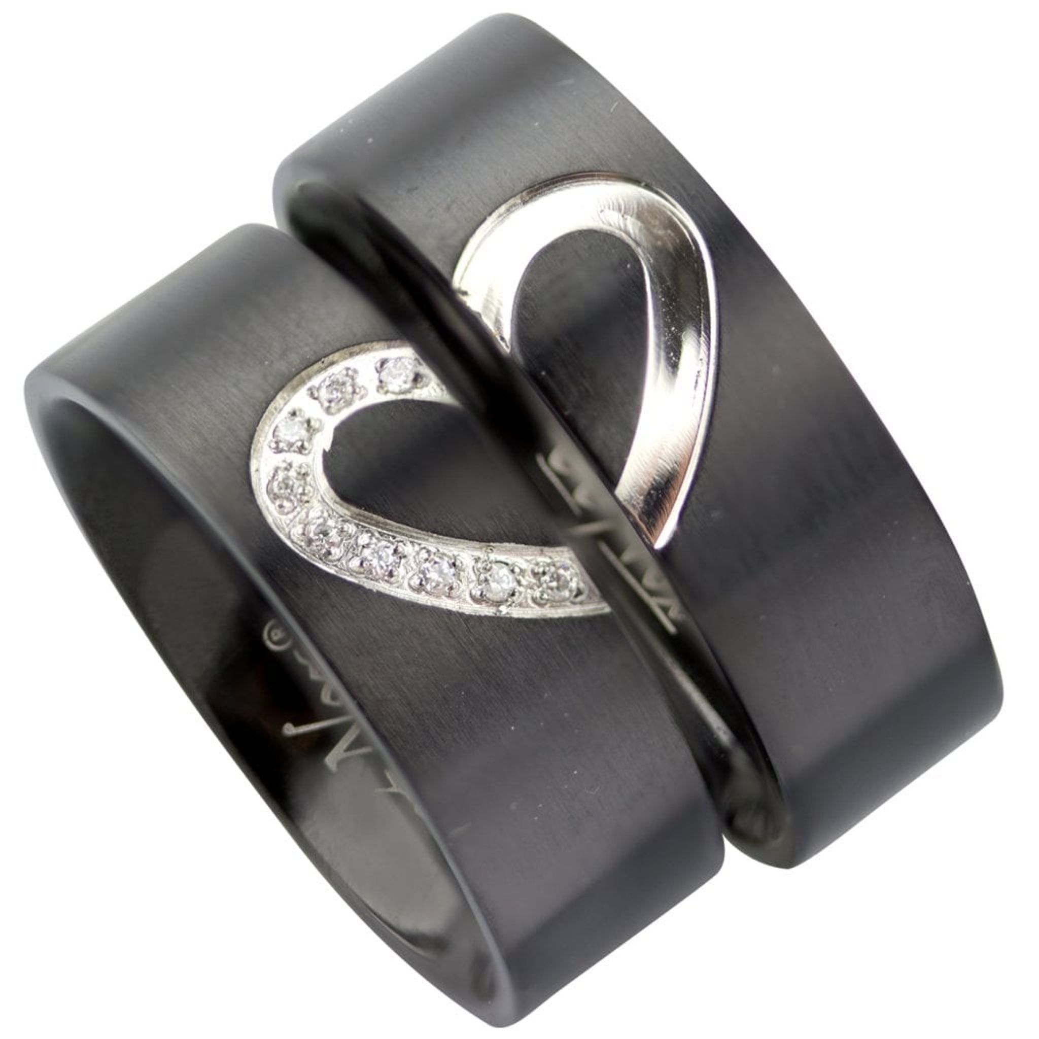Två svarta ringar med gravering som när ringarna sätts samman bildar ett hjärta.