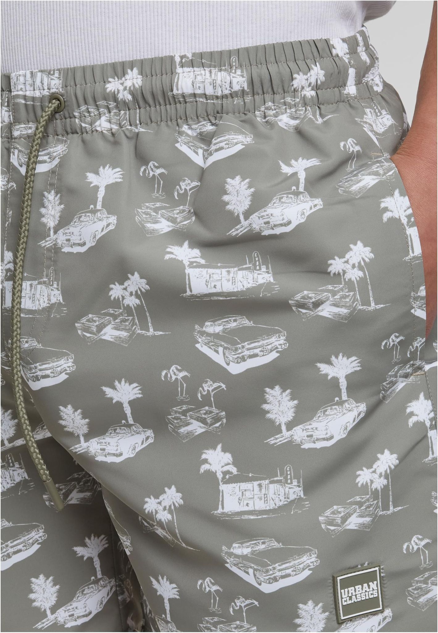 Ta med dig känslan av frihet och äventyr med våra Pattern Swim Shorts i en stilren blekoliv och vit färgkombination. Dessa badshorts är prydda med ett smakfullt och roligt mönster av palmer, retro bilar och surfscener, vilket ger en extra touch av karaktär och inspiration för sommarens alla stunder.