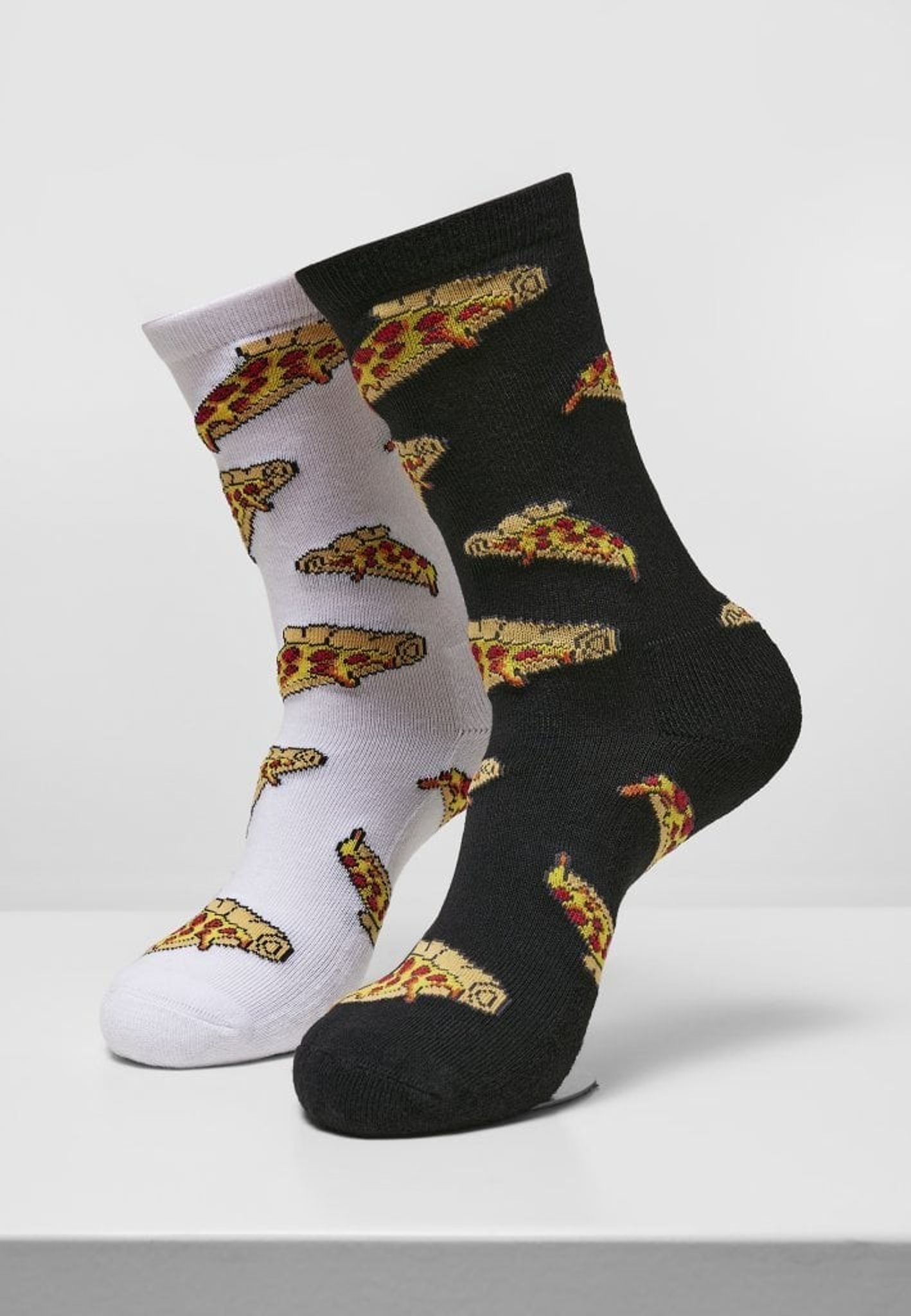 Tuffa strumpor med pizzabitar tryckta runtom. I paketet ingår ett par svarta och ett par vita strumpor.
