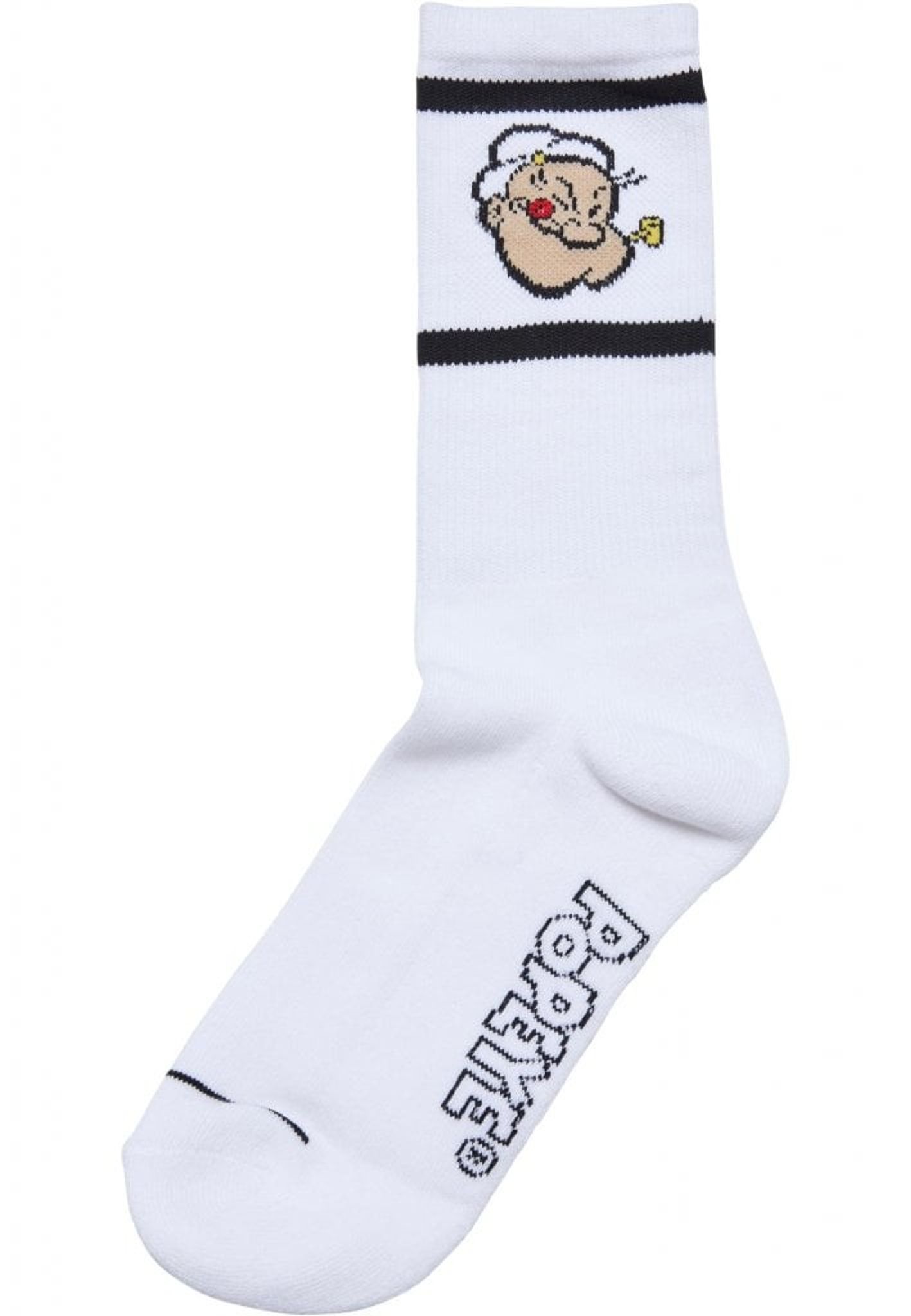 Båda motiven är ytterligare ramade av två ränder och en ytterligare Popeye-bokstav ingår på sulan. Strumporna är vadmalslånga och utrustade med elastiska manschetter och ribbade skaft.