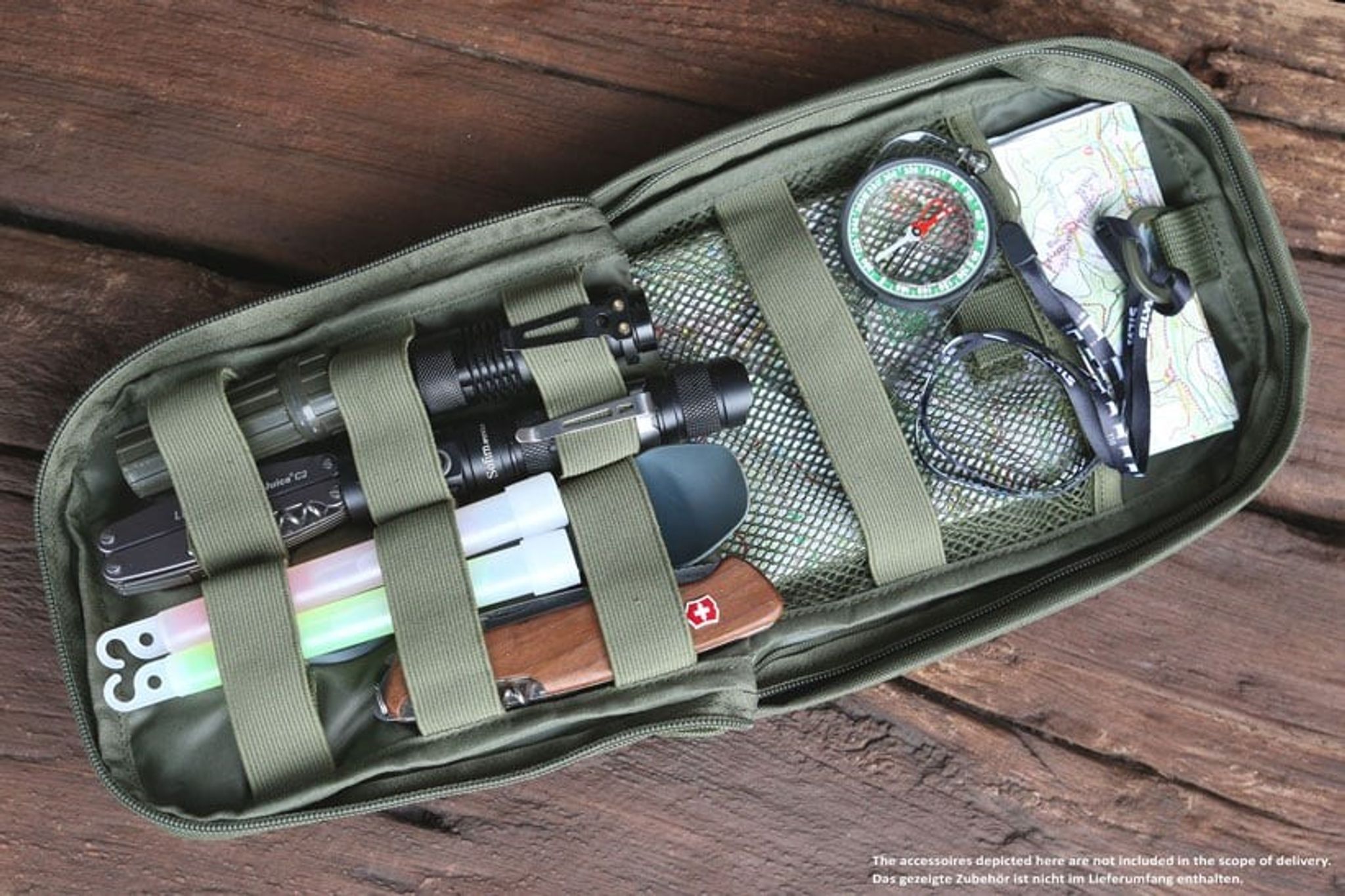 En funktionell väska som går att använda som modul på te.x. ryggsäck med MOLLE-system. Väskan har sju elastiska band som med kan användas för att fixera saker i packningen. Inuti finns även en D-ring för att fästa fast nycklar, kompass eller liknande i. Det finns även en ficka i nättyg som stängs med kardborreband.