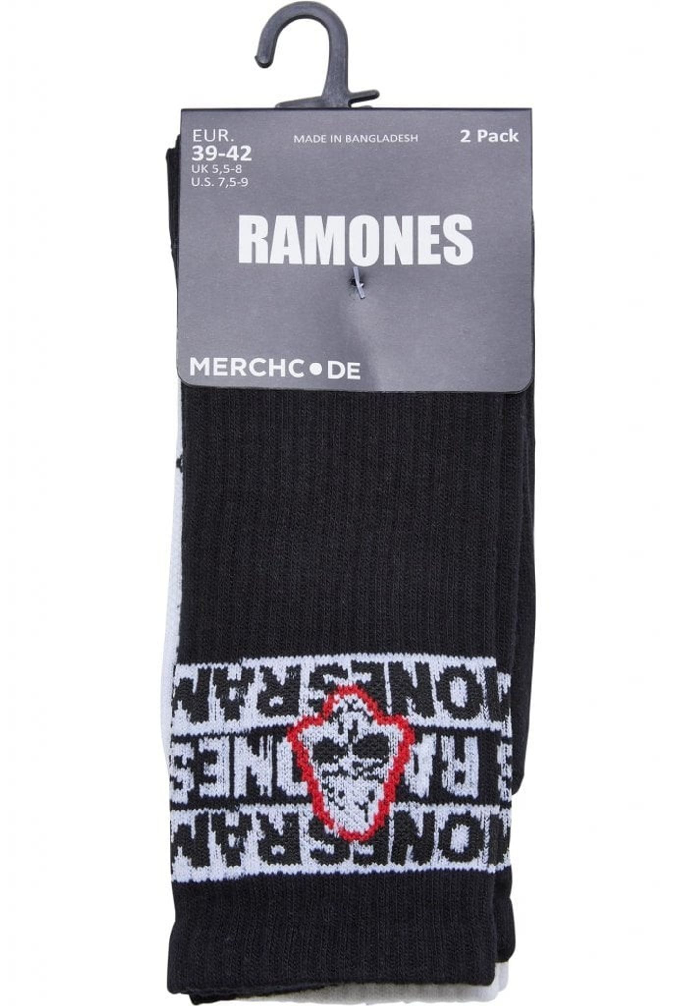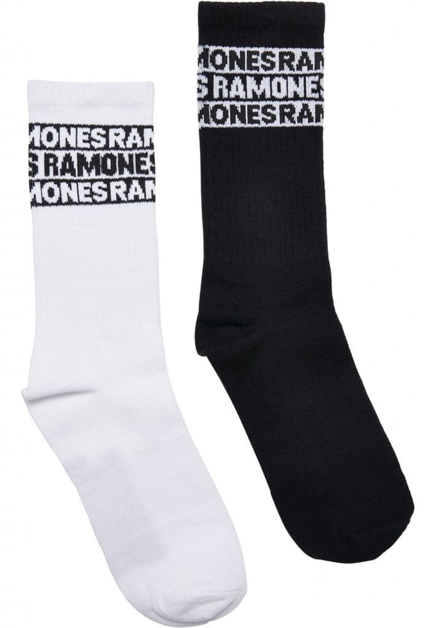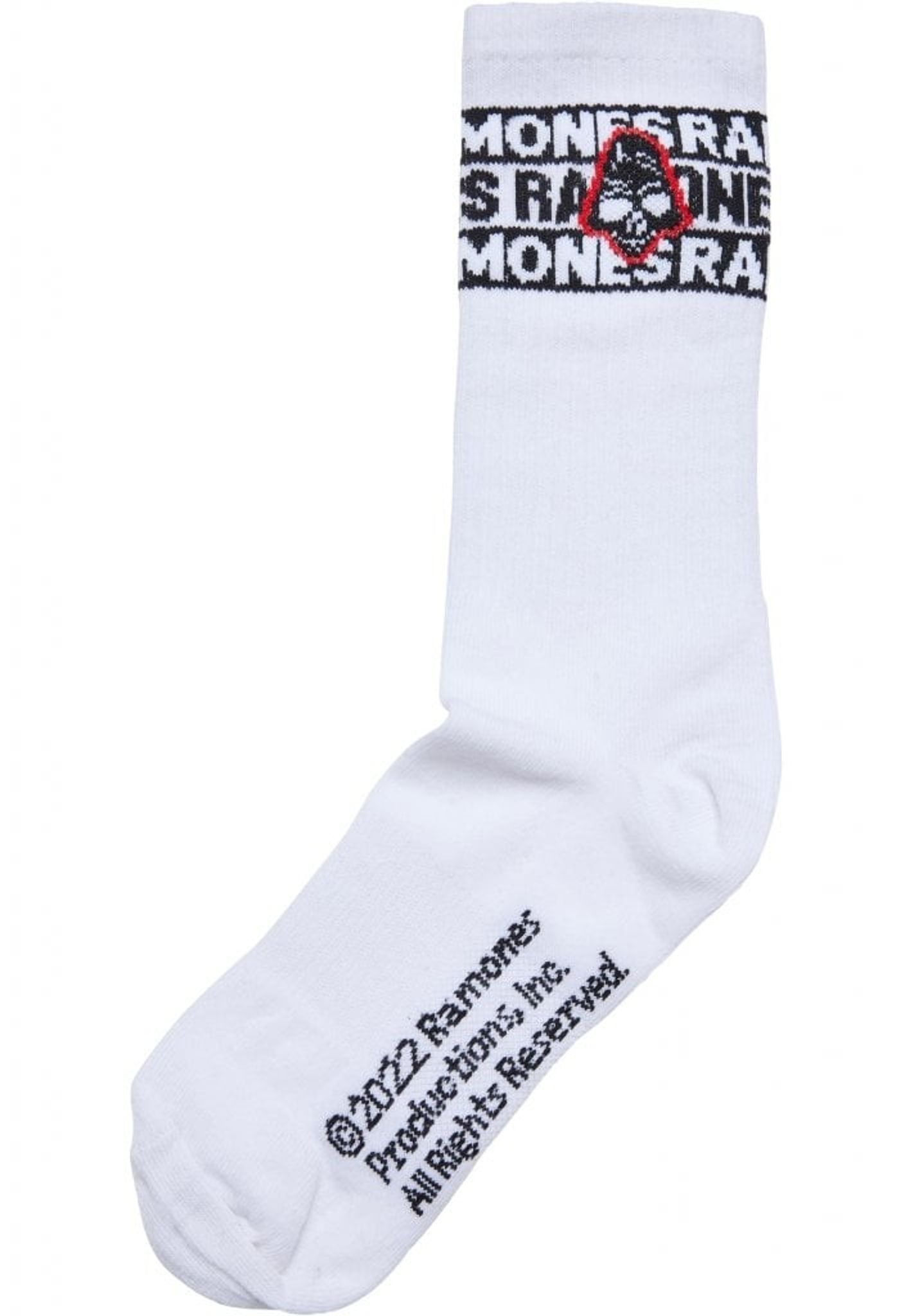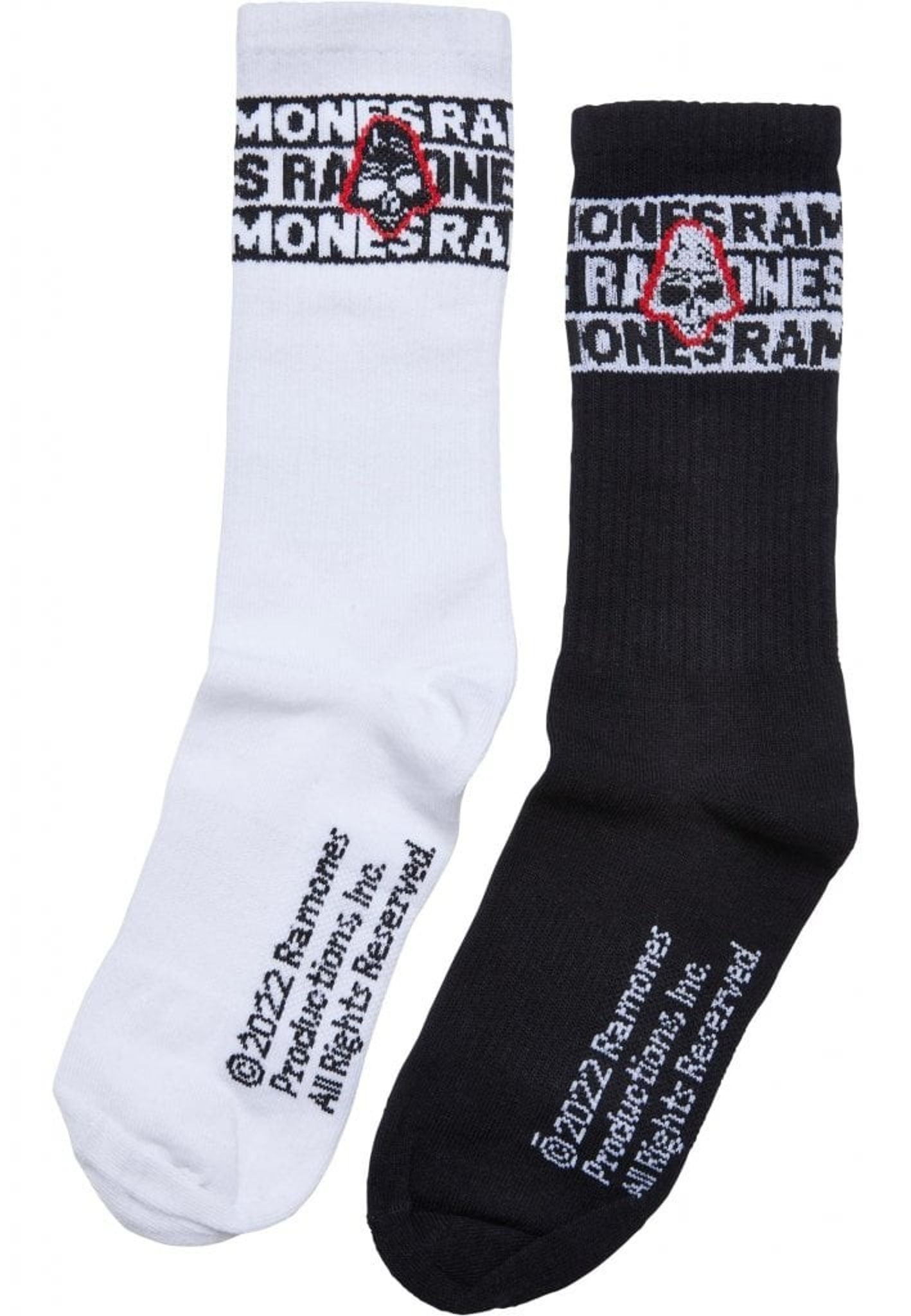 Med en trefaldig löpande Ramones-bokstavsdesign runt skaften gör detta kraftfulla tvåpack strumpor i två olika designs ett rockigt statement. Ovanpå en rödramad dödskalle skymtar ovanför bokstäverna. Optimalt bärkomfort säkerställs av vadlånga ribbade skaft med elastiska manschetter och det använda tyget bestående av bomull, polyester och elastan. Ramones-strumporna finns i fyra olika storlekar.