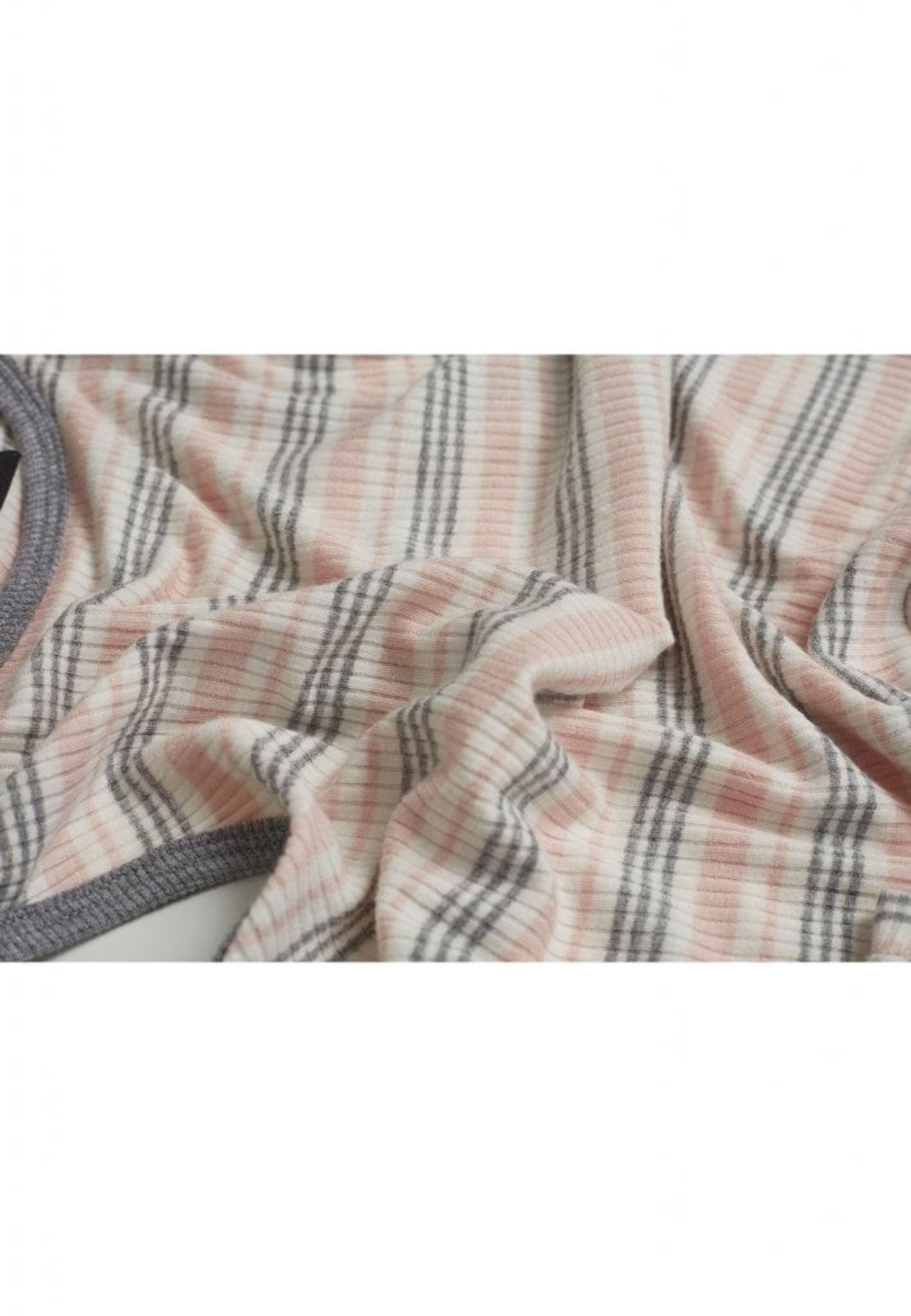 Hals och armar har en kant i avvikande färg och nederkanten har en dubbel stickad söm.