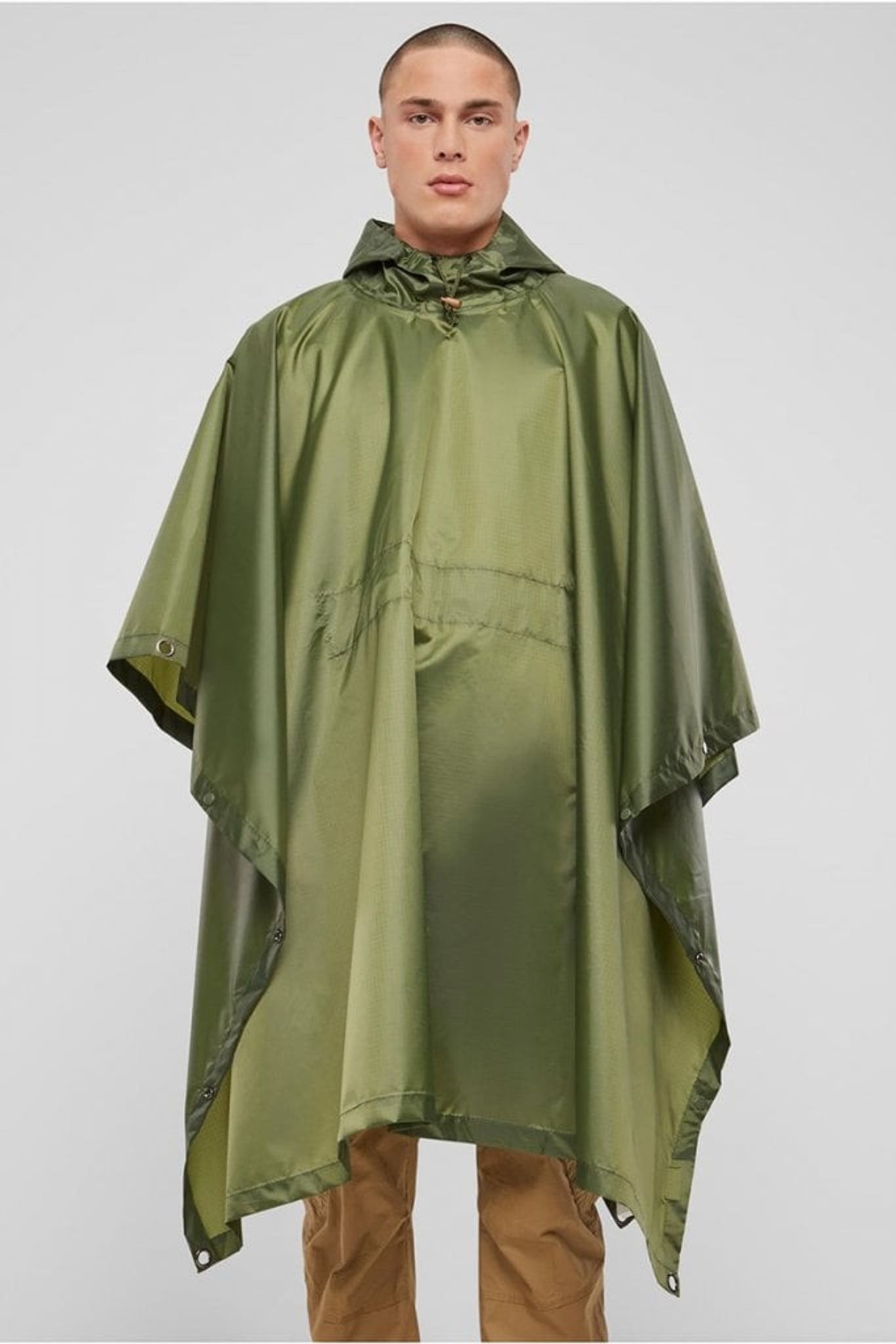 Ponchon är utrustad med knappar längs sidorna som håller ihop ponchon nedtill samt en dragsko vid halsen där du kan dra åt för att inte vid och regn ska leta sig in vid ansiktet.