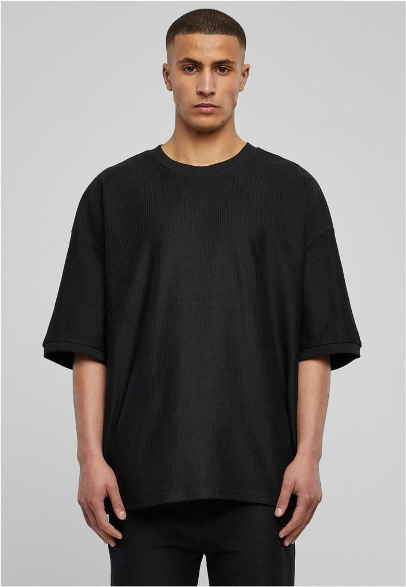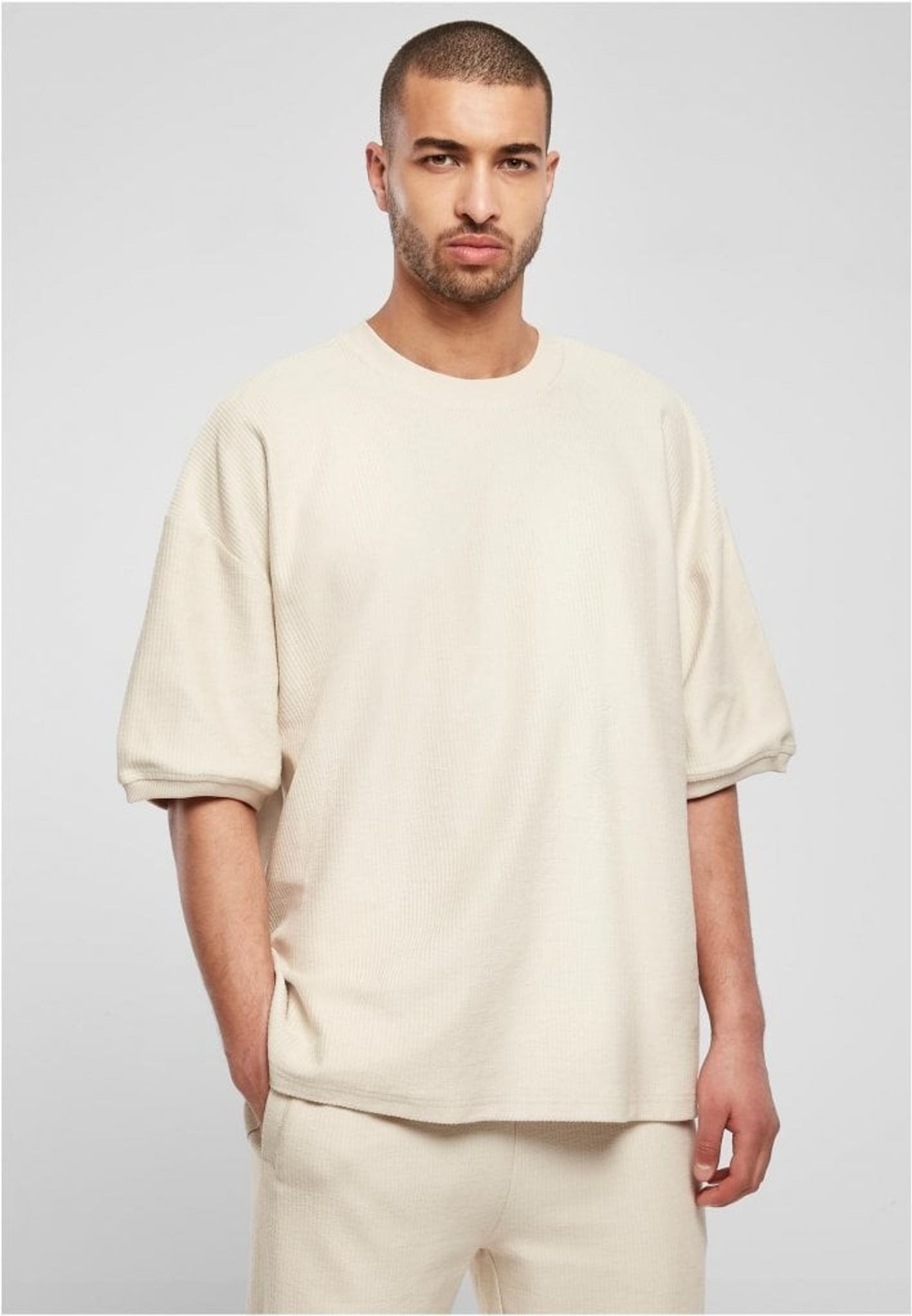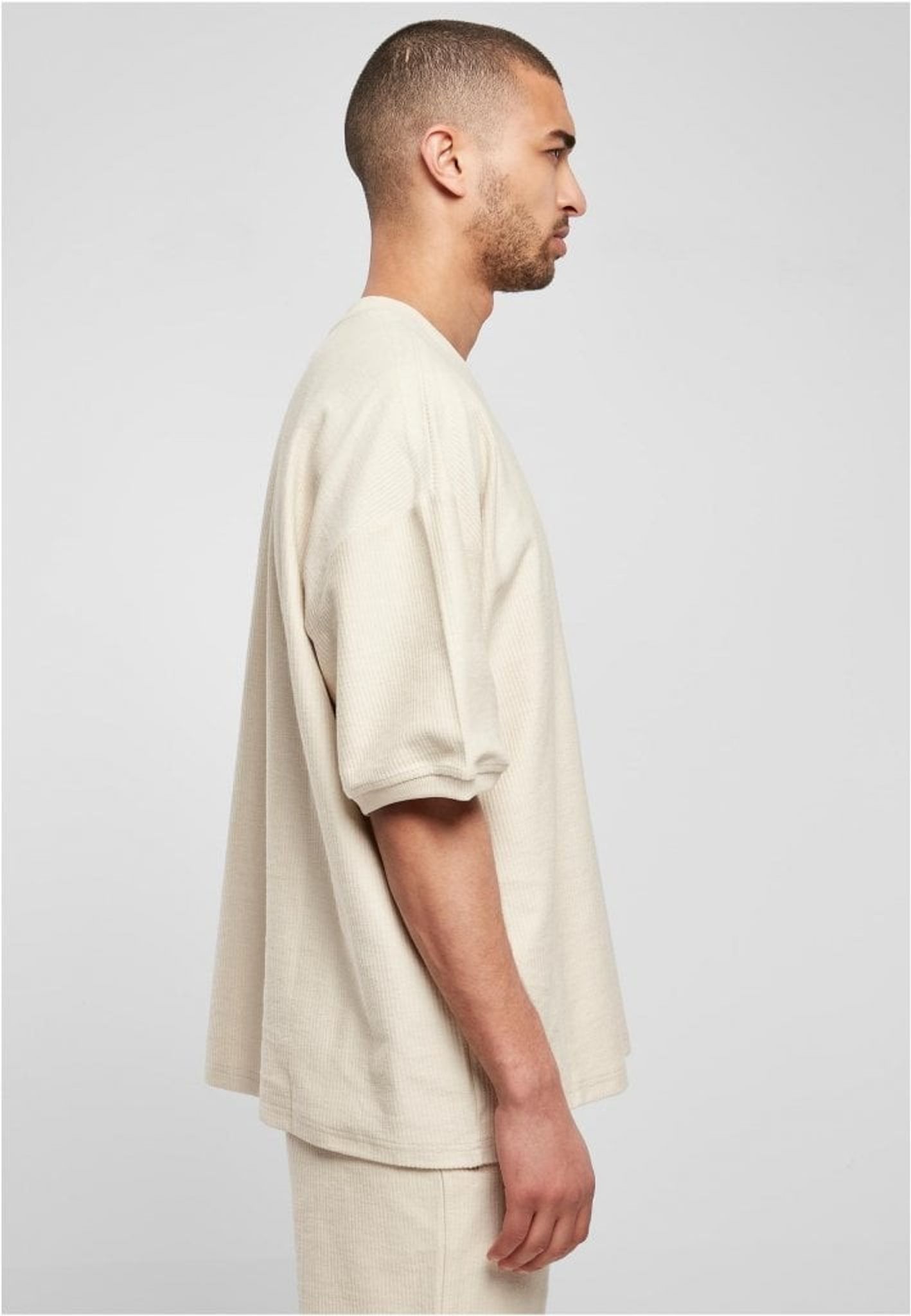 En modern herr t-shirt med en bekväm oversize/boxig passform som visar breda, avslappnade axlar och ett himmelskt mjukt bomullstyg i ribbstickad frotté. Rund halsringning och högkvalitativa ärmslut kompletterar denna gedigna herrmode.