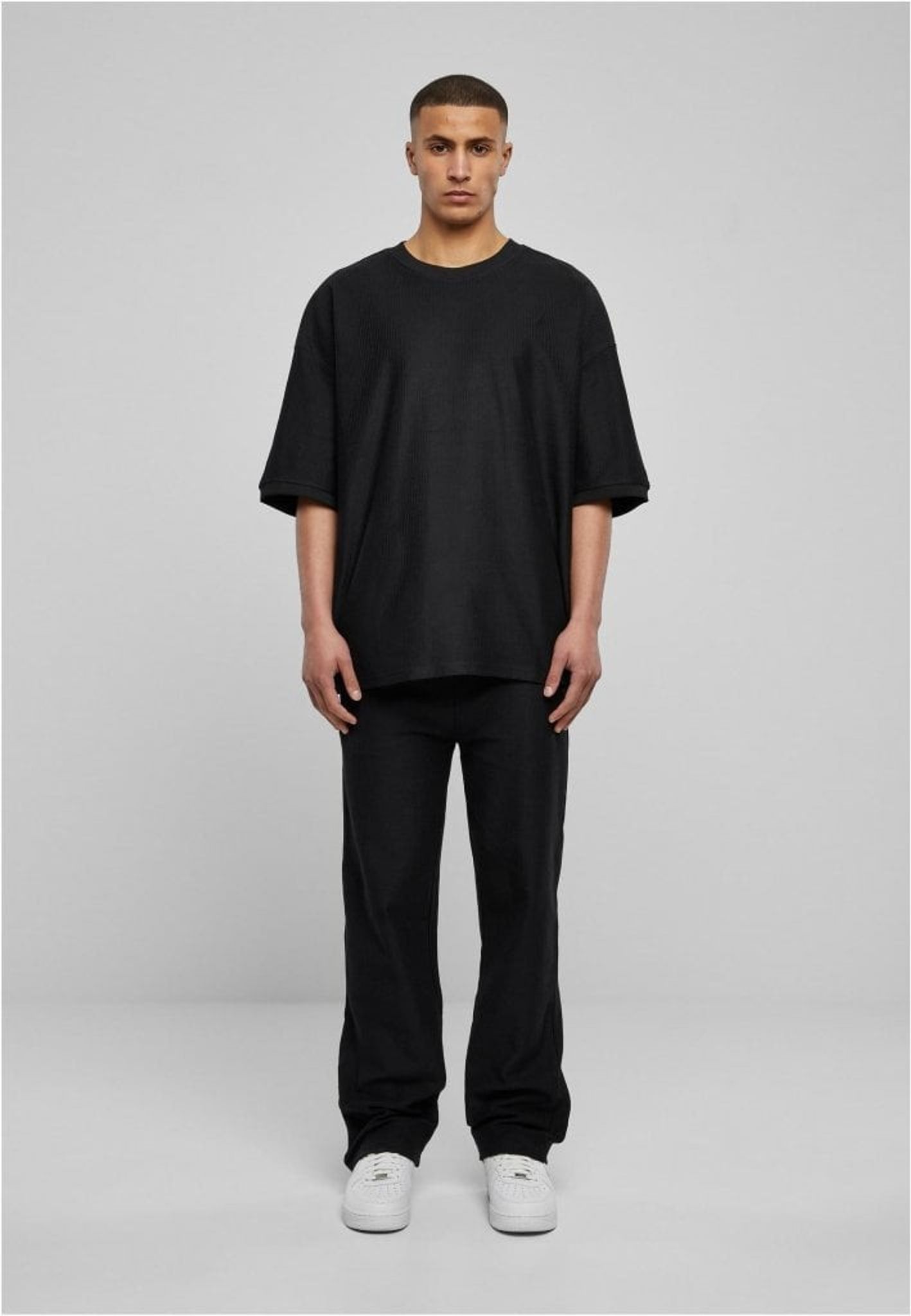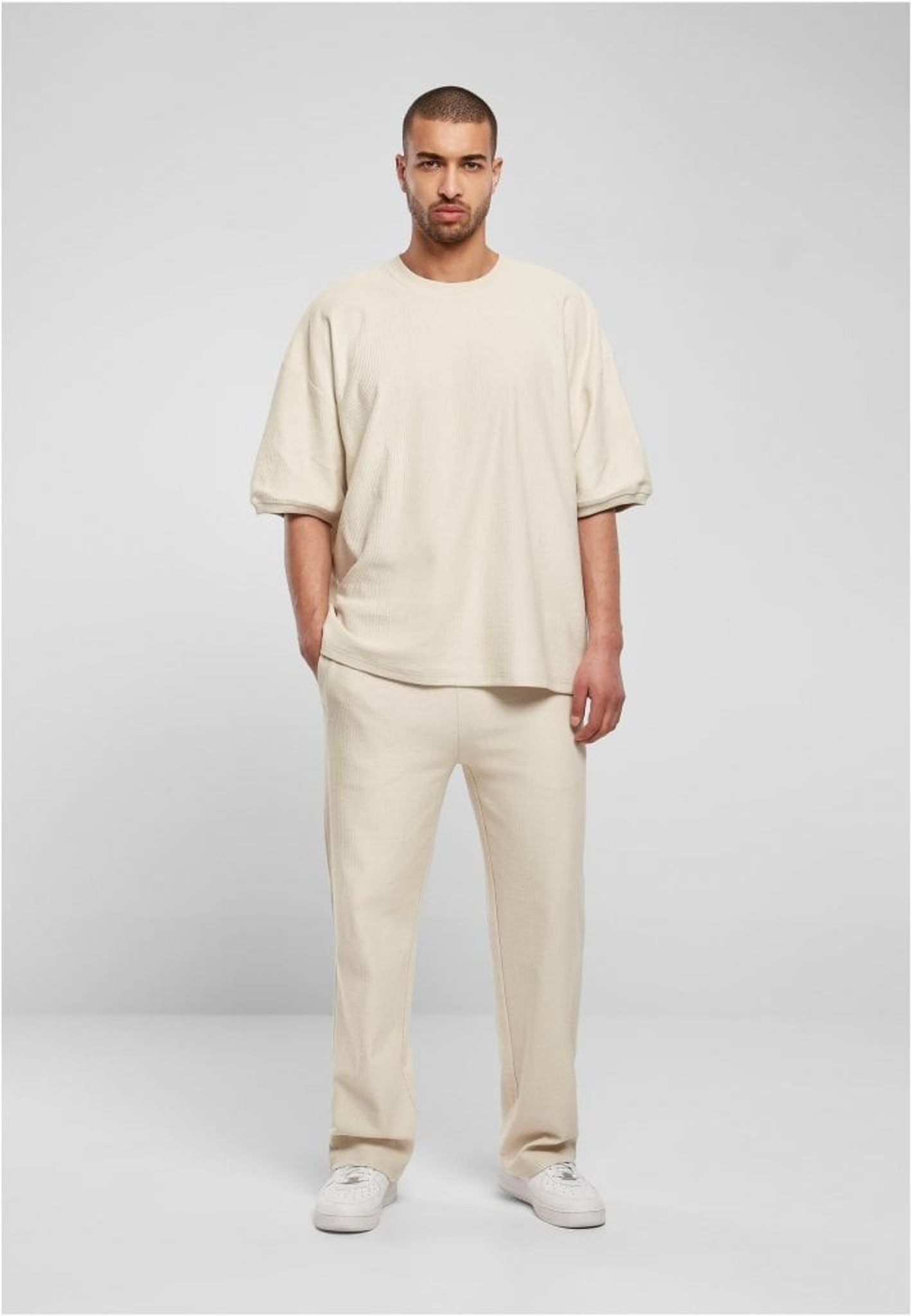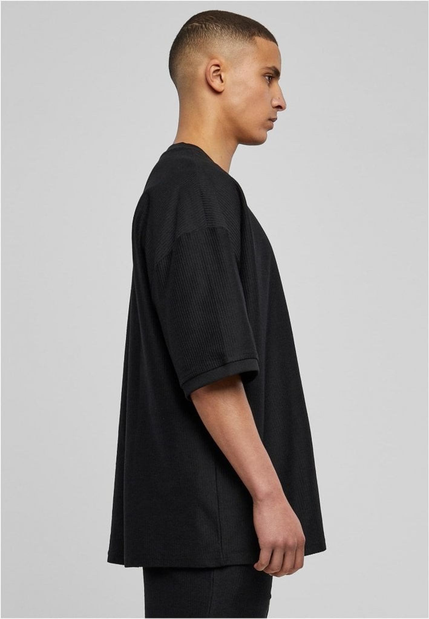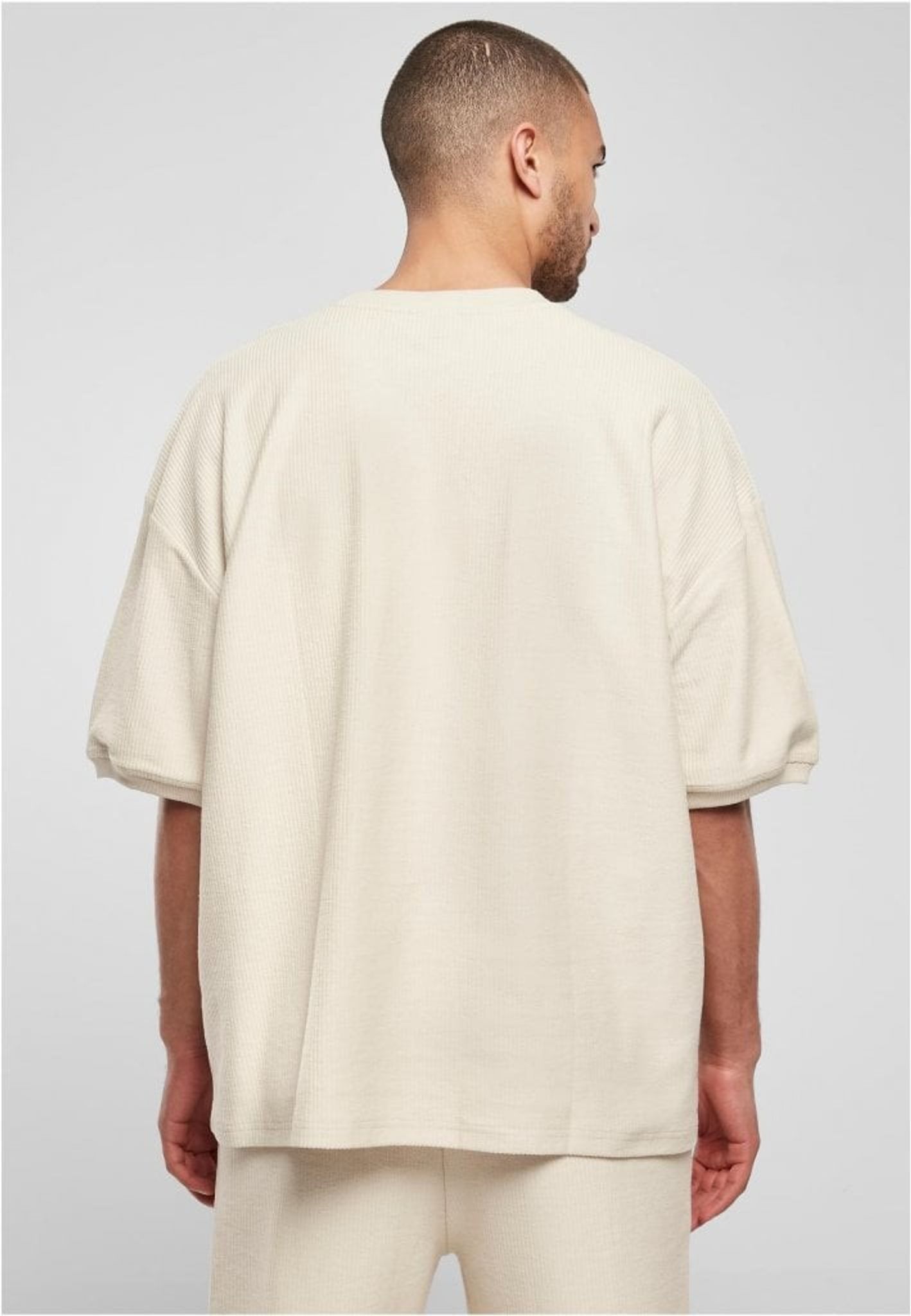 En modern herr t-shirt med en bekväm oversize/boxig passform som visar breda, avslappnade axlar och ett himmelskt mjukt bomullstyg i ribbstickad frotté. Rund halsringning och högkvalitativa ärmslut kompletterar denna gedigna herrmode.