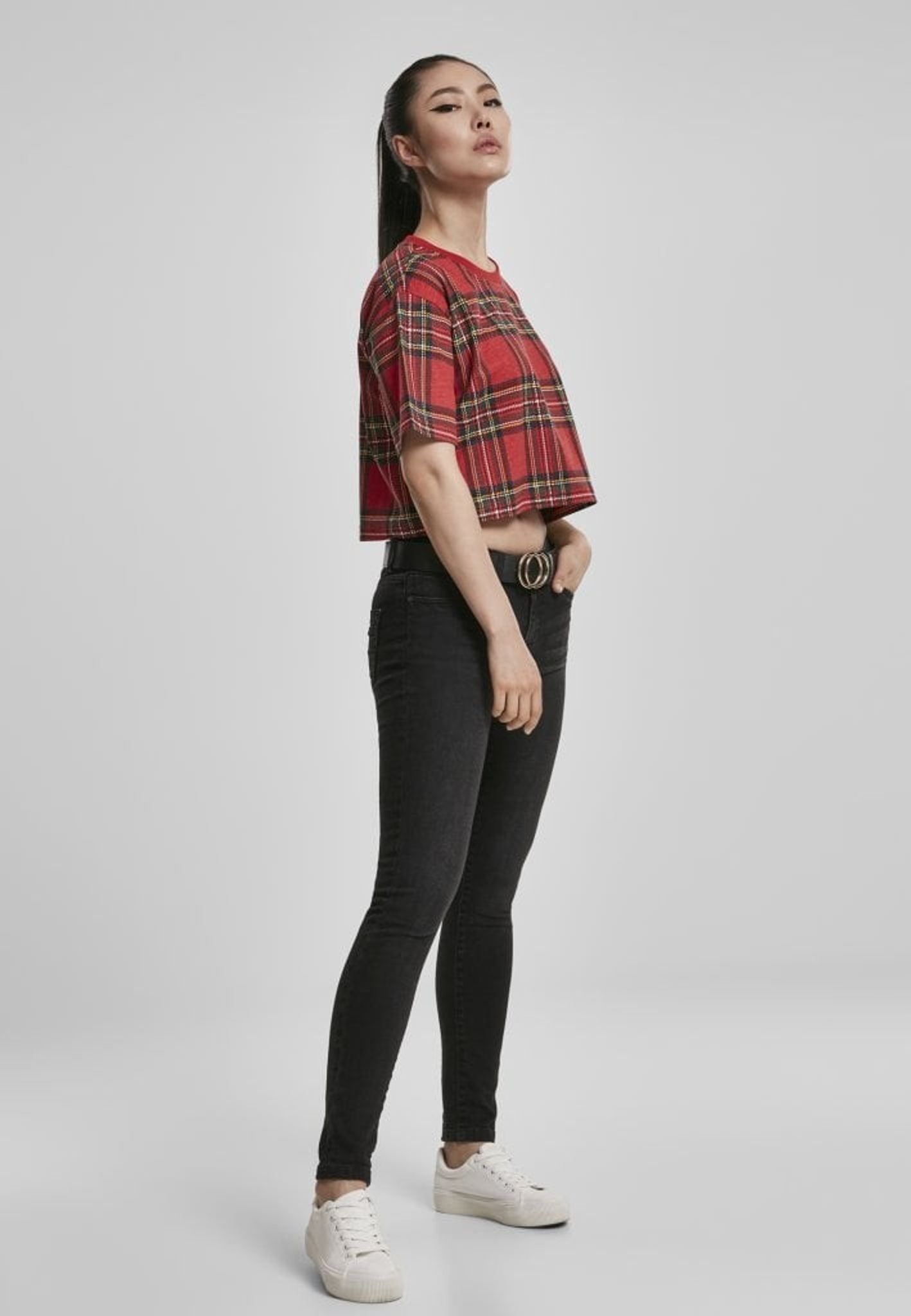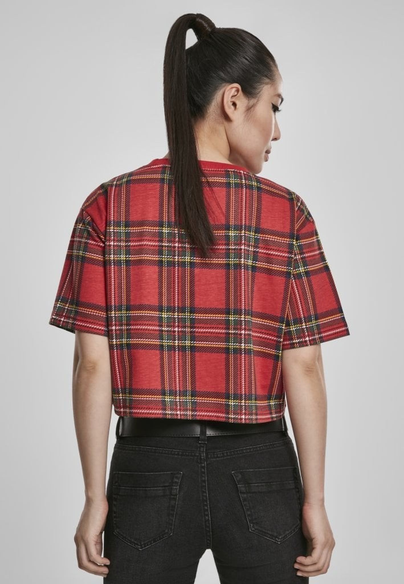 Modellen är kort och vid på denna topp och magtröjan har ett härligt rött rutigt mönster.