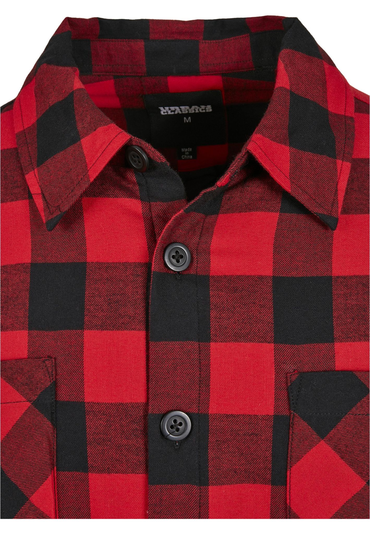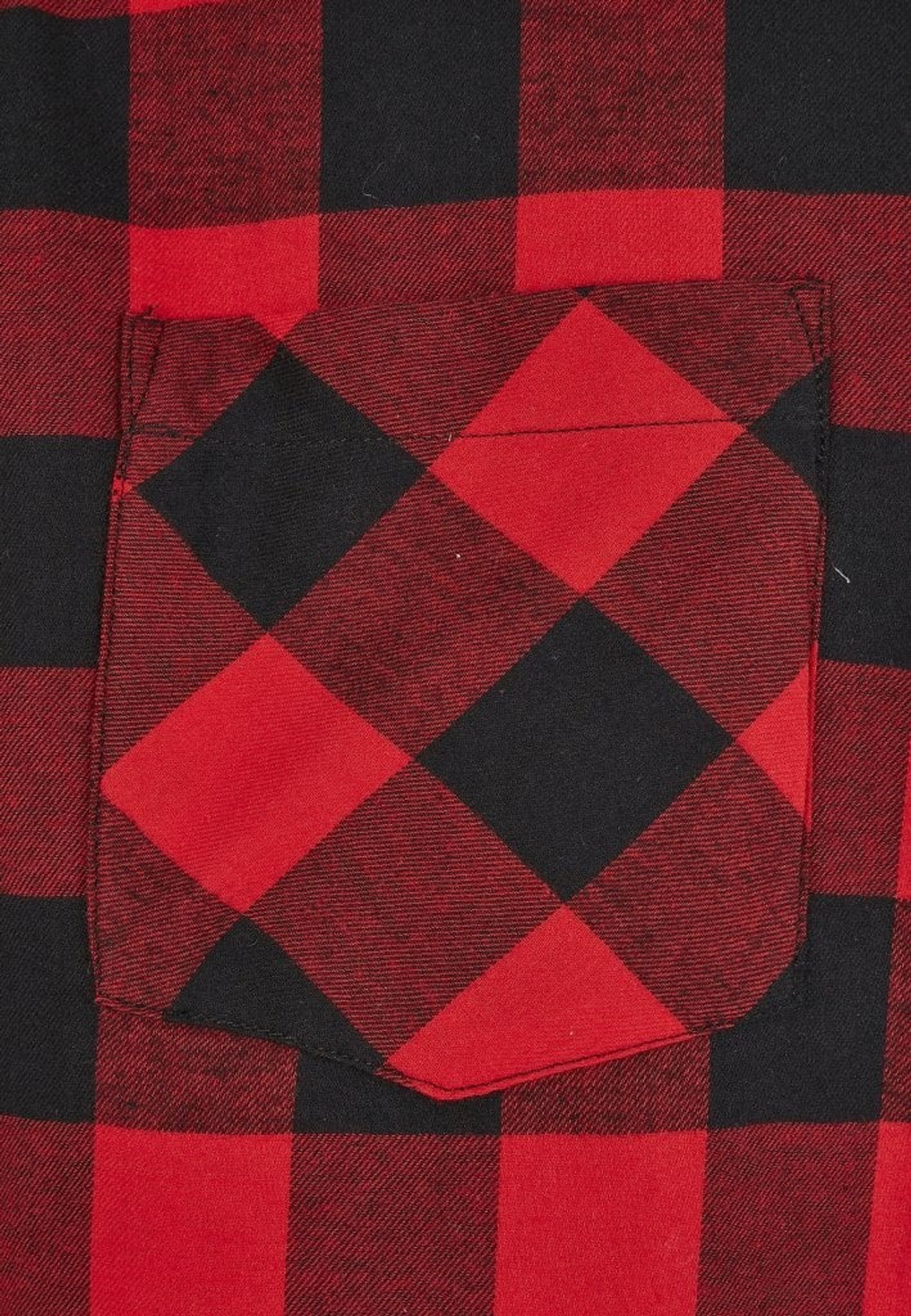 - Mönster: röda och svarta rutor över hela skjortan