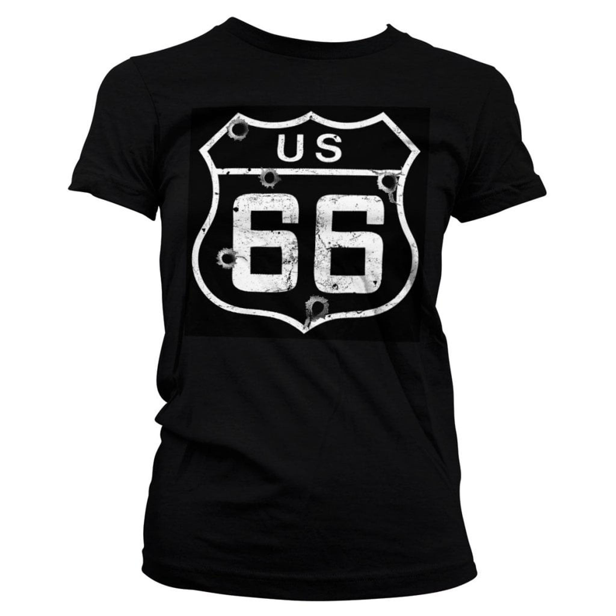 Har du alltid drömt om att se tuff och cool ut samtidigt som du bär på historien om den ikoniska Route 66? Då är den här T-shirten perfekt för dig! Med en skottskadad och sliten Route 66-logotyp tryckt på bröstet kan du visa upp ditt mod och din kärlek till den legendariska vägen.