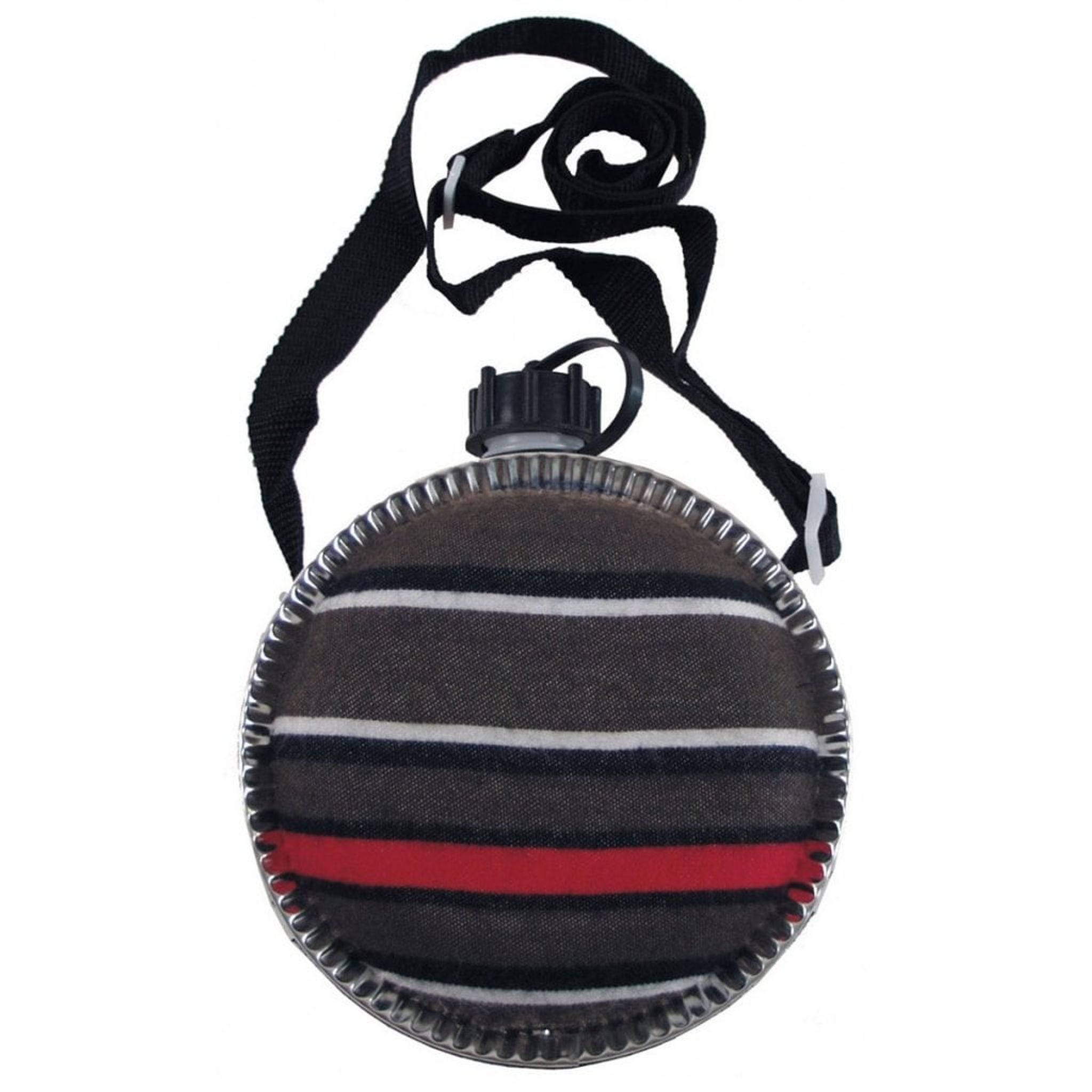 En rund vattenflaska med filtfodral och avtagbart samt justerbart axelband.