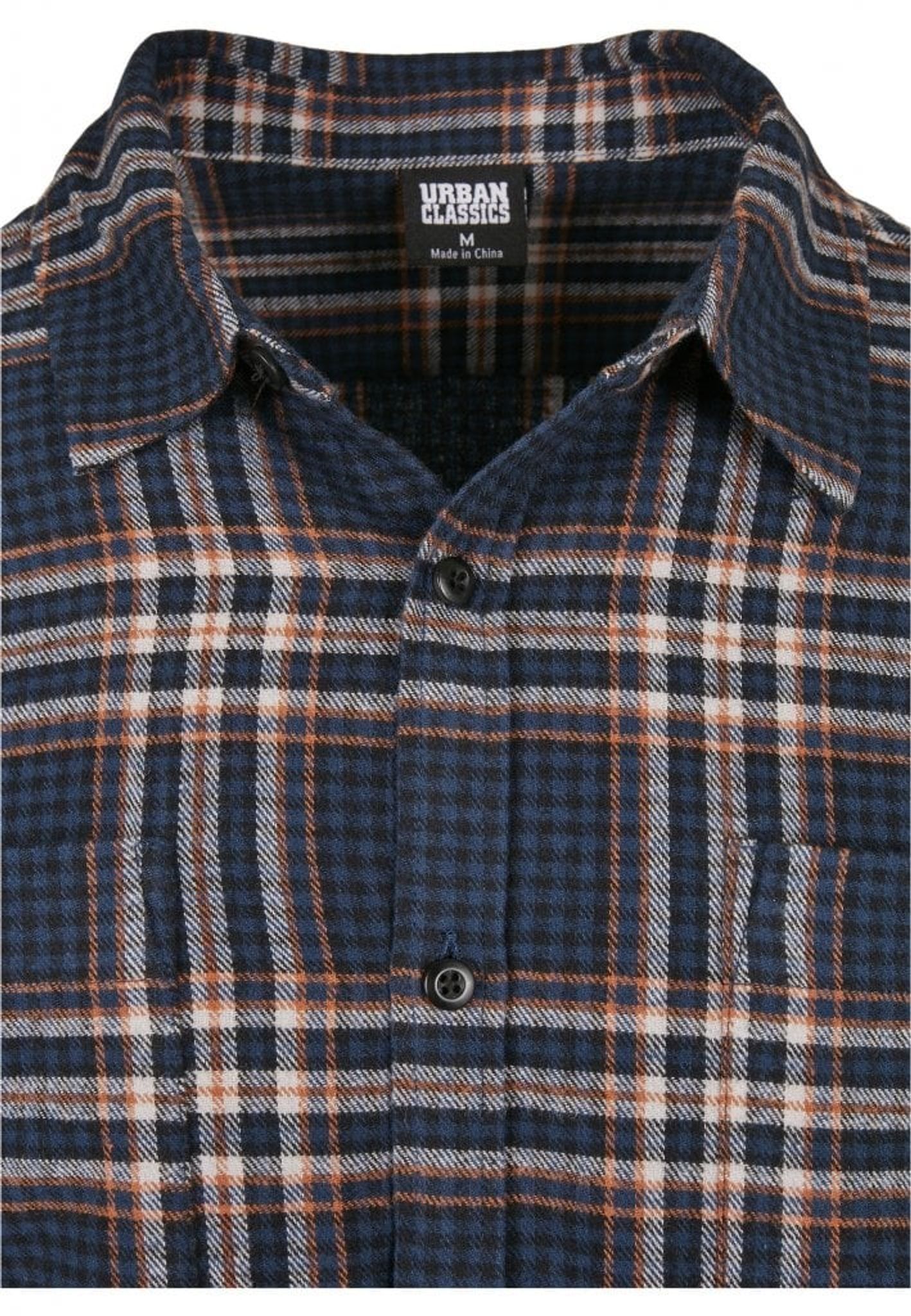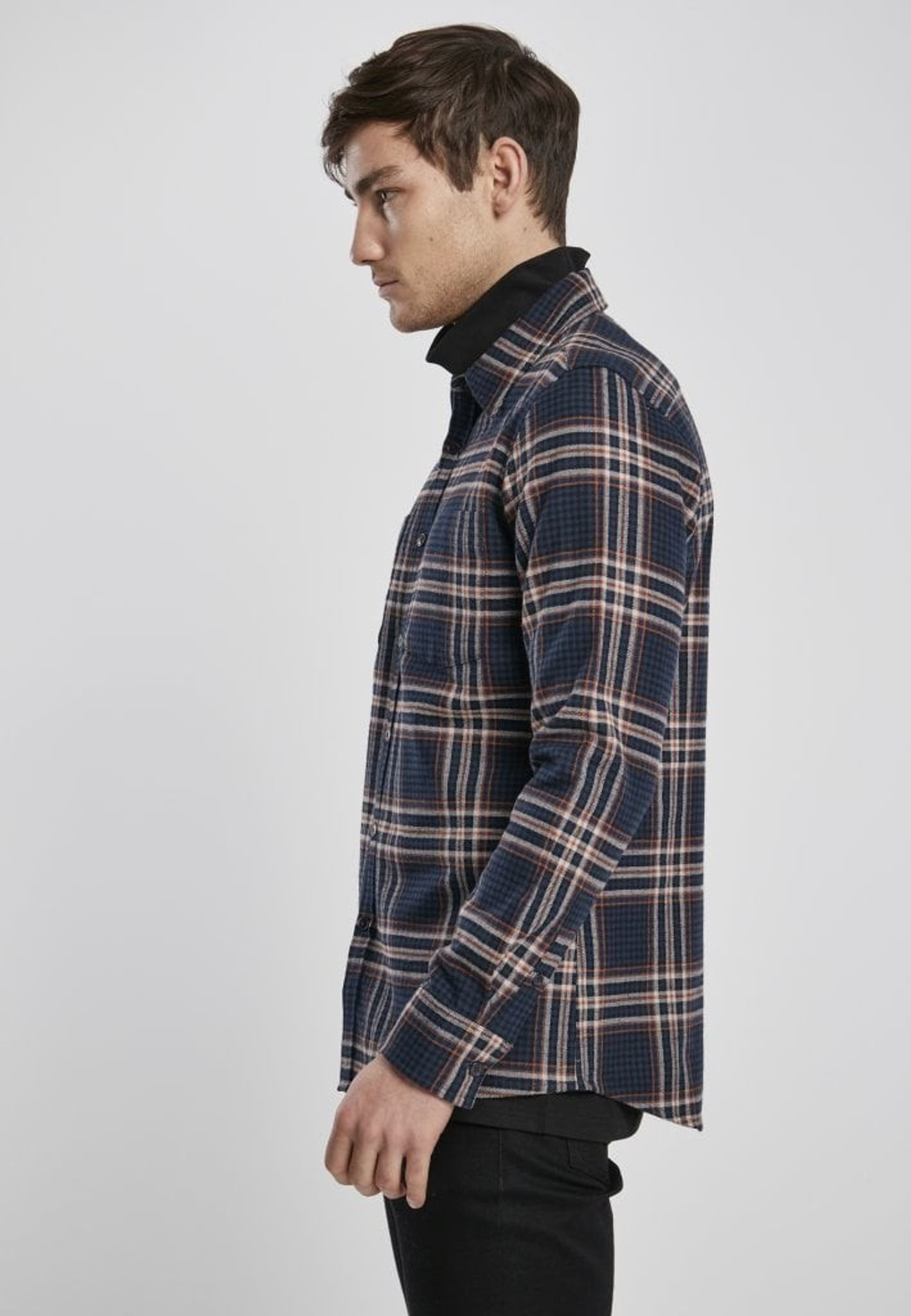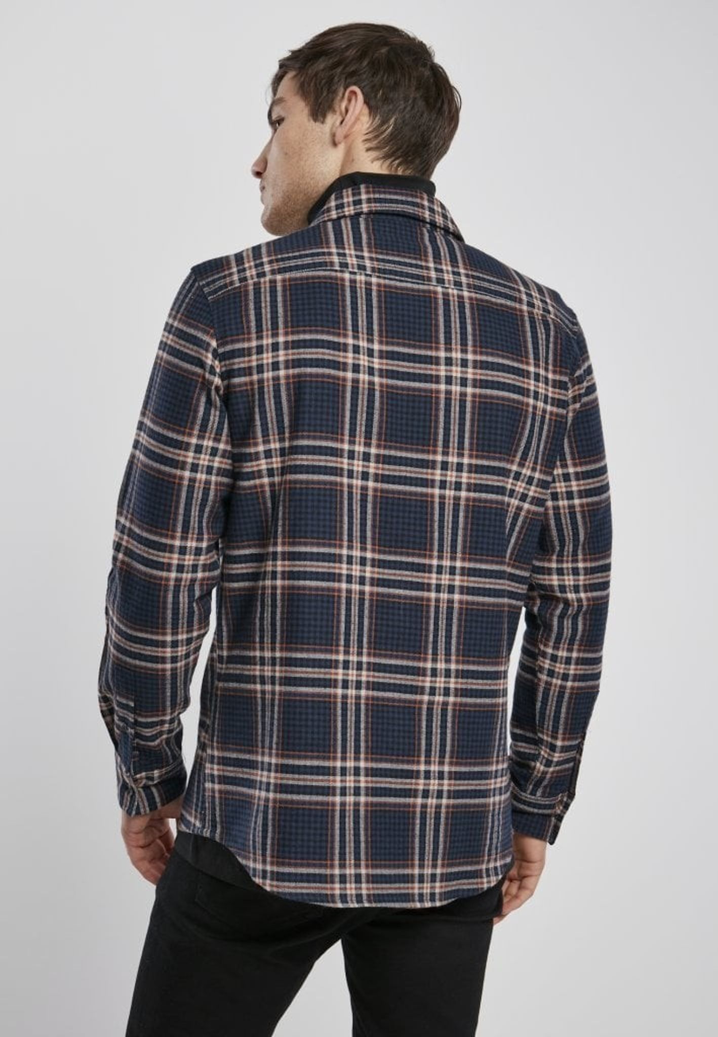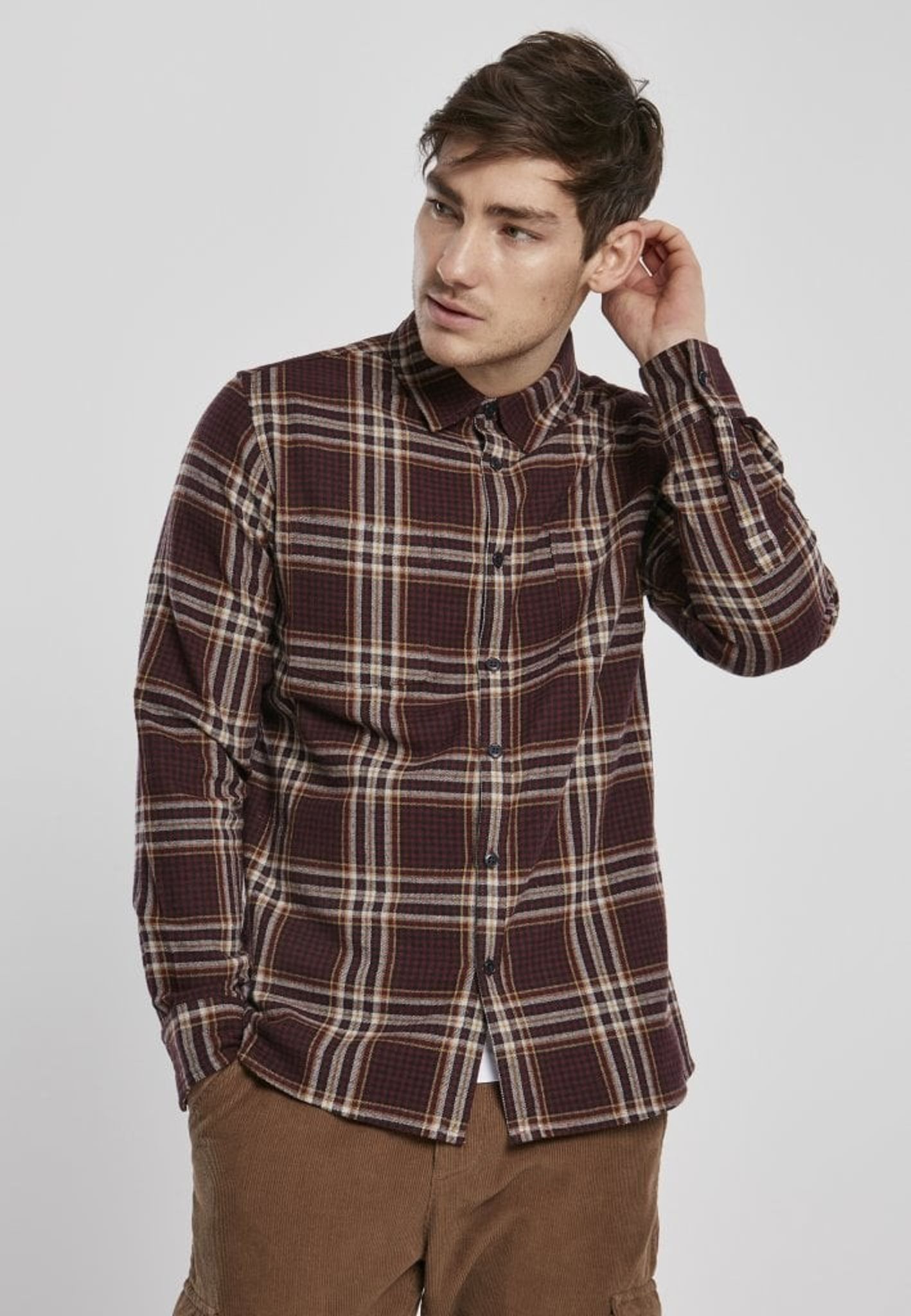 En rutig skjorta i två färgställningar, körsbär/honung och mörkblå/orange/vit.
