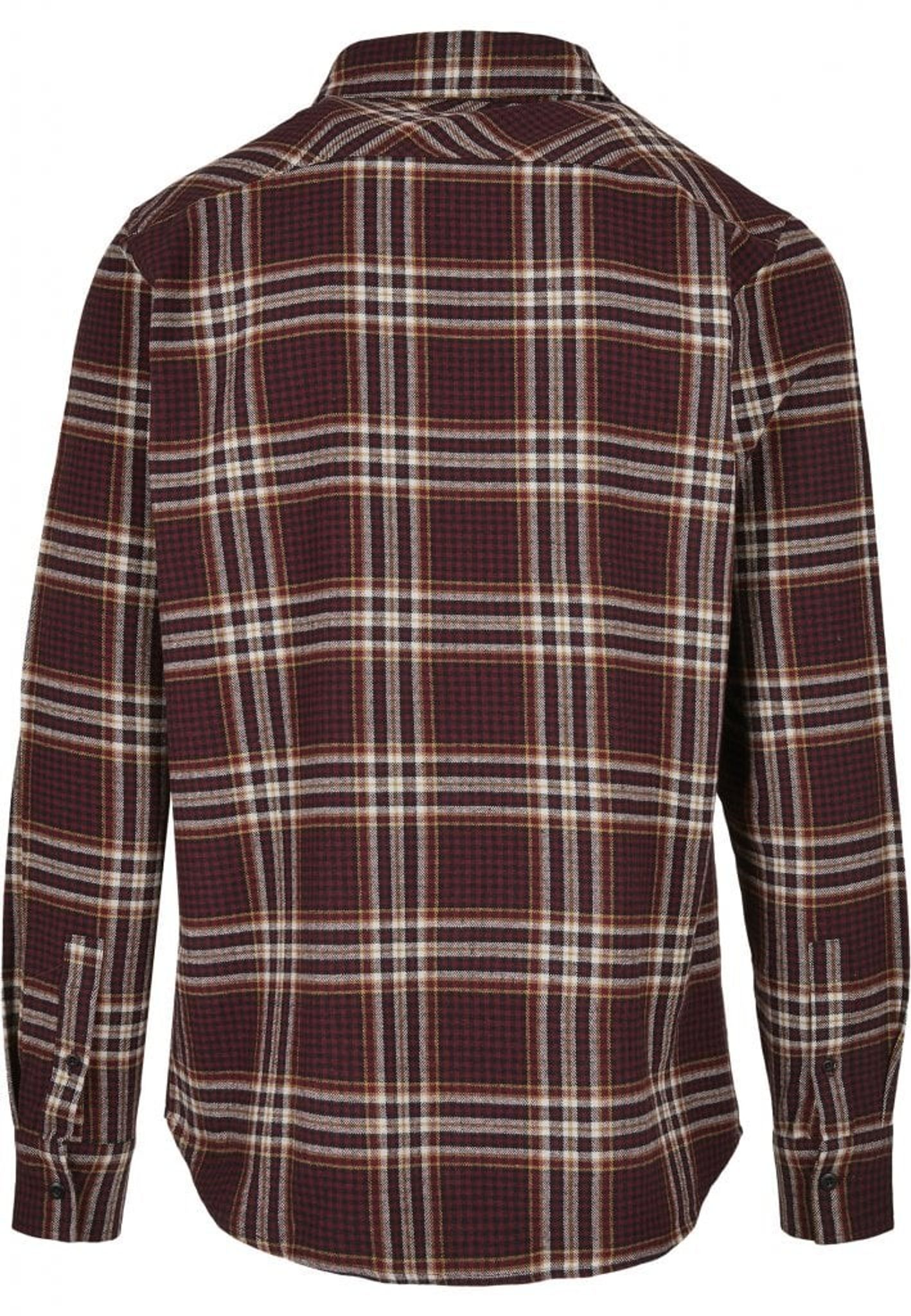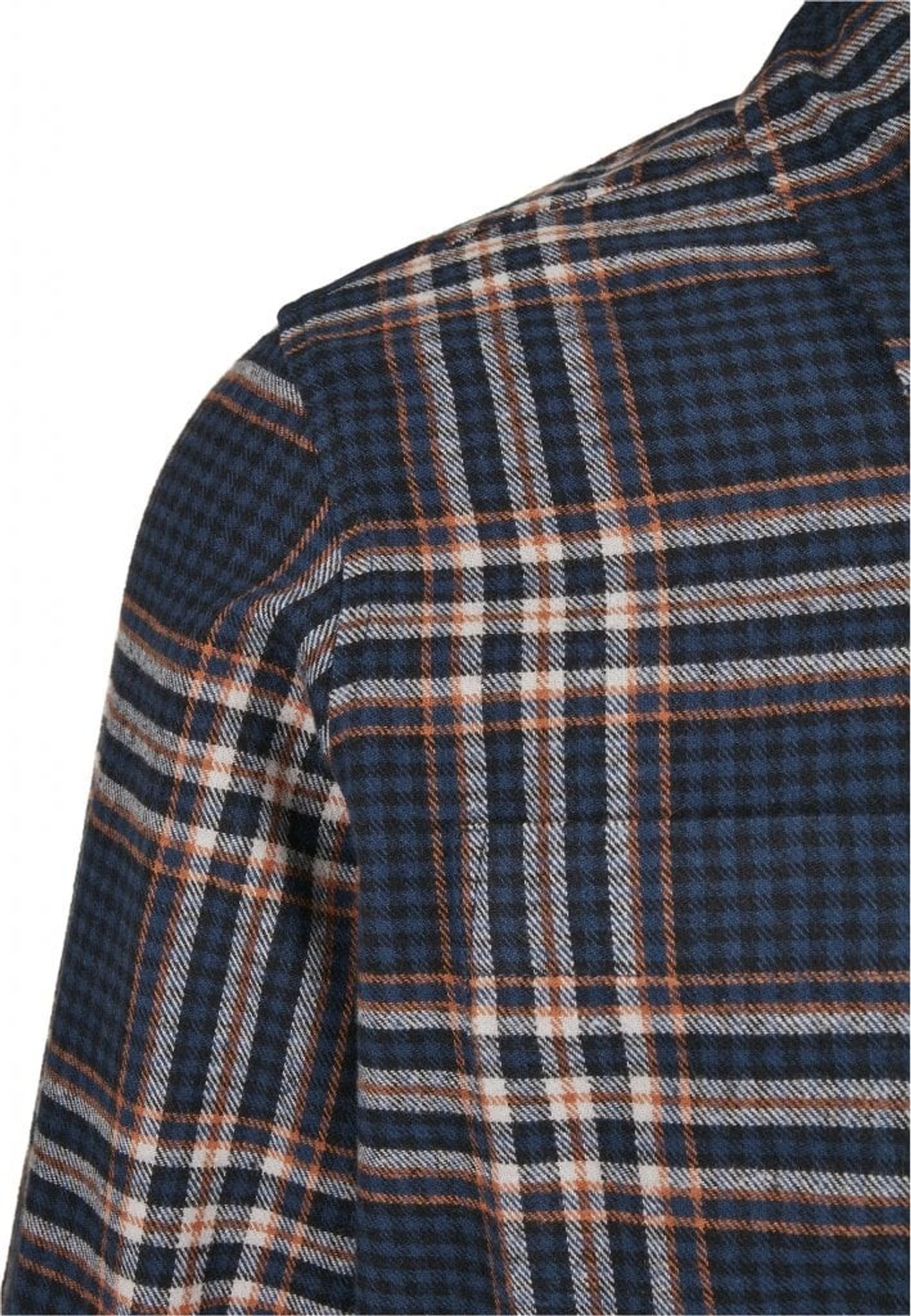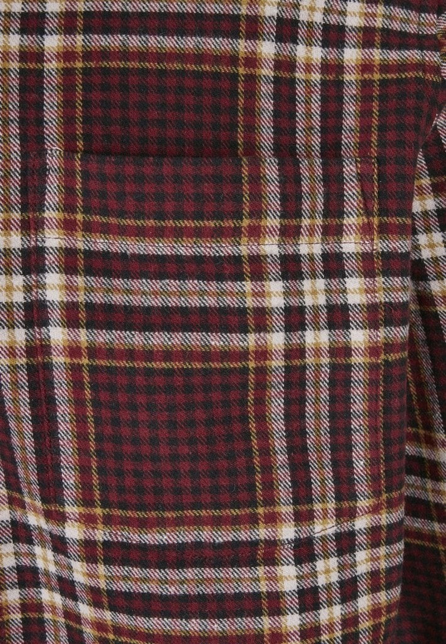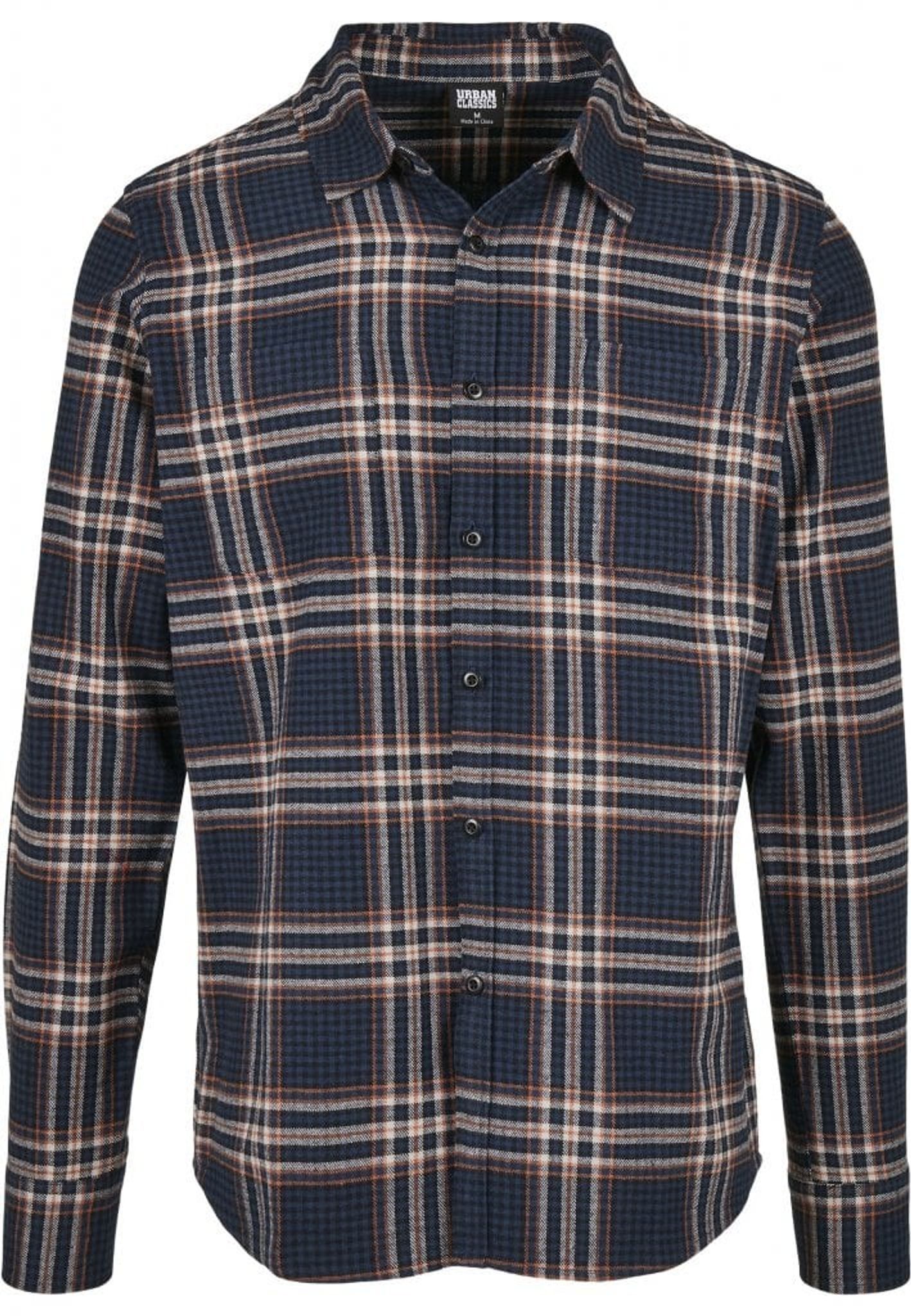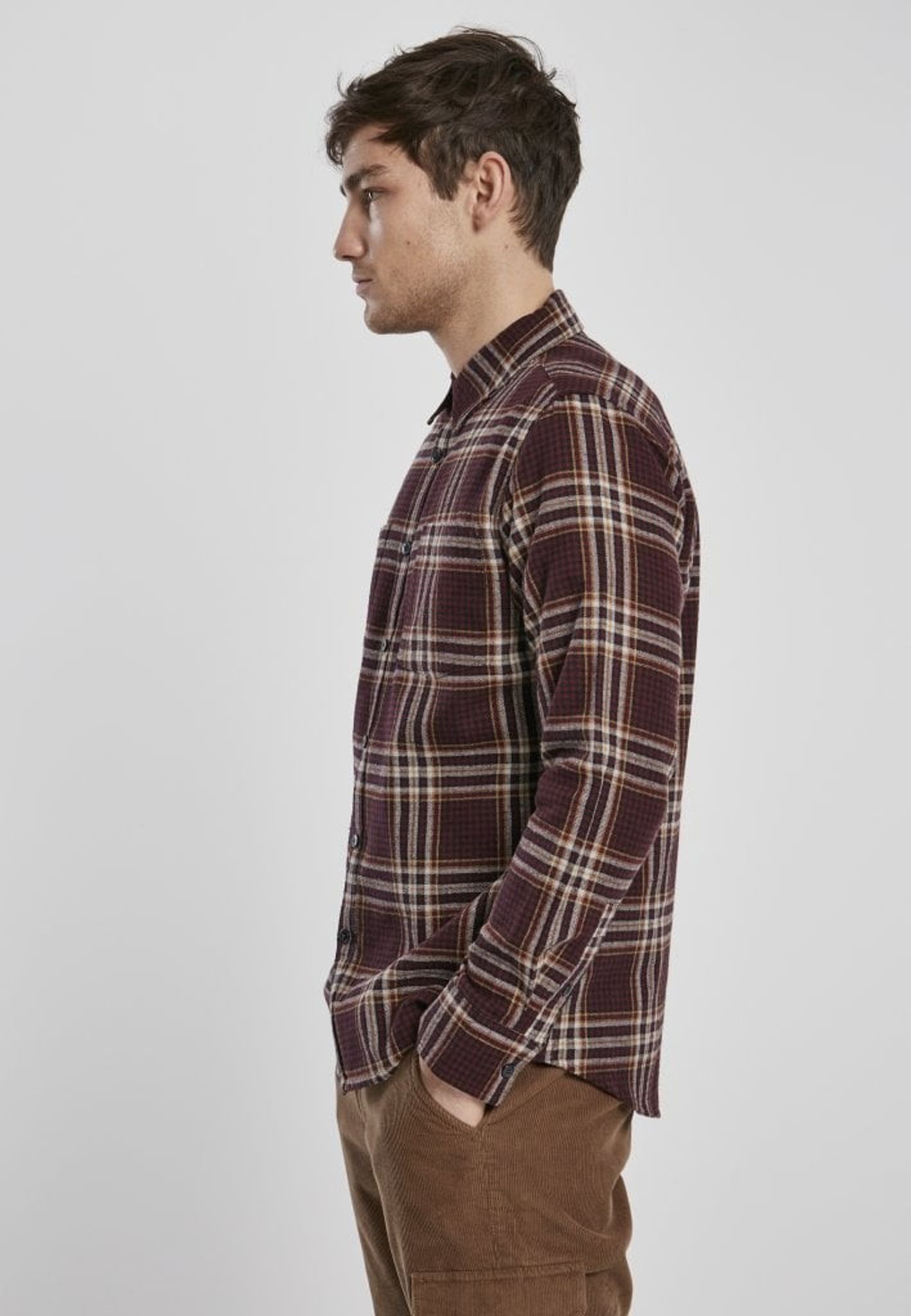 En rutig skjorta i två färgställningar, körsbär/honung och mörkblå/orange/vit.
