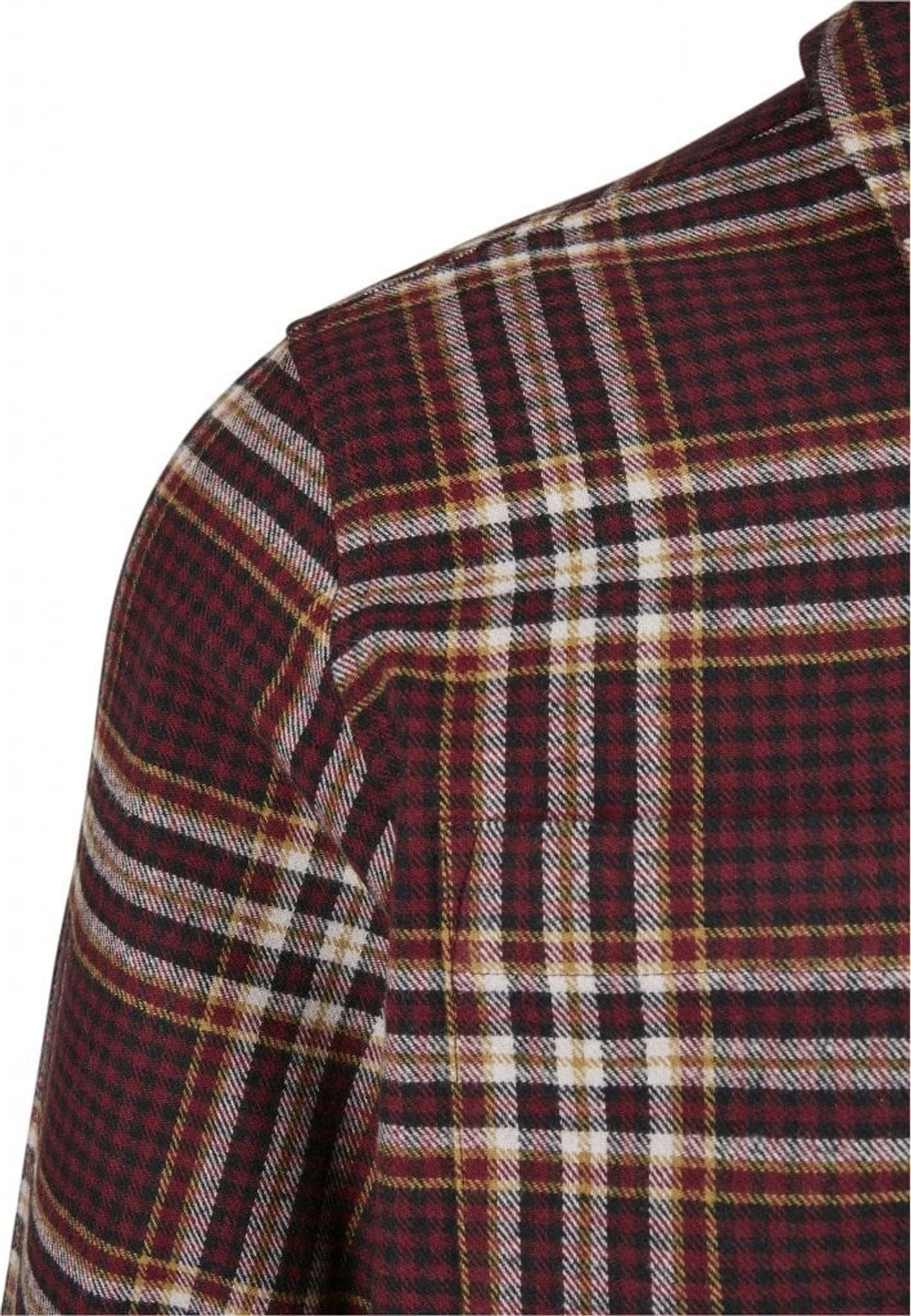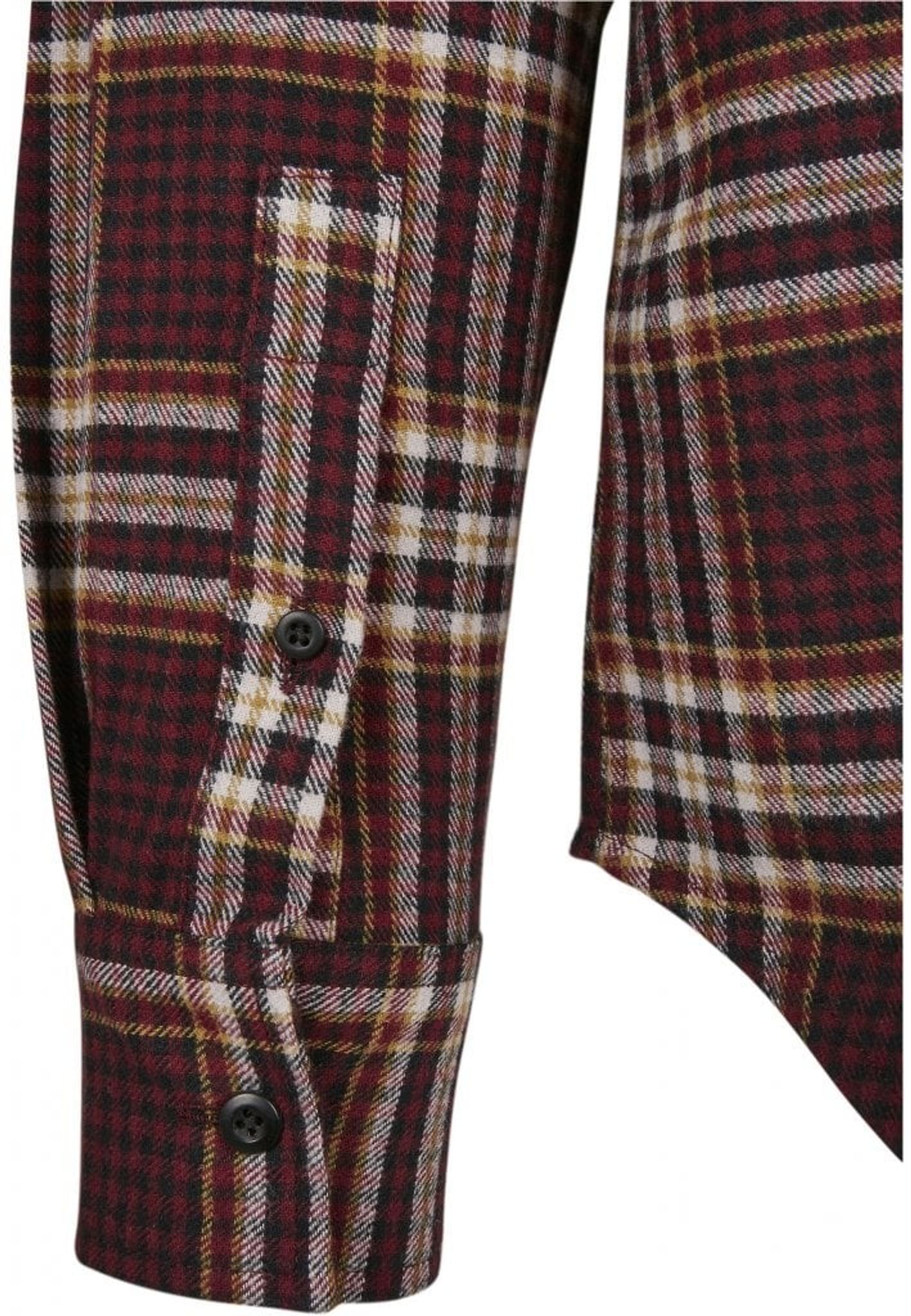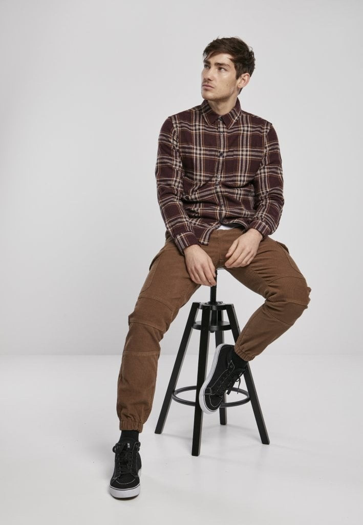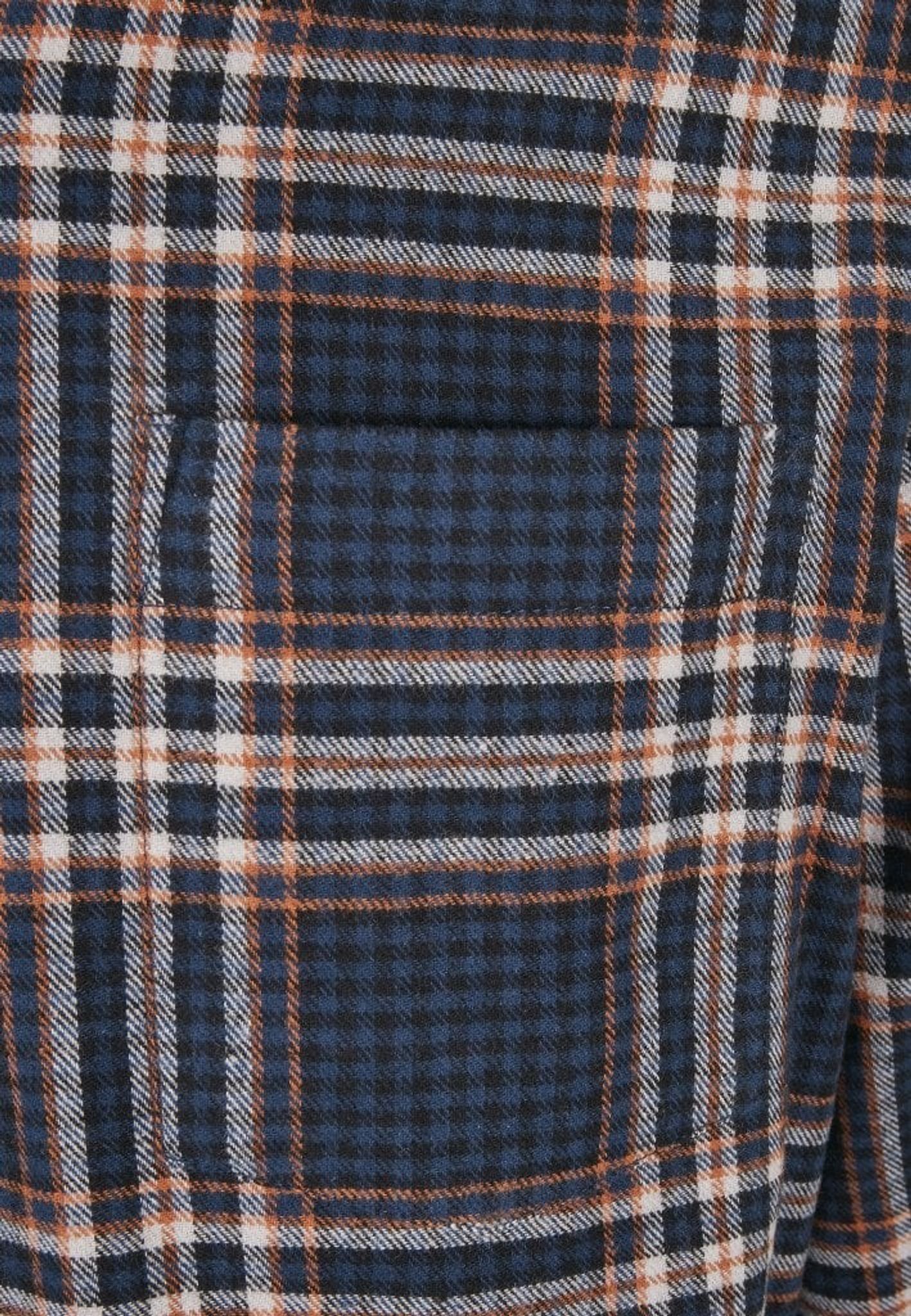 En rutig skjorta i två färgställningar, körsbär/honung och mörkblå/orange/vit.